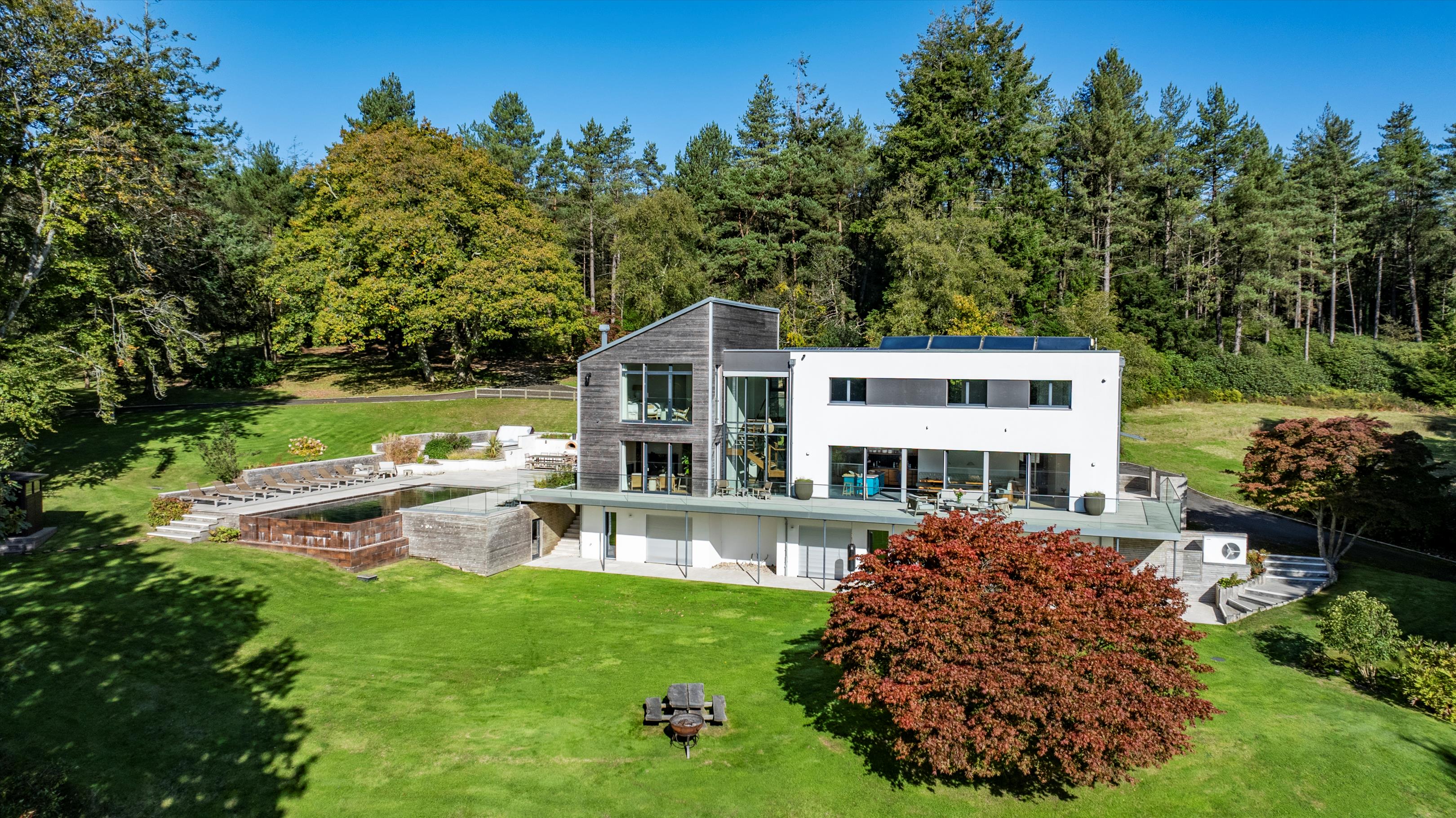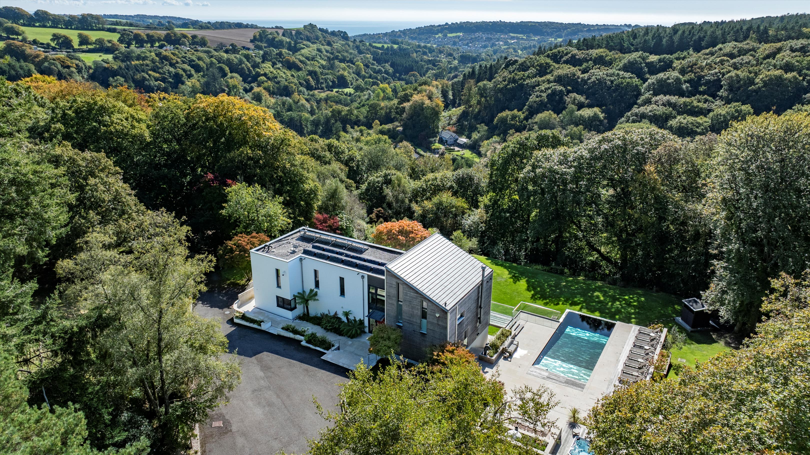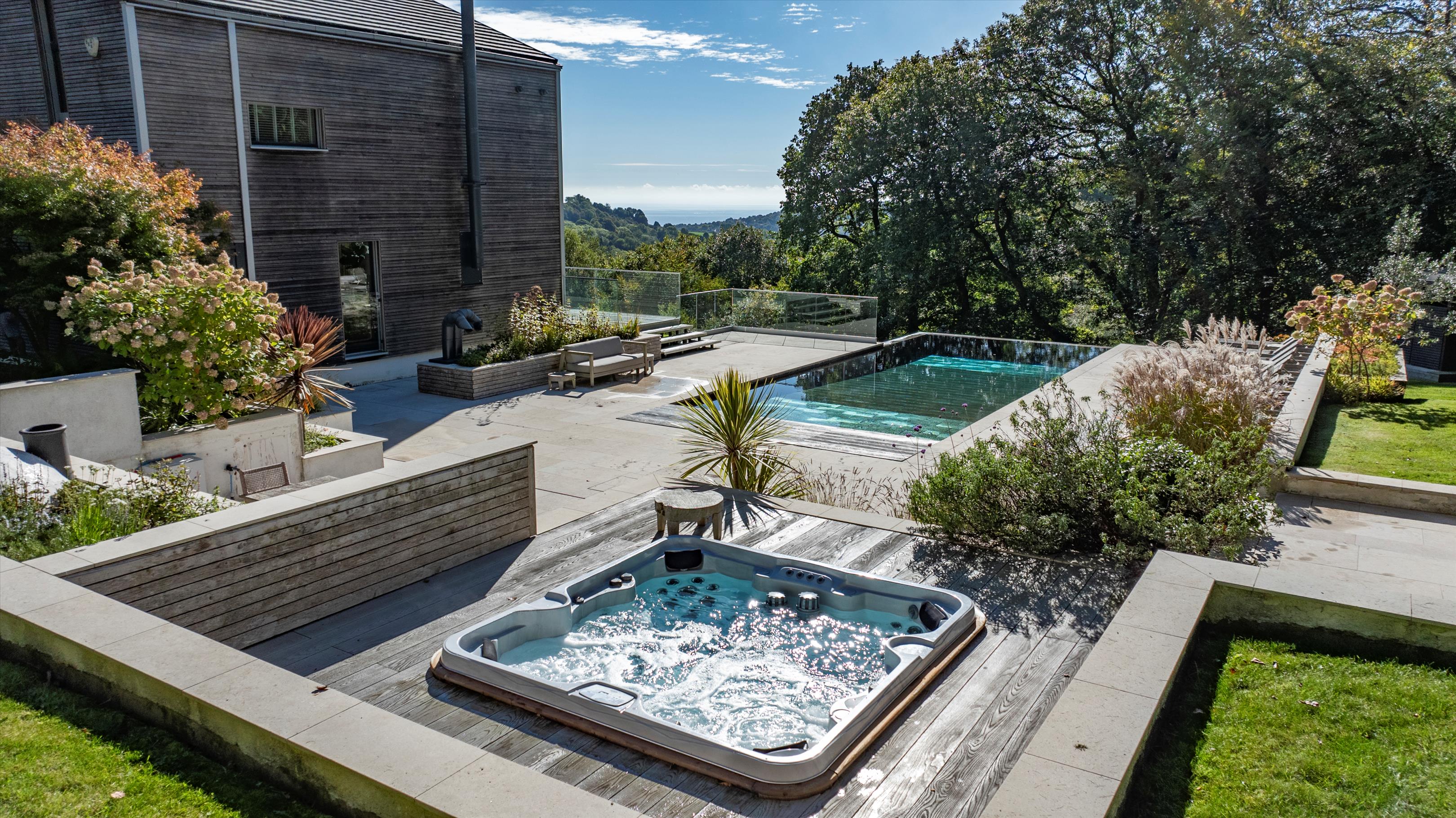 Approached via two driveways linking to Trinity Hill Road, Uplyme and Lyme Regis, the property sits in a wide, gently sloping clearing with sweeping lawns on three sides. An impressive infinity pool, hot tub and extensive west-facing terrace offer sheltered outdoor living, protected from prevailing winds by the surrounding woodland. A separate spur off the main drive leads to a discreet triple garage block.