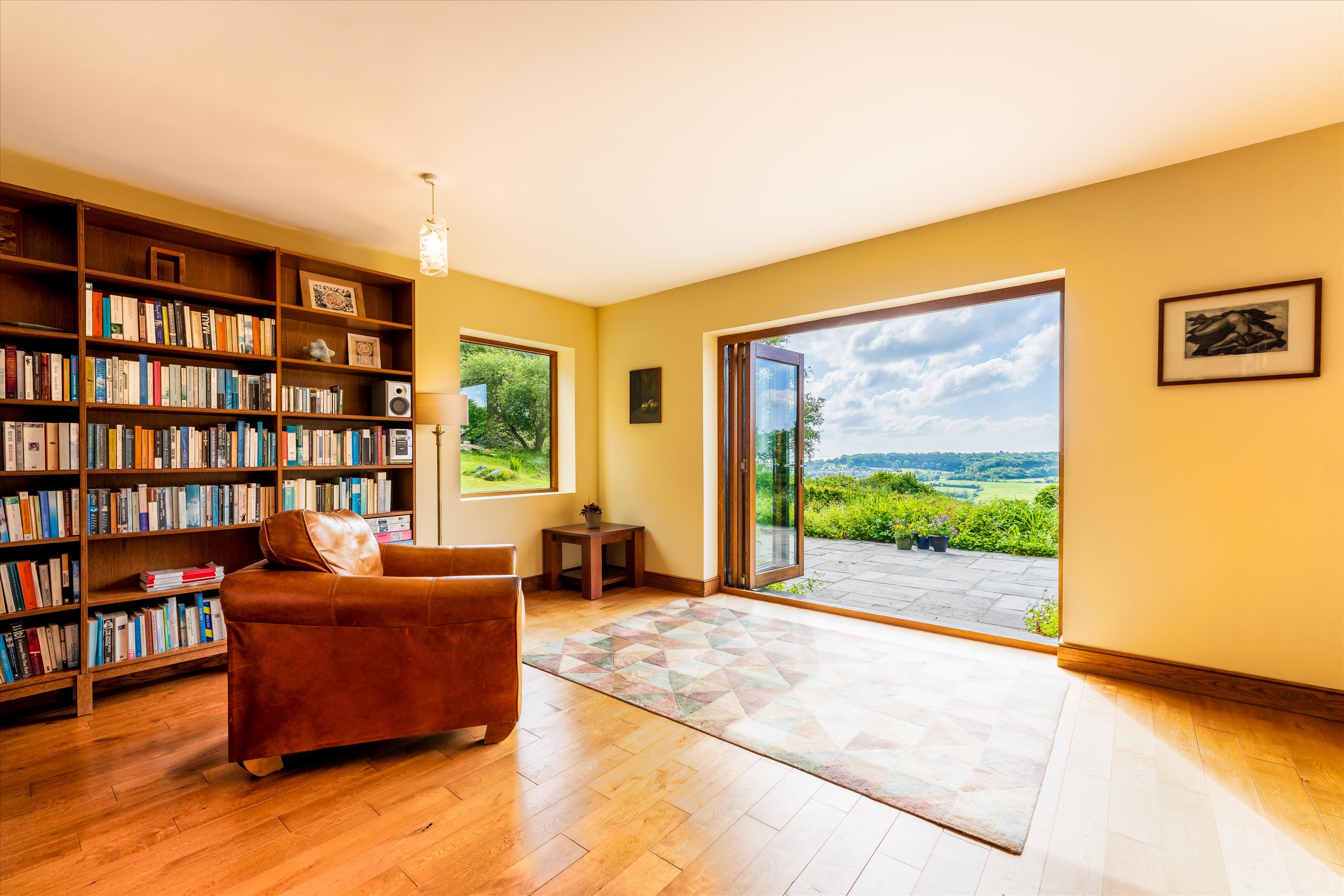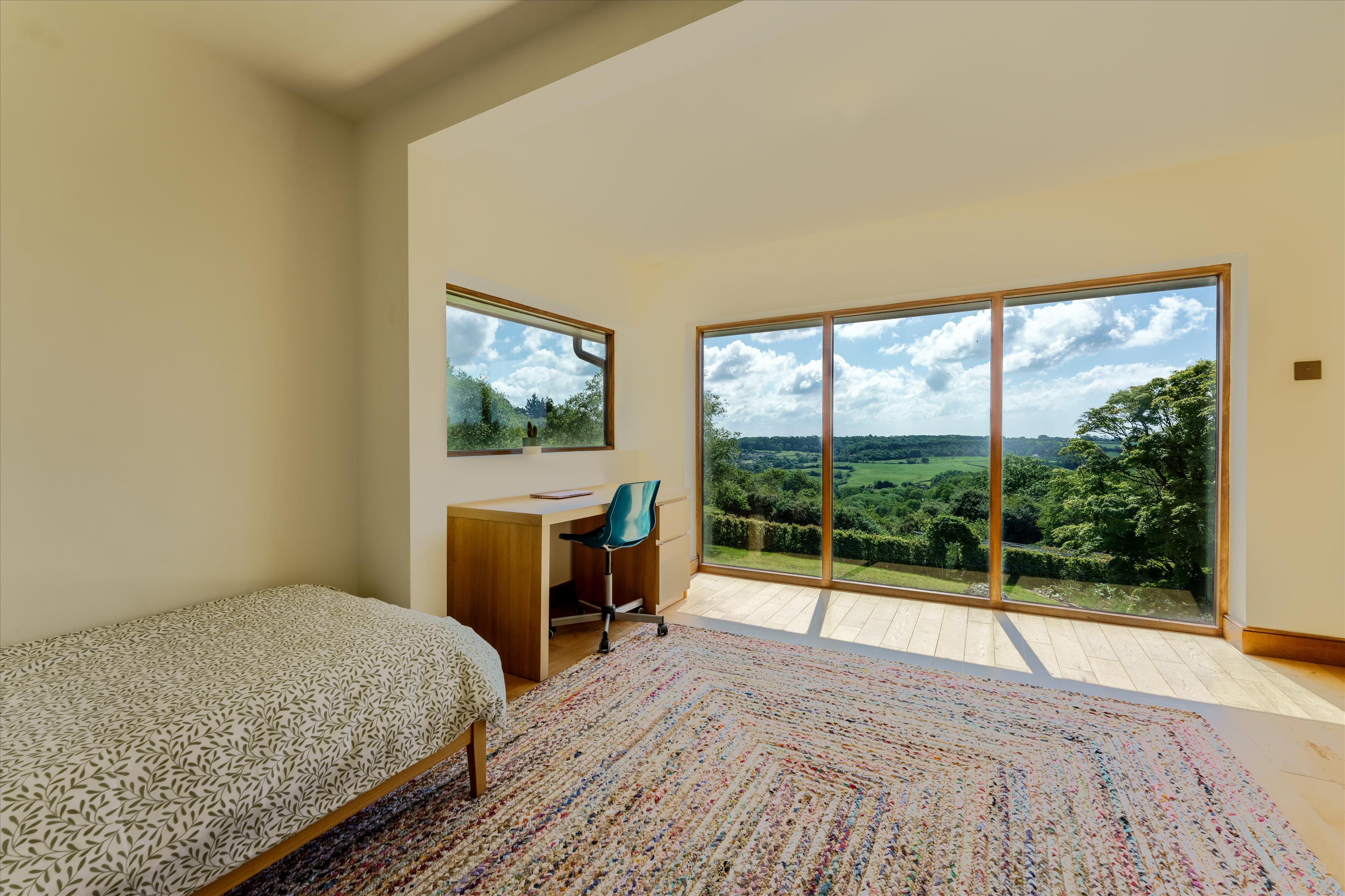 It has been the much-loved home of the current owners for the past 20 years and has clearly been updated over time and well looked after, both inside and out. The interior has a contemporary feel with plentiful warm, honey-coloured solid oak flooring, doors and other joinery. Downstairs the house has a large and welcoming reception hall leading to two main reception rooms and the large kitchen/dining room, all of which have wonderful, far-reaching views plus bi-fold doors/French windows that open onto the paved terrace wrapped around three sides of the house. The kitchen is south and west facing and fully fitted with contemporary, oak-fronted units and a gas/electric range cooker and has a good-sized dining area at one end. A further single storey wing off the northwest corner incorporates a good-sized games room, study, utility room and boot room.