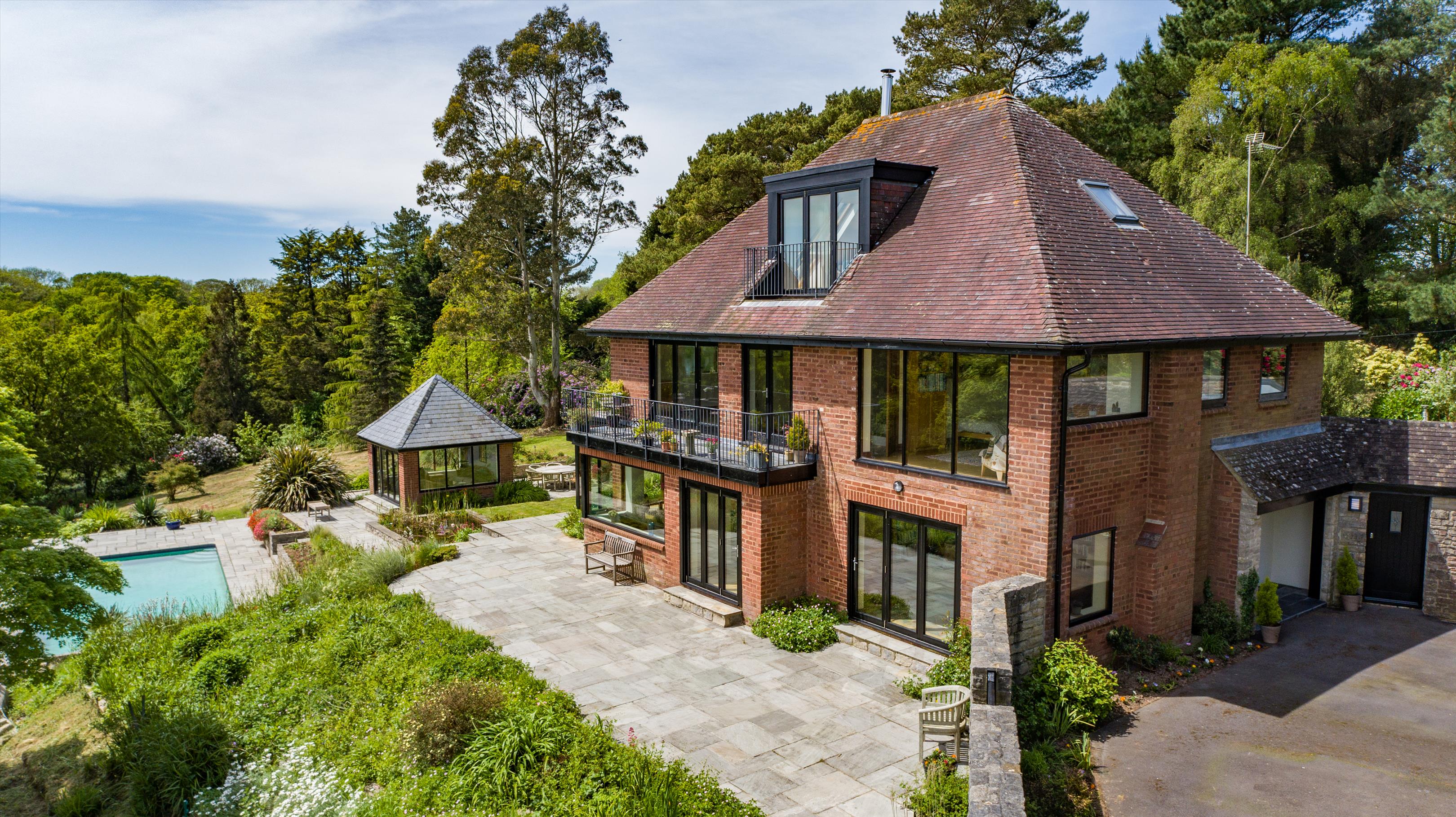The parking area is screened by a tall Purbeck stone wall, beyond which lies the formal part of the garden, consisting of a series of lawns and landscaped borders surrounding a lovely, heated swimming pool. Set back from the pool is a fantastic, brick-built summer house with tall, wide picture windows on two sides and bi-fold doors on a third.