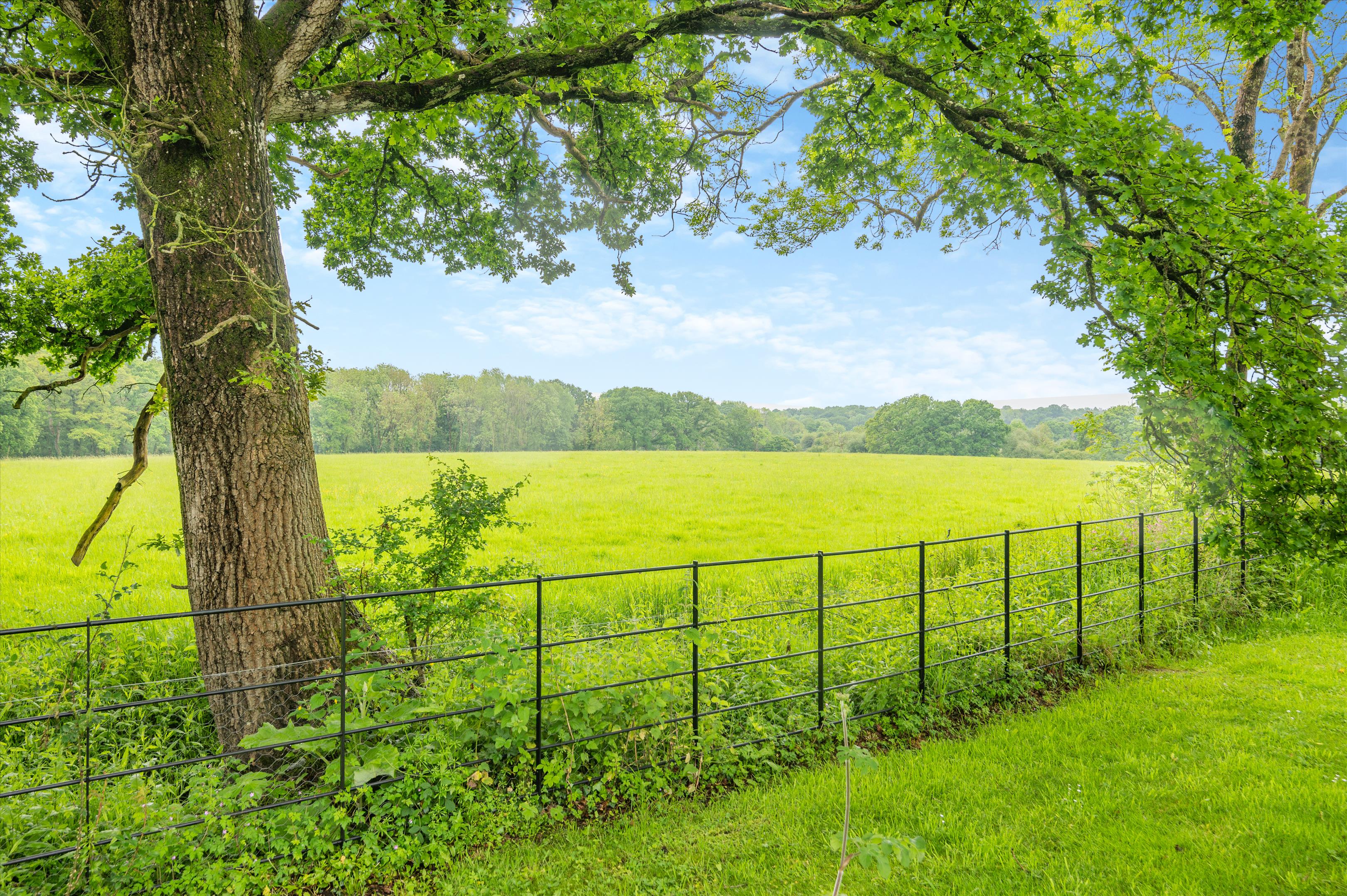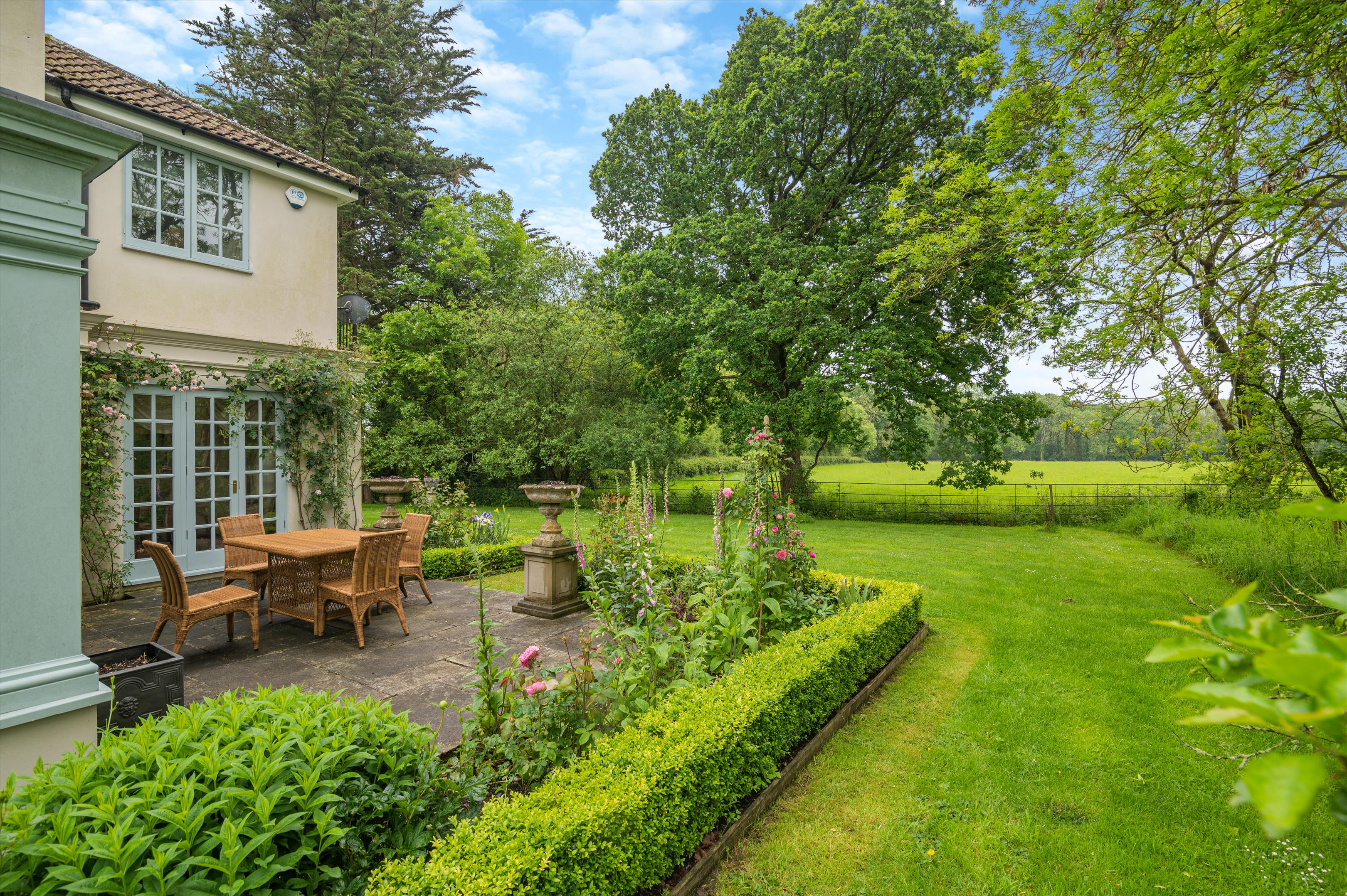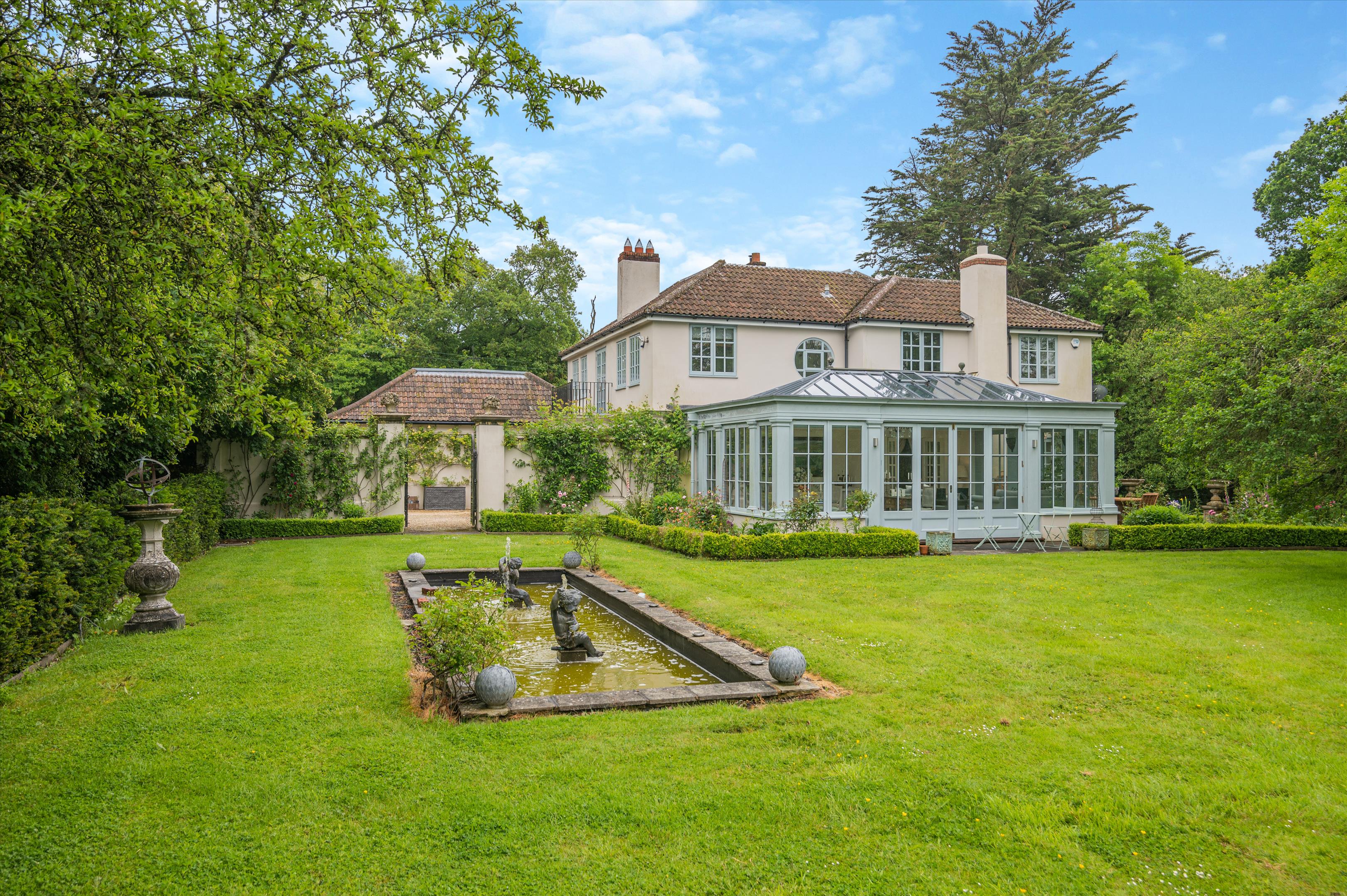 It is always a good sign when the approach lane to a house has the odd weed growing in the middle of it as it signifies minimal traffic. Ryeclose House has a truly enviable setting surrounded by the sound of birdsong and beautiful, lush countryside and sits within about 14.6 acres of its own land. It started life as a much smaller cottage built in 1922 and was then transformed about seven years ago, when it was extended and completely refurbished to a very high standard. The exterior of the house is covered with painted render with timber-framed, integrally double glazed windows and a clay tile roof. The refurbishment included adding a superb orangery onto the back of the house overlooking the garden and redesigning the interior with a new, centrally positioned hall that opens onto a beautiful courtyard parking area. The house has generously sized rooms with excellent ceiling height throughout and is very well presented. In addition to the orangery, which serves as family sitting and dining room, the ground floor has two further reception rooms: a study and a gorgeous drawing room with oak flooring, open fireplace, and windows on two sides with lovely views of the garden and surrounding countryside with French windows to both the garden and orangery. The kitchen also connects directly with the orangery and looks through it to the garden as well as out to the courtyard with its rose-covered walls. It has space for a central island and is fitted with a range of contemporary-style units plus a Miele induction hob. Upstairs off the galleried landing are a total of four bedrooms. The principal bedroom is above the drawing room and shares the same lovely views over the garden and land and has an ensuite wet room and balcony. Two further bedrooms have their own ensuite bath/shower room, whilst the fourth bedroom has almost exclusive use of the adjacent family bathroom.