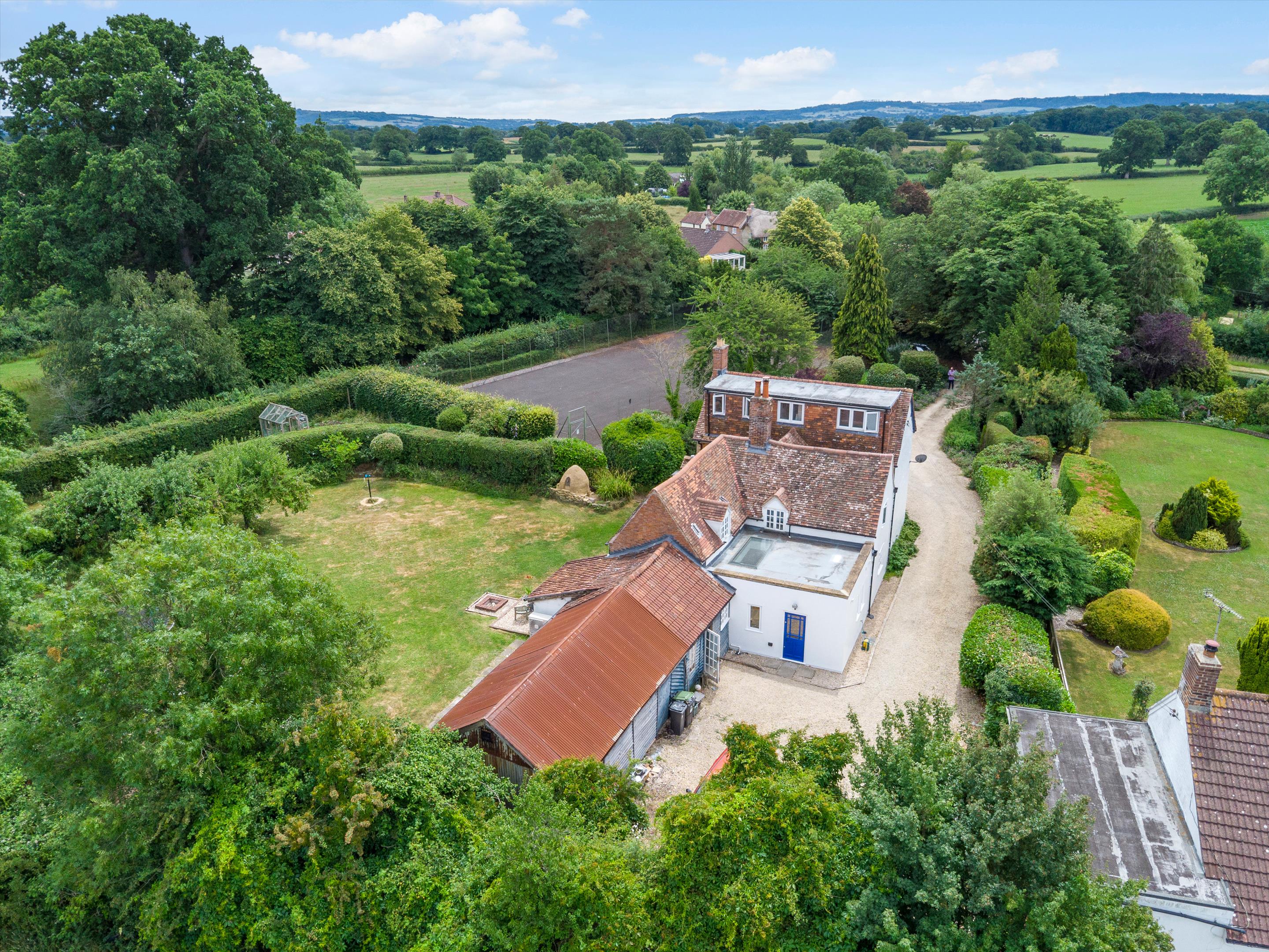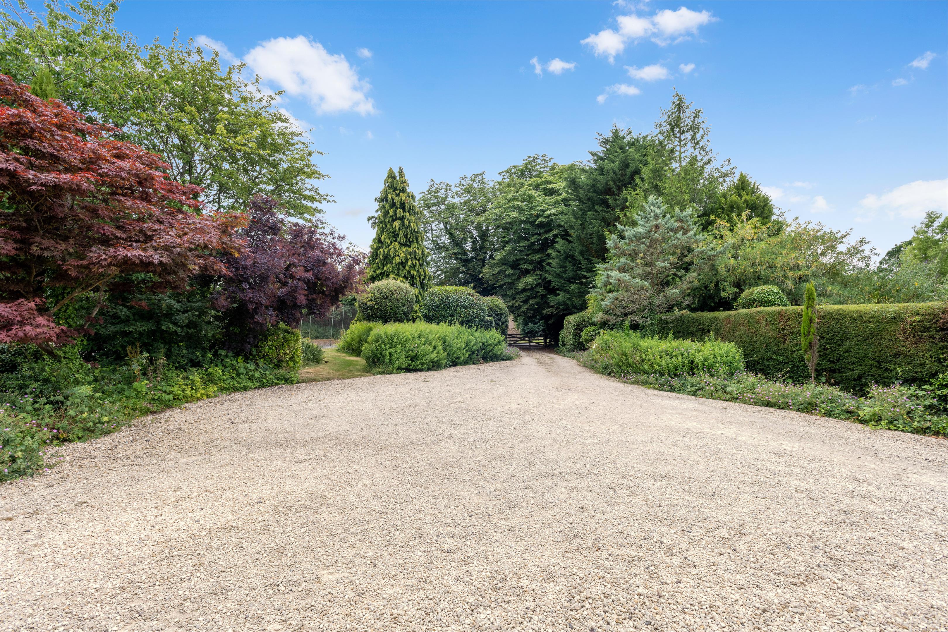 The property is approached via a gravelled driveway that opens out into a good-sized parking area immediately in front of the house. It then continues along one side of the house and emerges to a further parking area behind. On one side of it is an attached outbuilding with through access to the garden and incorporating a garden store, machinery store/workshop plus two further store rooms. The rest of the garden and grounds extend out on the other side of house and attached outbuilding. The garden and grounds around the house encompass a level lawn fringed by two areas of decking, one of which is beside a small lily pond, several fruit trees, a further brick-built garden store and a grassed area with a greenhouse bound by tall, mature hedging for shelter that was formerly a kitchen garden. Between the garden and the front parking area is a hard tennis court that has been resurfaced with tarmac to provide an enclosed, hard surface play area but would need to be resurfaced again with an appropriate material if required for its original purpose. The current owners were considering converting this to an all-weather manège. Beyond the garden is a level paddock of about two acres bound by stock proof fencing. Beside it is a small pole barn incorporating two further lean-to stores, one of which currently serves as a log store.