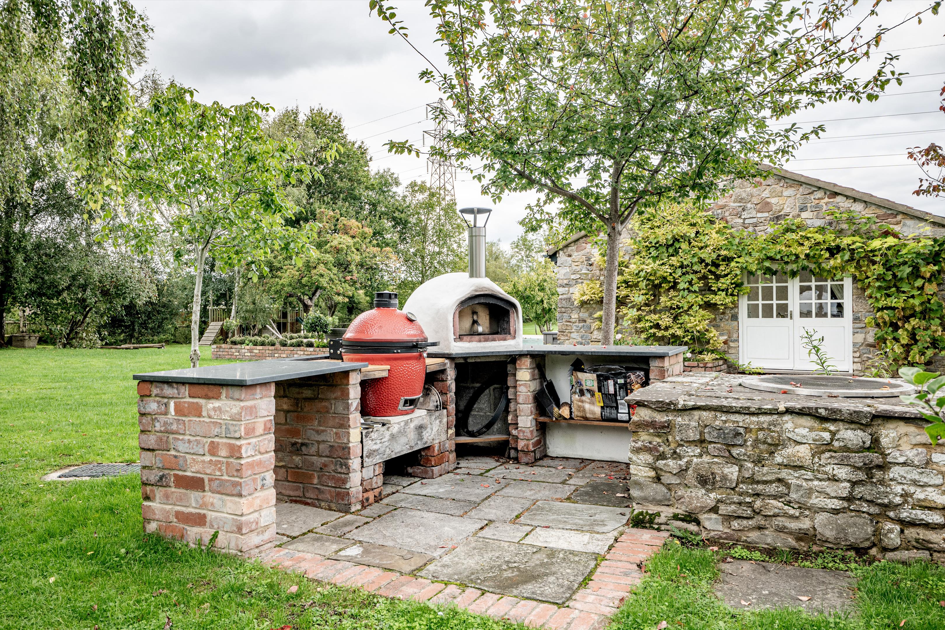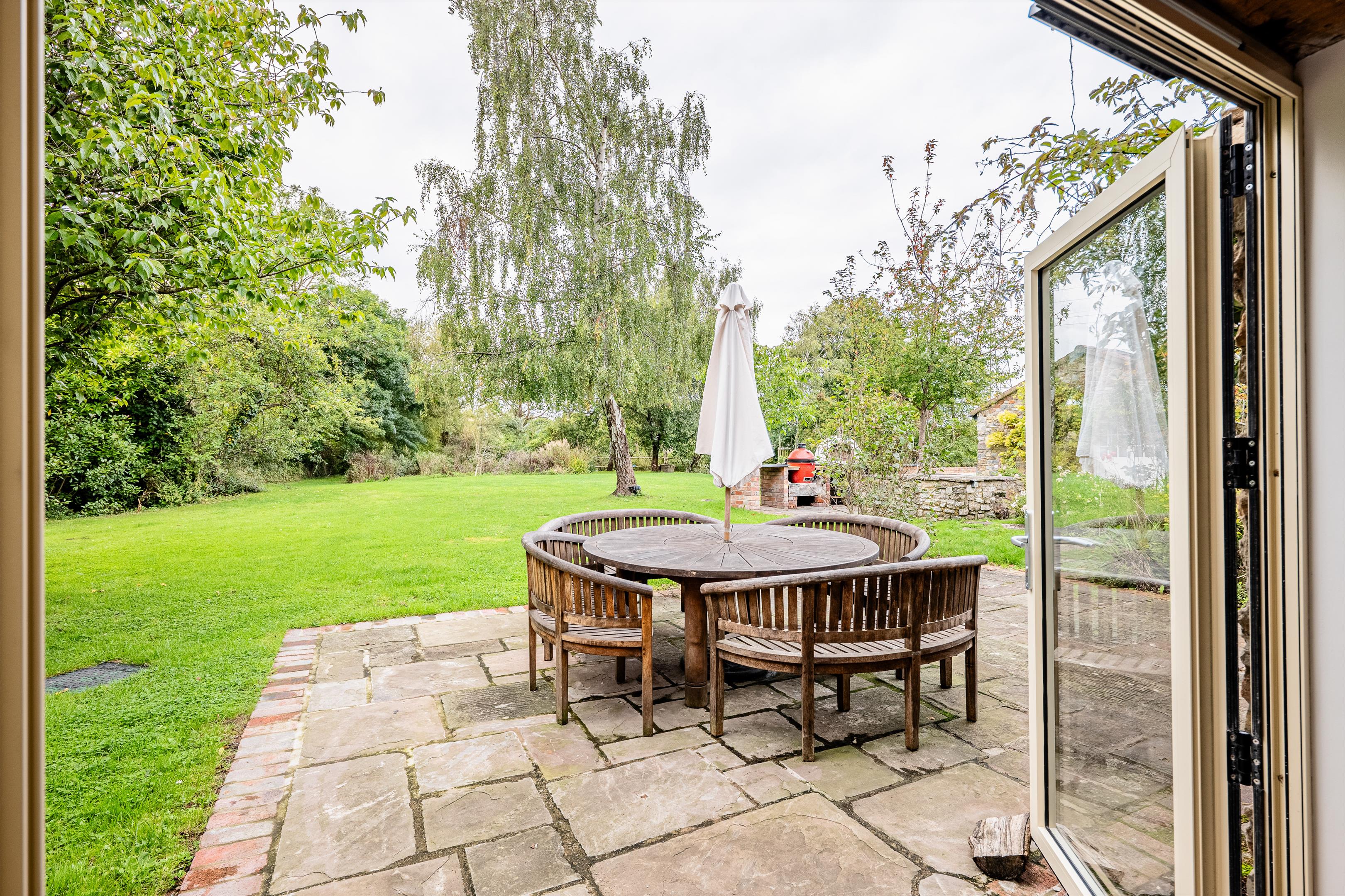 The rear gardens face west with a south aspect. Immediately at the rear is a flagstone area and a further flagstone area with brick-built barbecue and pizza oven, all ideal for entertaining. Beyond, there is a lovely wide open outlook over the garden, which is laid principally to a large expanse of lawn interspersed with mature and ornamental trees which lead down to a mixed orchard of apple, pear and plum. There is a natural pond.