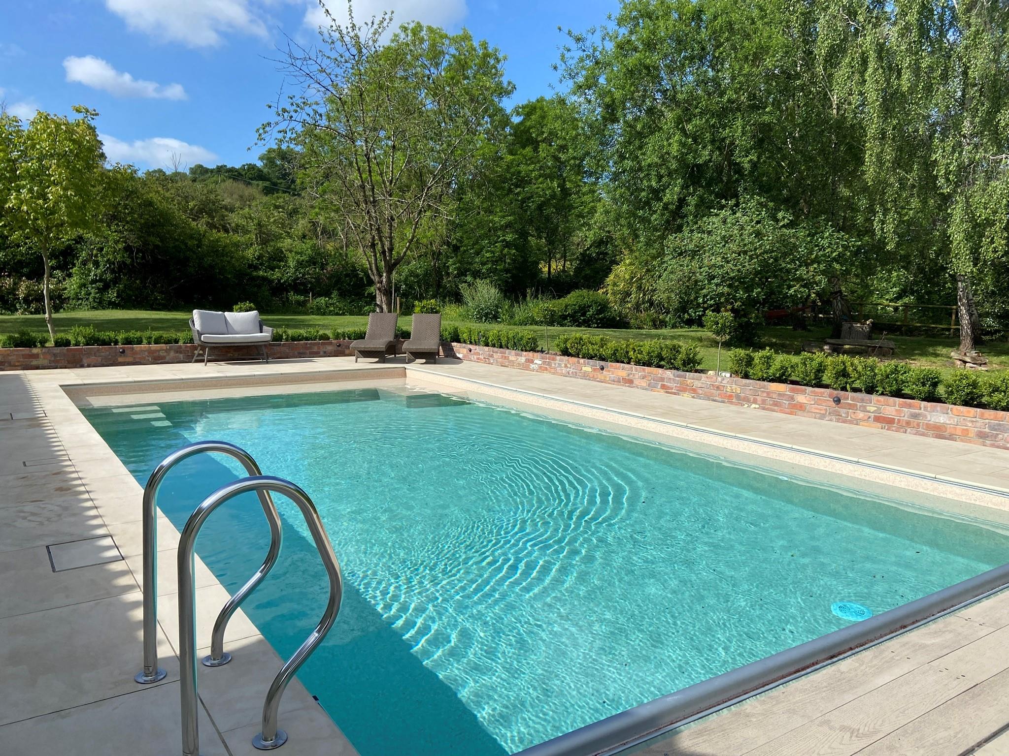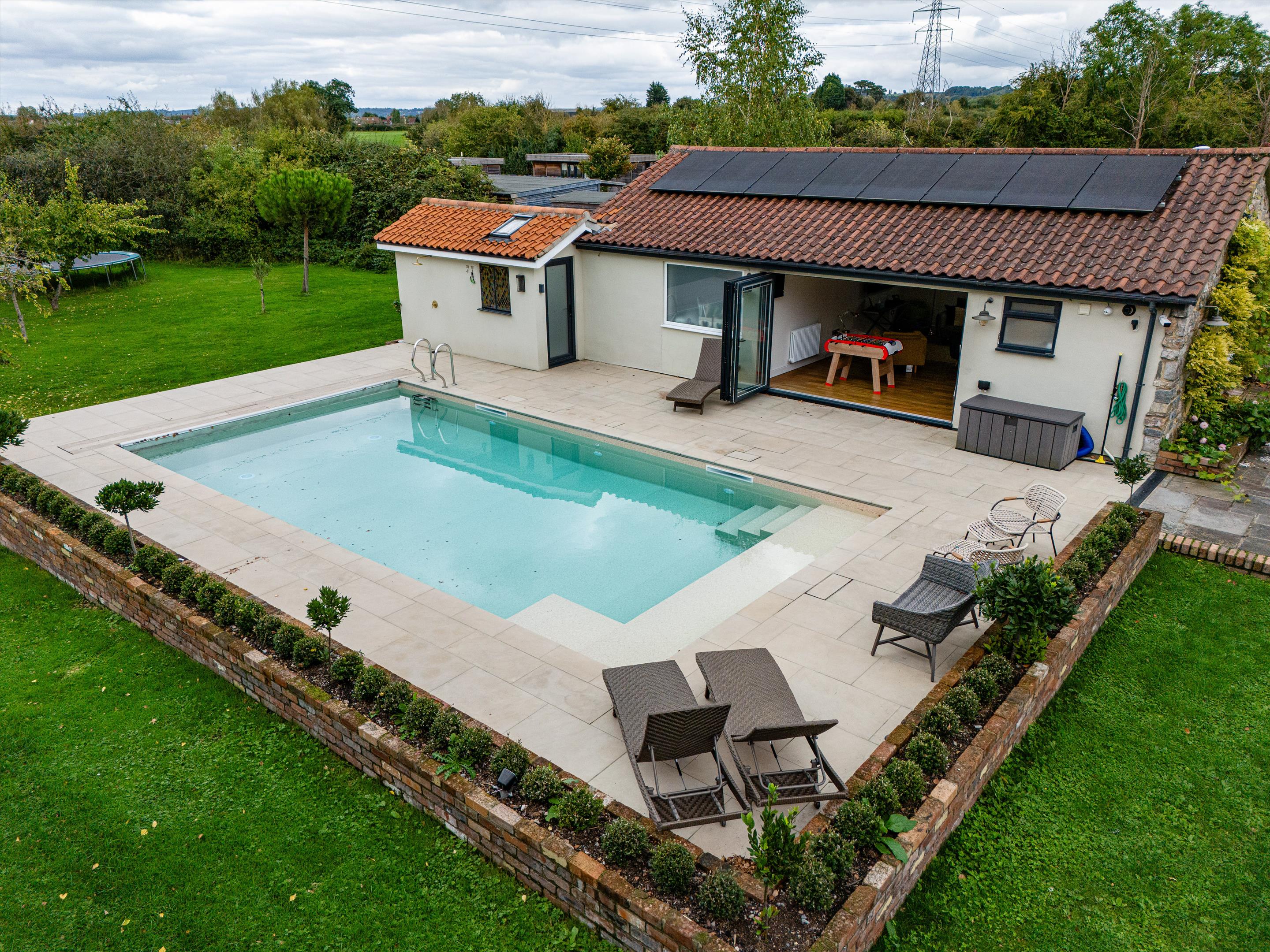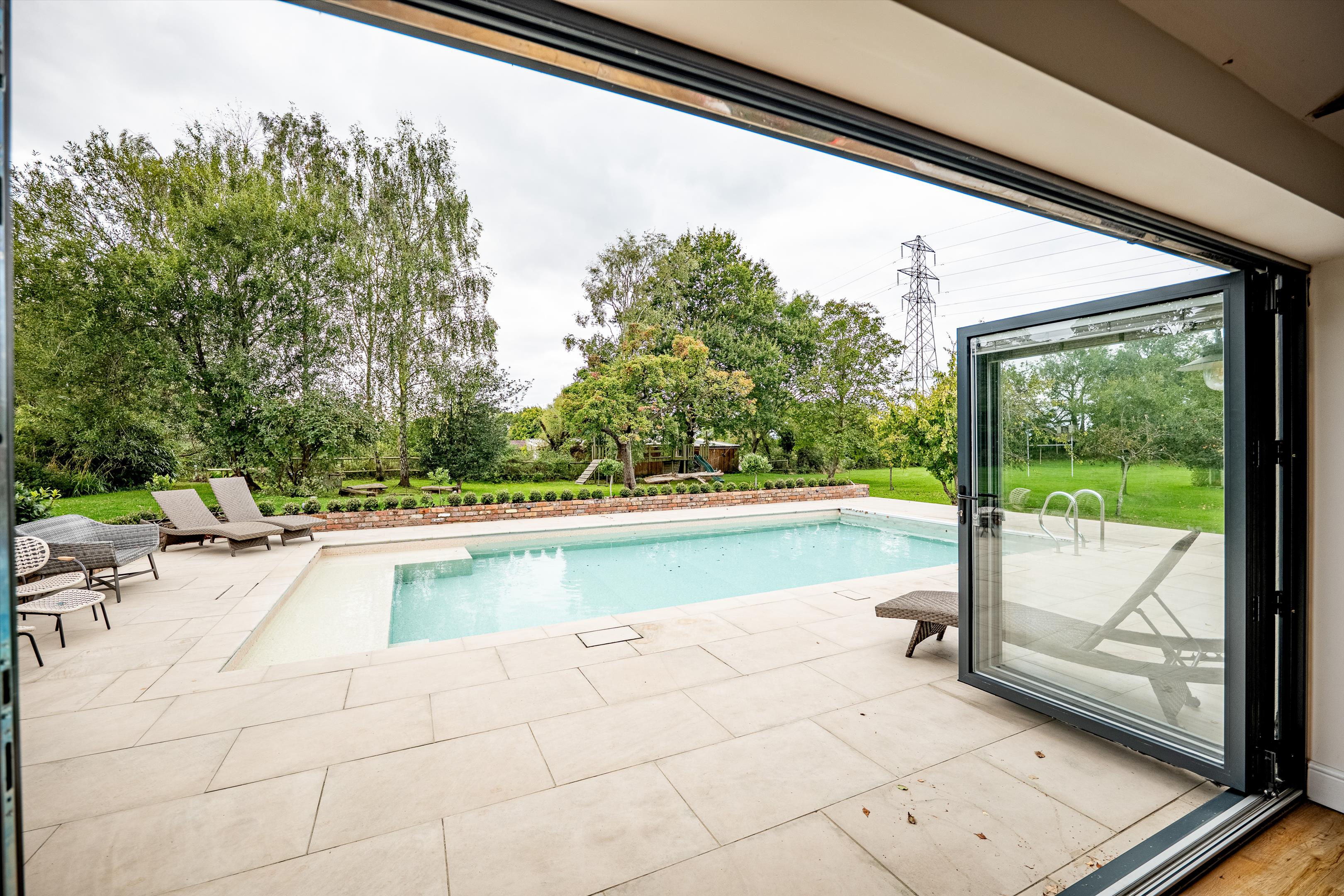 Lying adjacent to the office/garage block is the detached summer house overlooking the heated pool. The summer house is extremely well presented in an open plan contemporary style with vaulted ceiling and exposed roof trusses. It has a shower room, a fitted kitchen area with oven, hob, fridge and dishwasher, and bifold doors open to the paved surround of the swimming pool. Adjoining the summer house, at the rear, is a workshop/studio which would easily convert to a bedroom, subject to planning permission. An outside w.c./changing room, and boiler/ pump room with air source heat pump also adjoin.