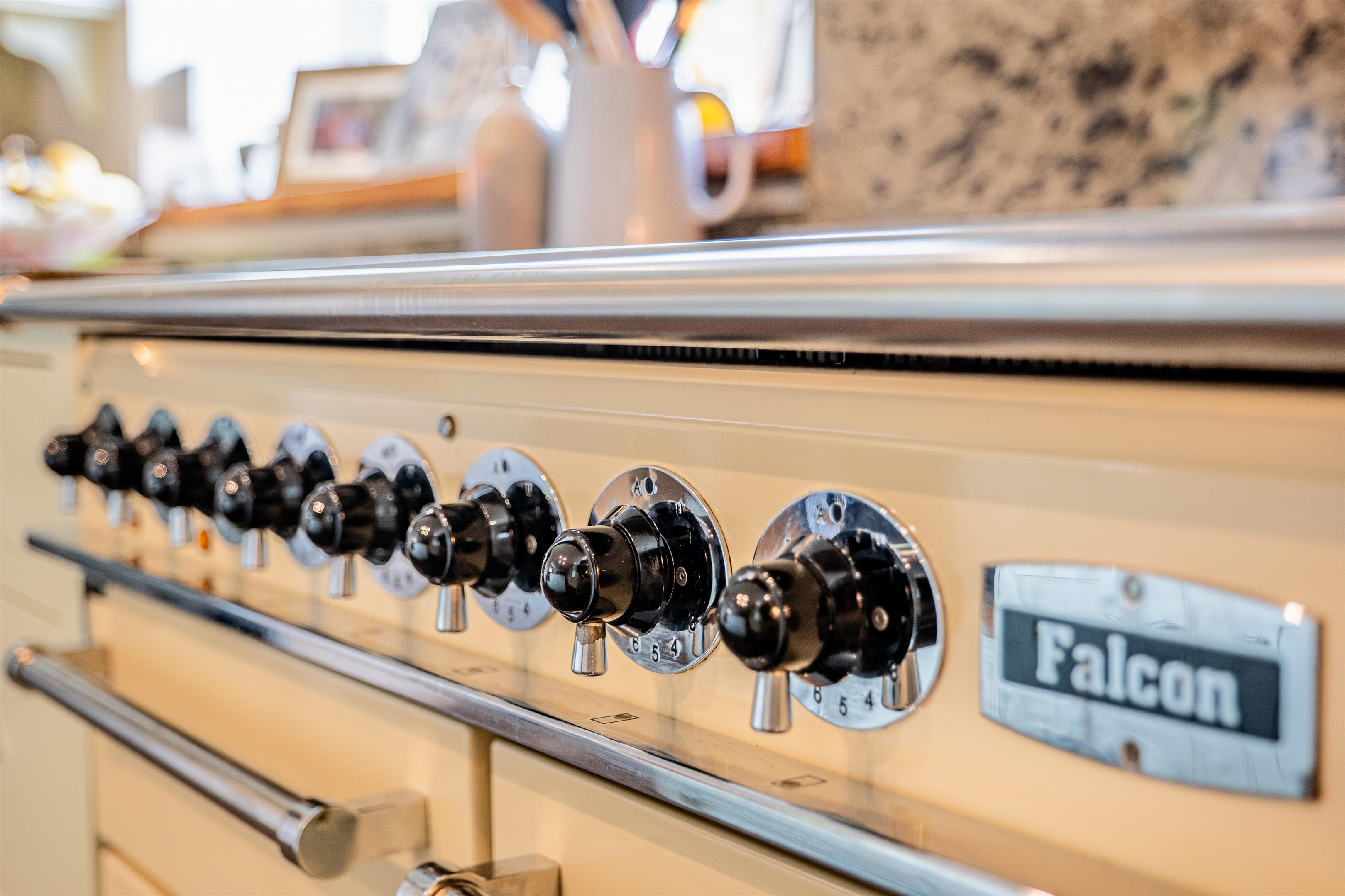 has an island unit with breakfast bar. Integral appliances include a Falcon range cooker, fridge/freezer and a washing machine. A separate dining area has French windows opening to the garden.