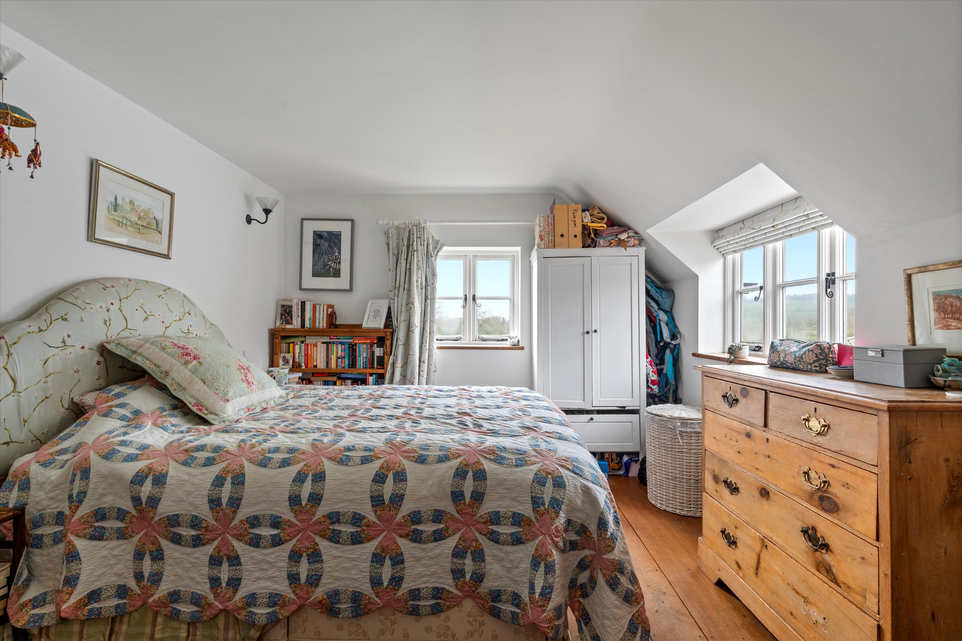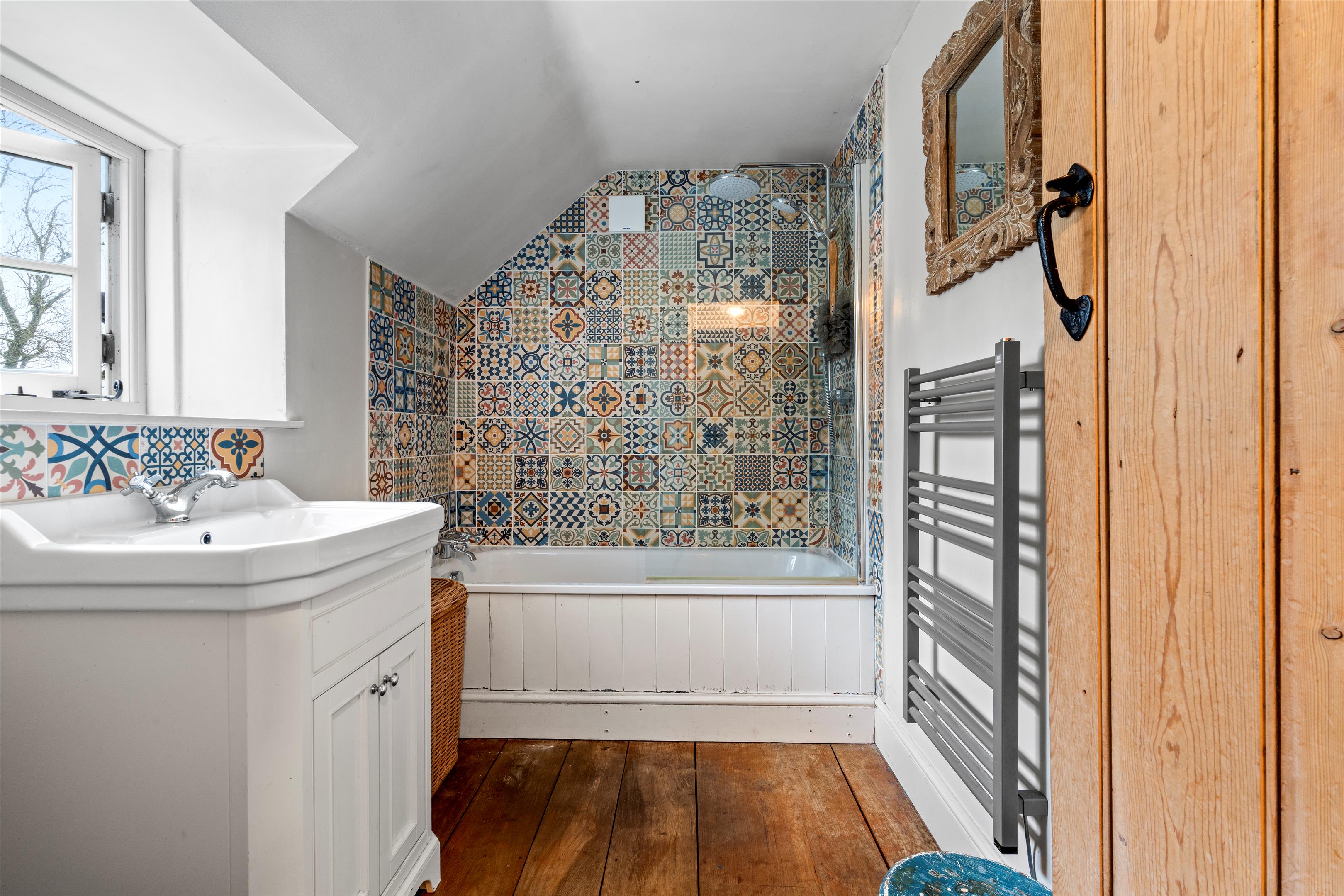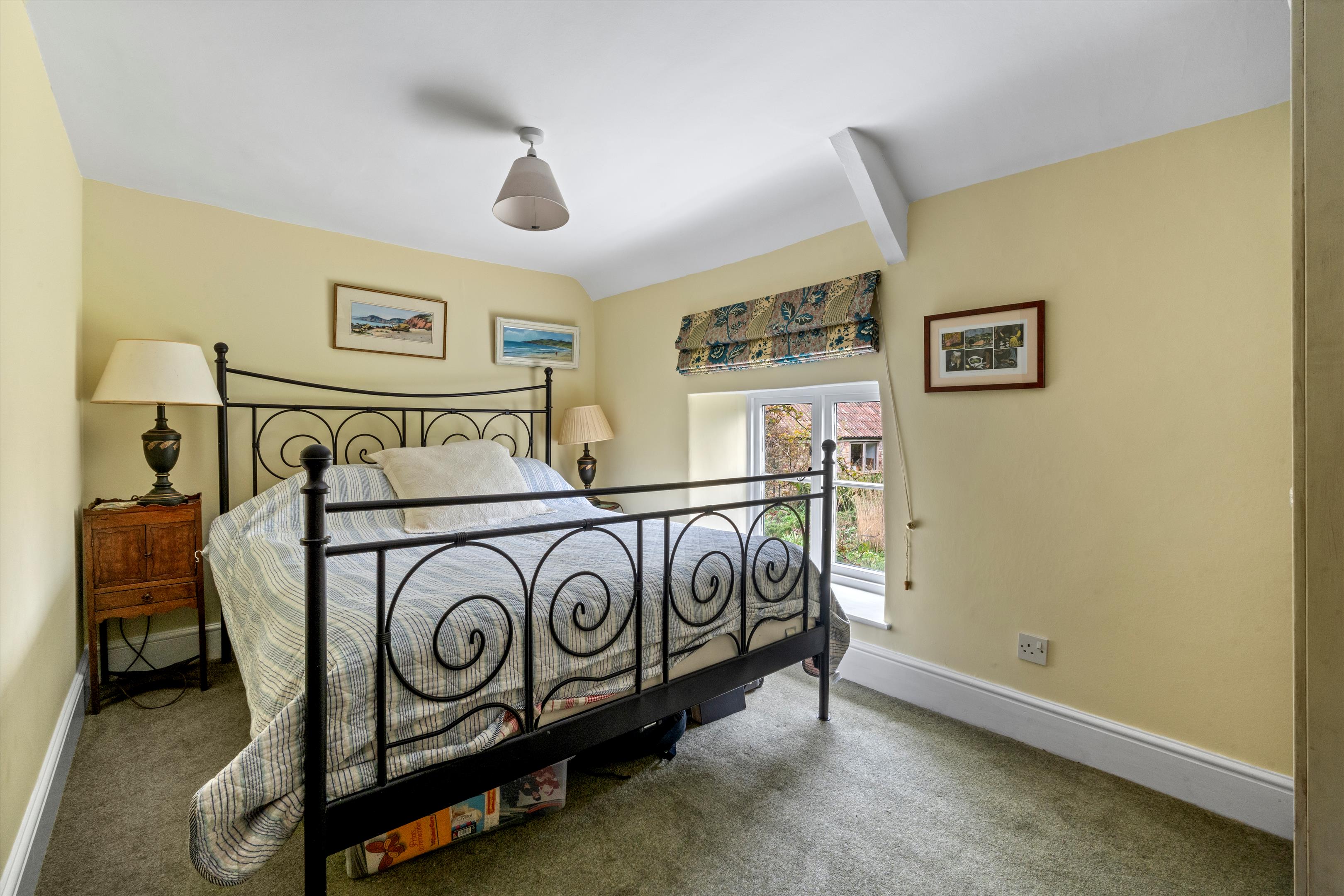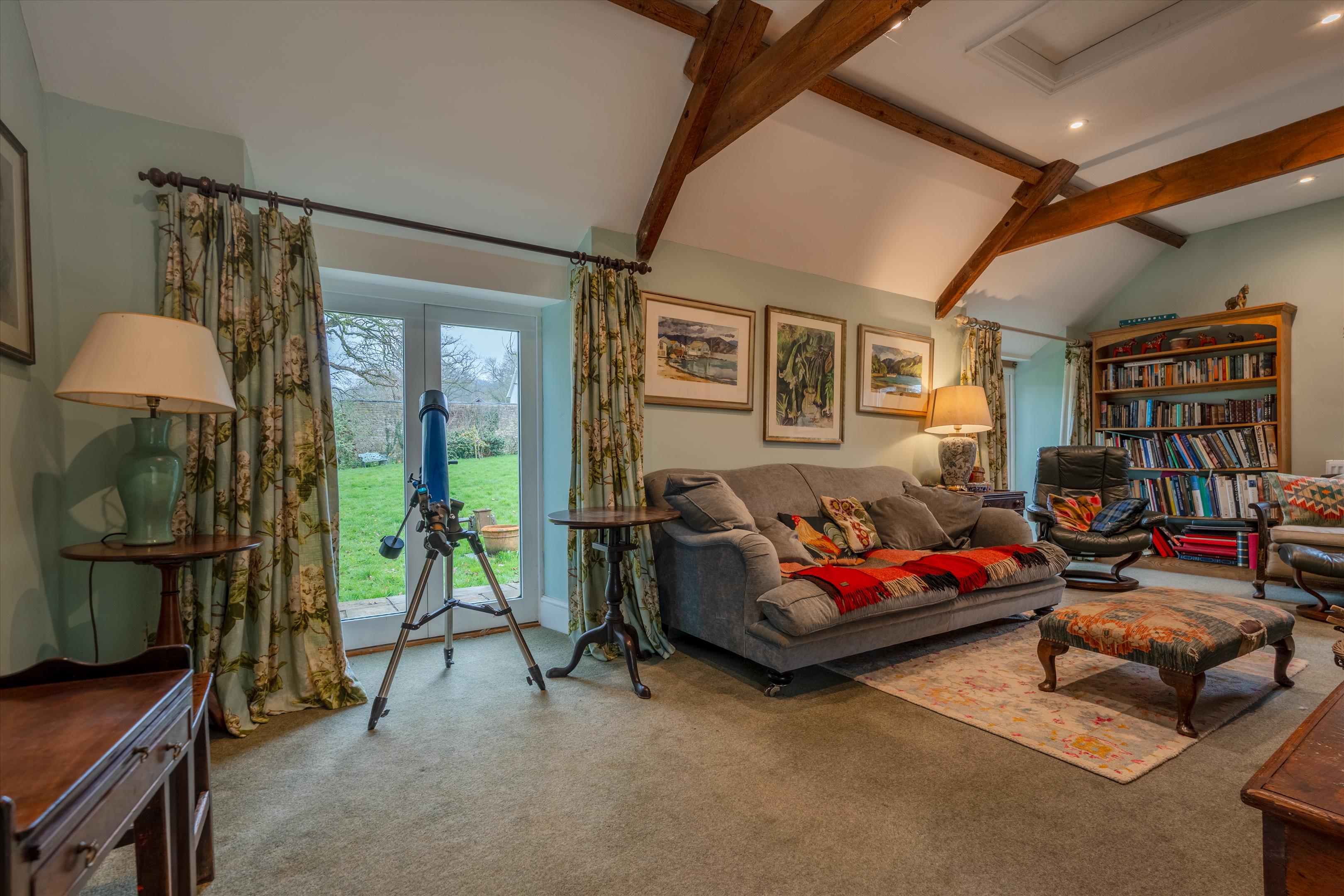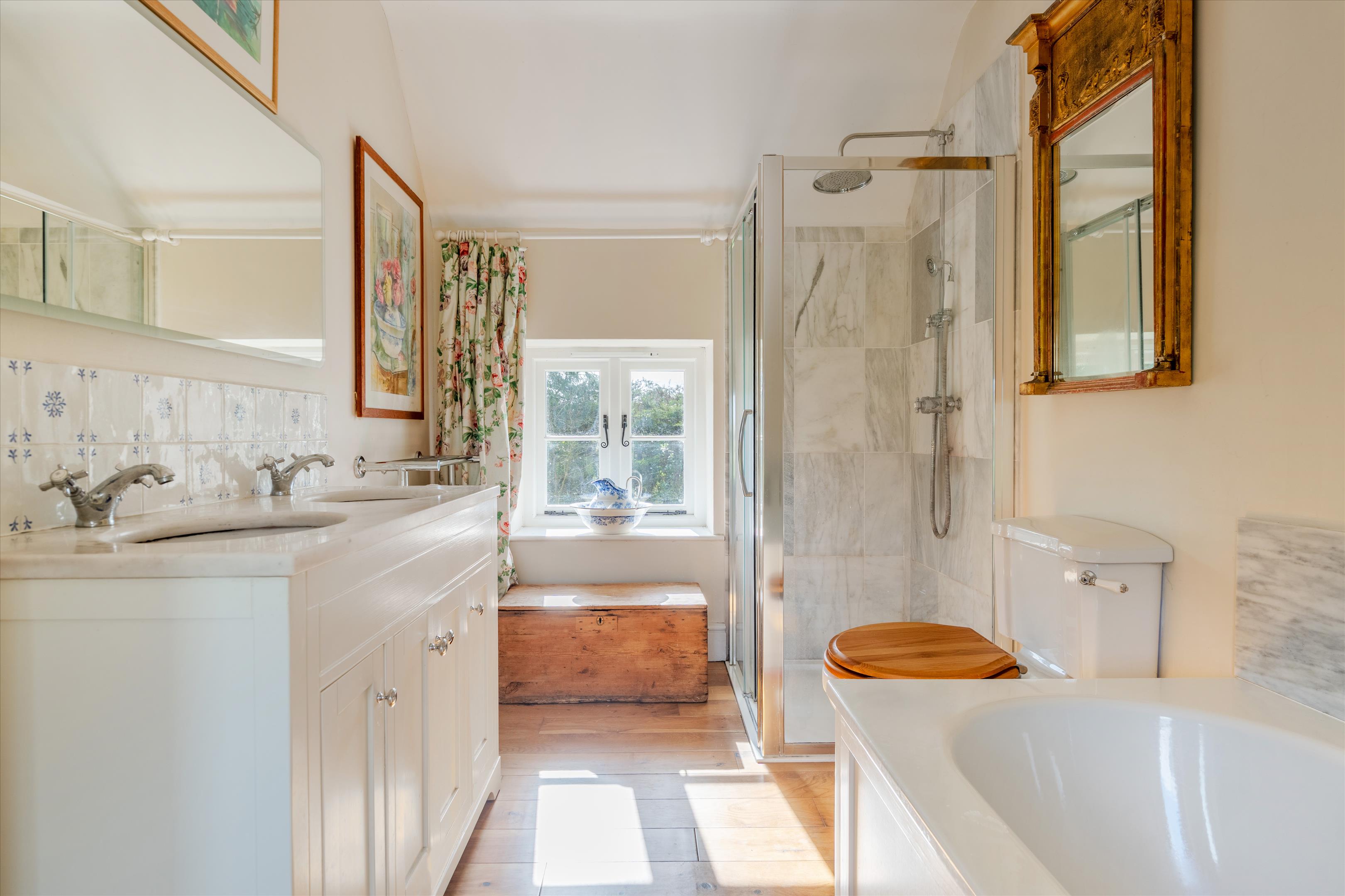 The sitting room is a particularly attractive room with beamed ceilings and fireplace, fitted with a log burning stove. It has an extensive view over farmland to the rear and over its garden at the front. The first floor has four bedrooms with the principal bedroom having stunning views to the front and rear. One of the three further bedrooms has an en-suite shower, and there is a family bathroom. All ground and first-floor rooms enjoy delightful views over either the charming garden or the surrounding countryside.