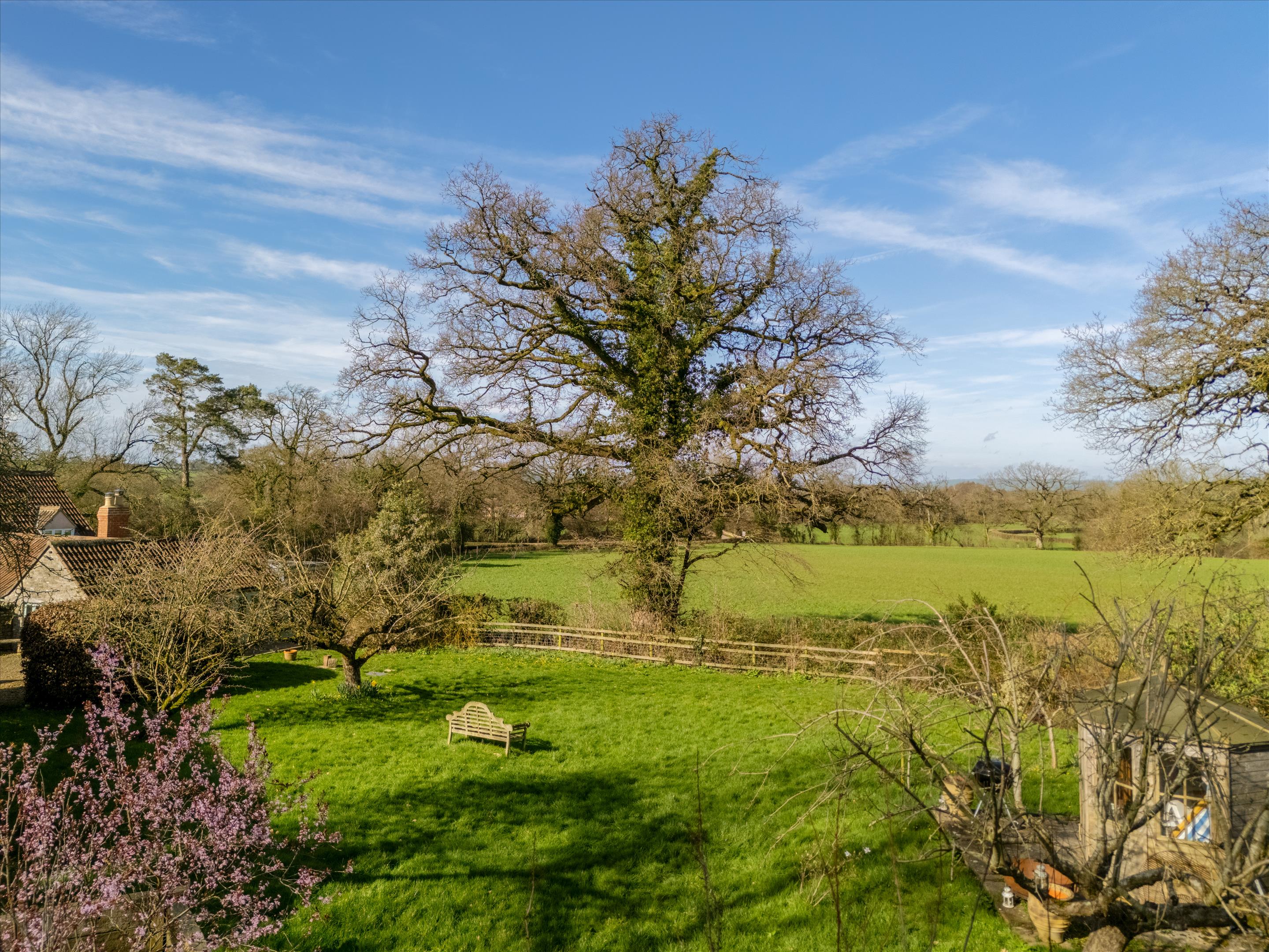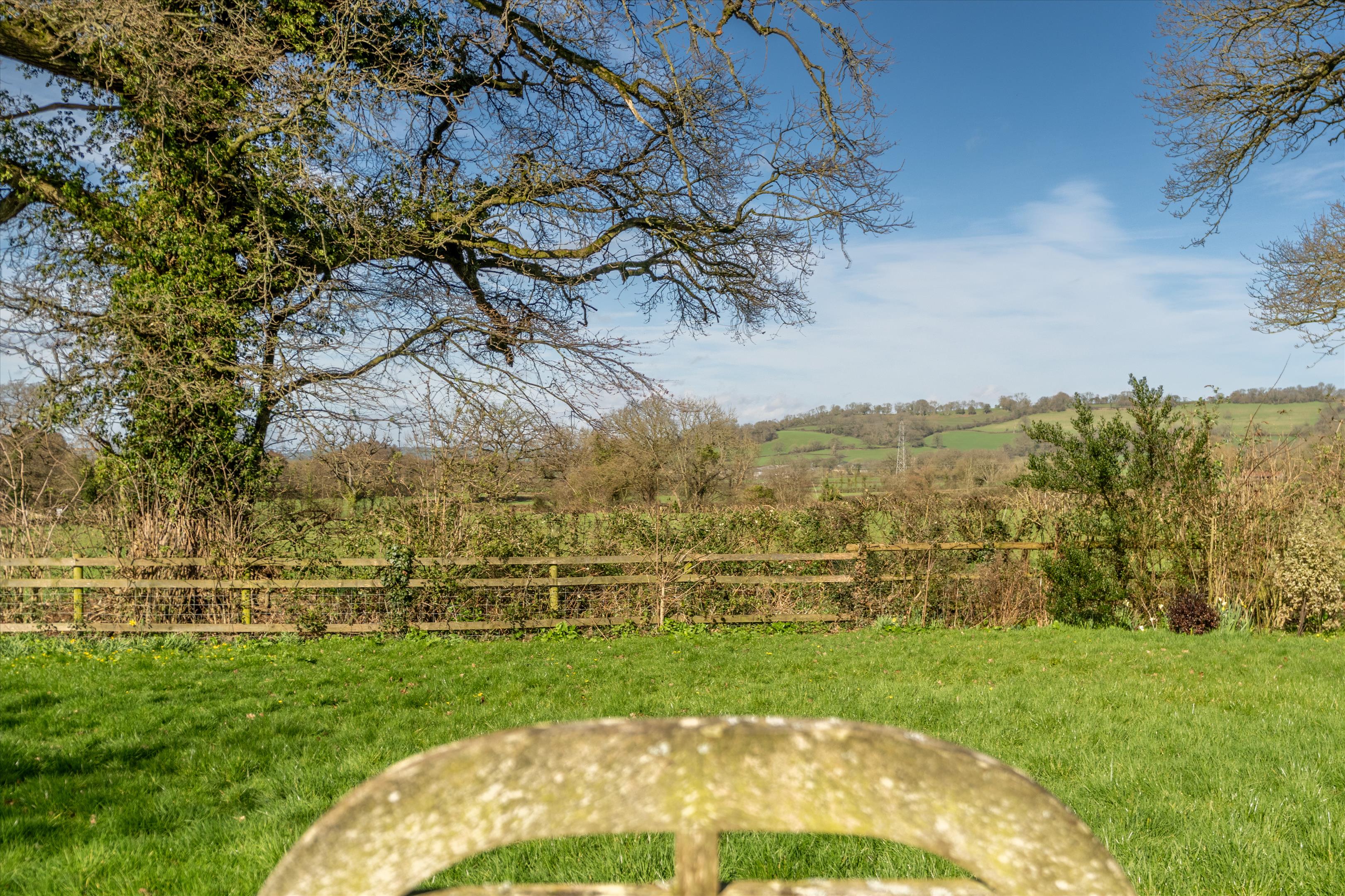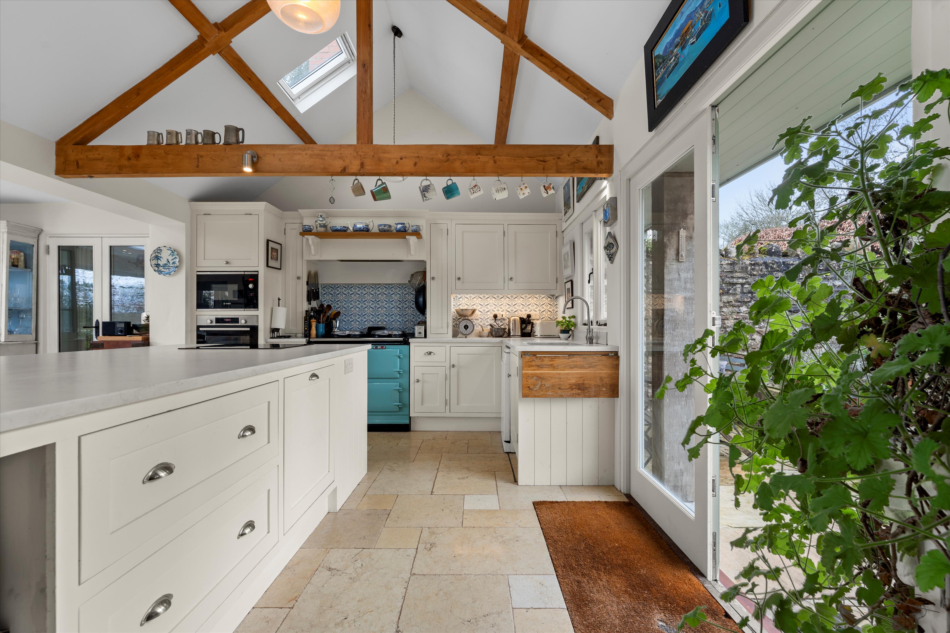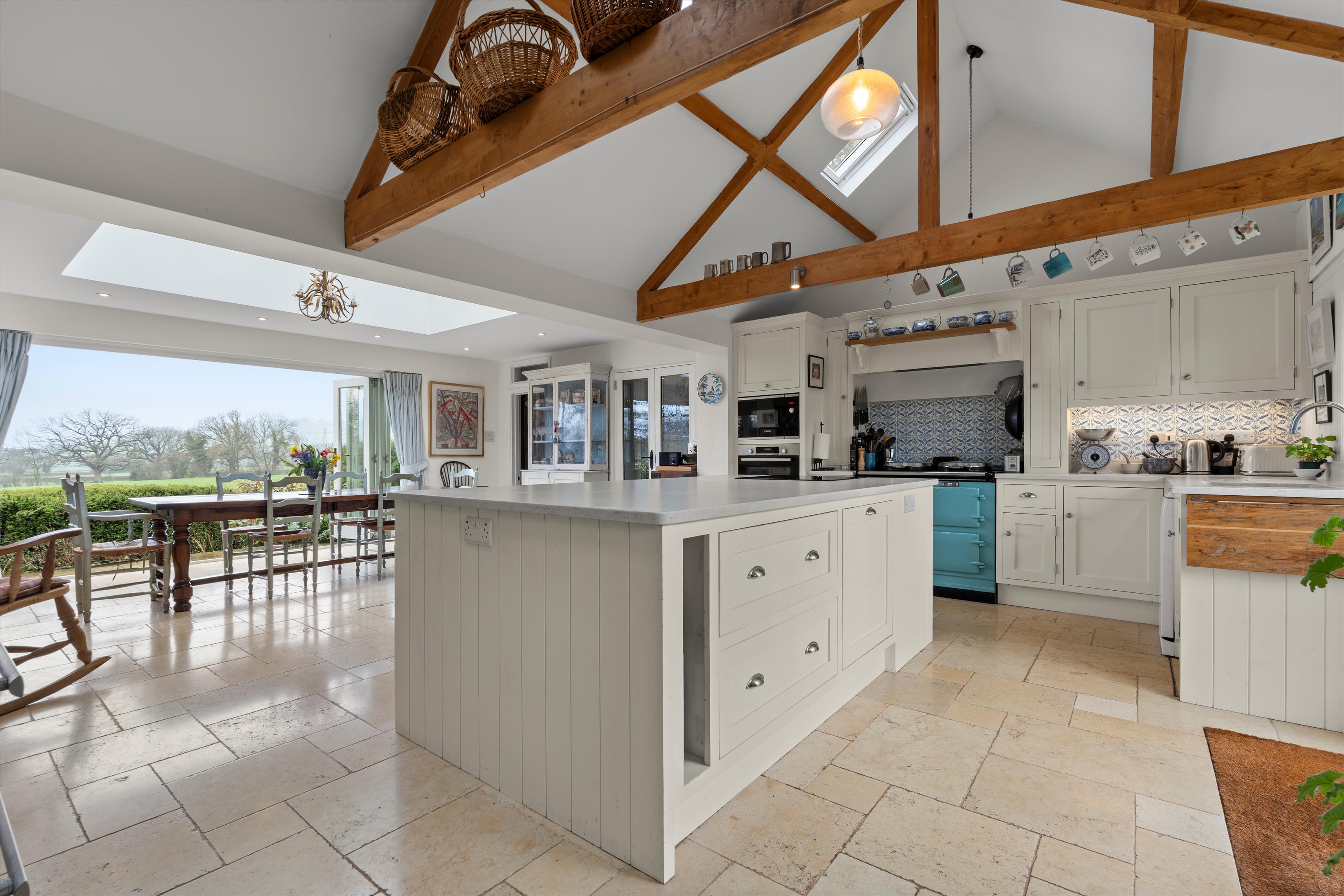 Fair Orchard is a very charming house, well presented, and has a wonderful warm and friendly atmosphere. The interior is full of character with beamed ceilings, stone fireplaces each fitted with a log burning stove and stripped pine internal doors. Since the present owners purchased the property, they have considerably modernised and improved the house. The majority of windows were replaced with double glazing in wood frames and new bathrooms were installed. The kitchen was completely redesigned and extended into a most striking room with bi fold doors opening to a paved patio which offers superb views. The bespoke kitchen has integrated appliances (cabinet fridge freezer not included), an electric Aga, and a limestone floor with underfloor heating.