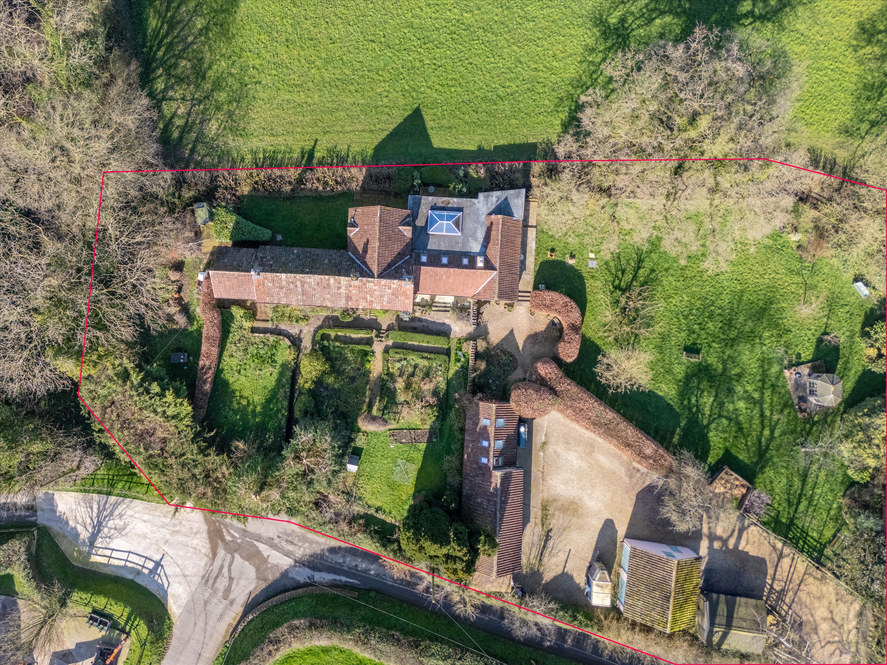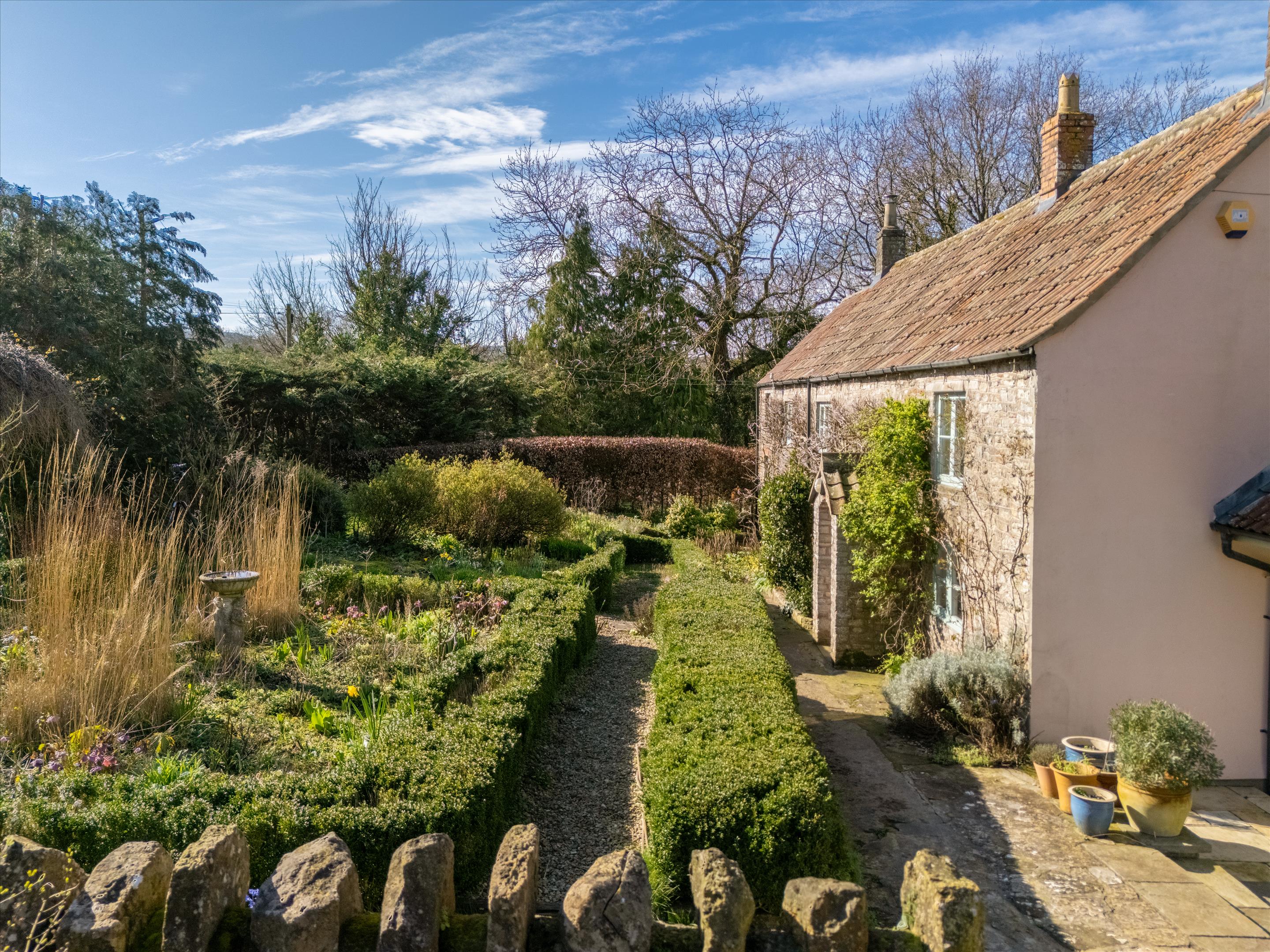 The property is approached over a gravel drive to a large parking area for several vehicles. The outbuildings are grouped around the parking area and comprise a detached stone and tile outbuilding incorporating two stables and an excellent studio with vaulted ceiling. Opposite is a detached, rendered double garage, and alongside is a detached open fronted log and hay store. The front garden is a delight and is planned as an English country garden. Immediately in front of the house are box hedging around planted beds of spring bulbs and flowering plants, gravel and lawn pathways, shrubs, and low stone walls, and lawn. A central stone pathway leads to the front of the house, which is adorned by Wisteria, Honeysuckle and climbing roses. The side garden has an expanse of lawn interspersed with fruit trees, dense shaped beech hedges, ornamental trees and a summer house. Around the garden fruit trees include apple, quince, fig, cherry and damson.