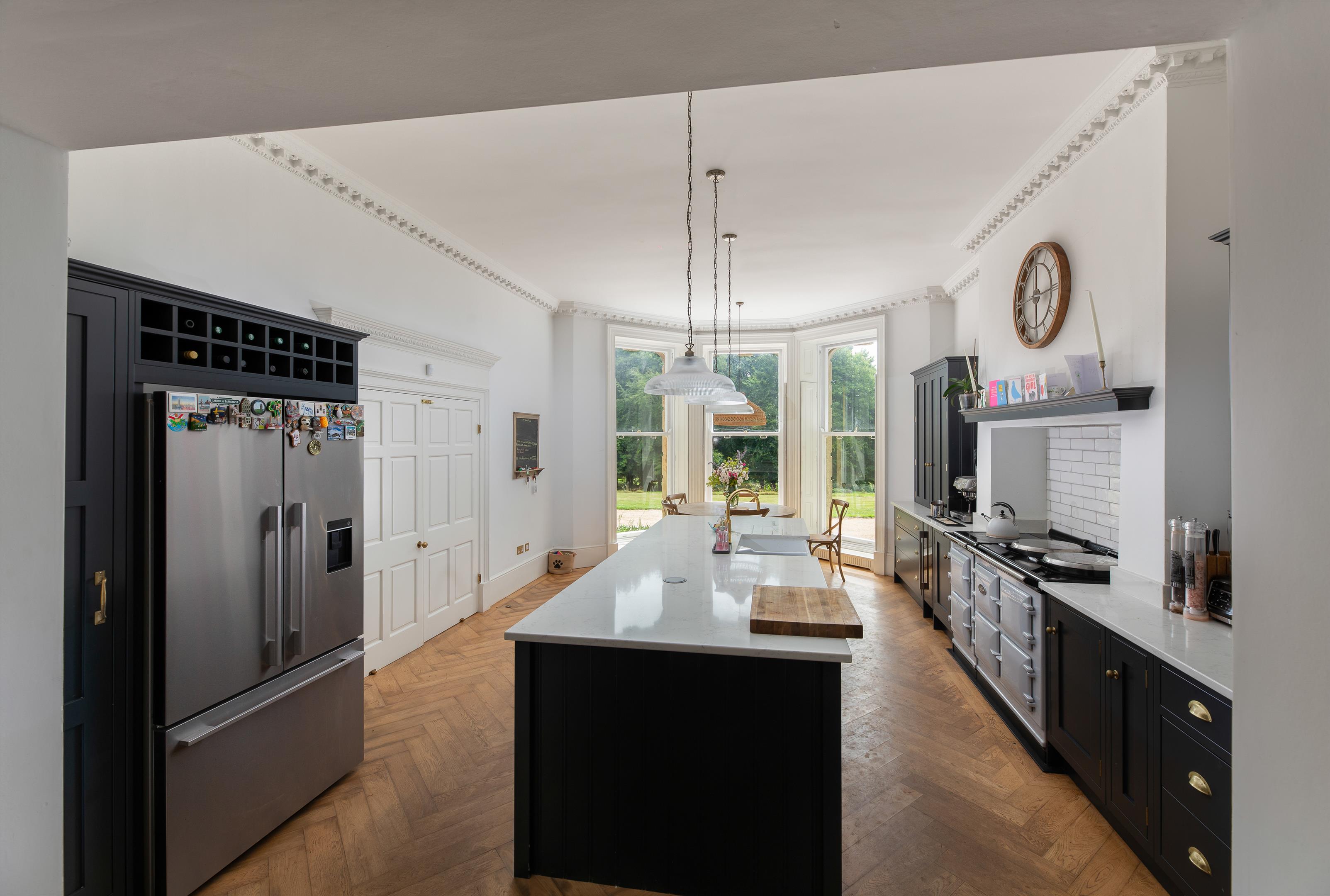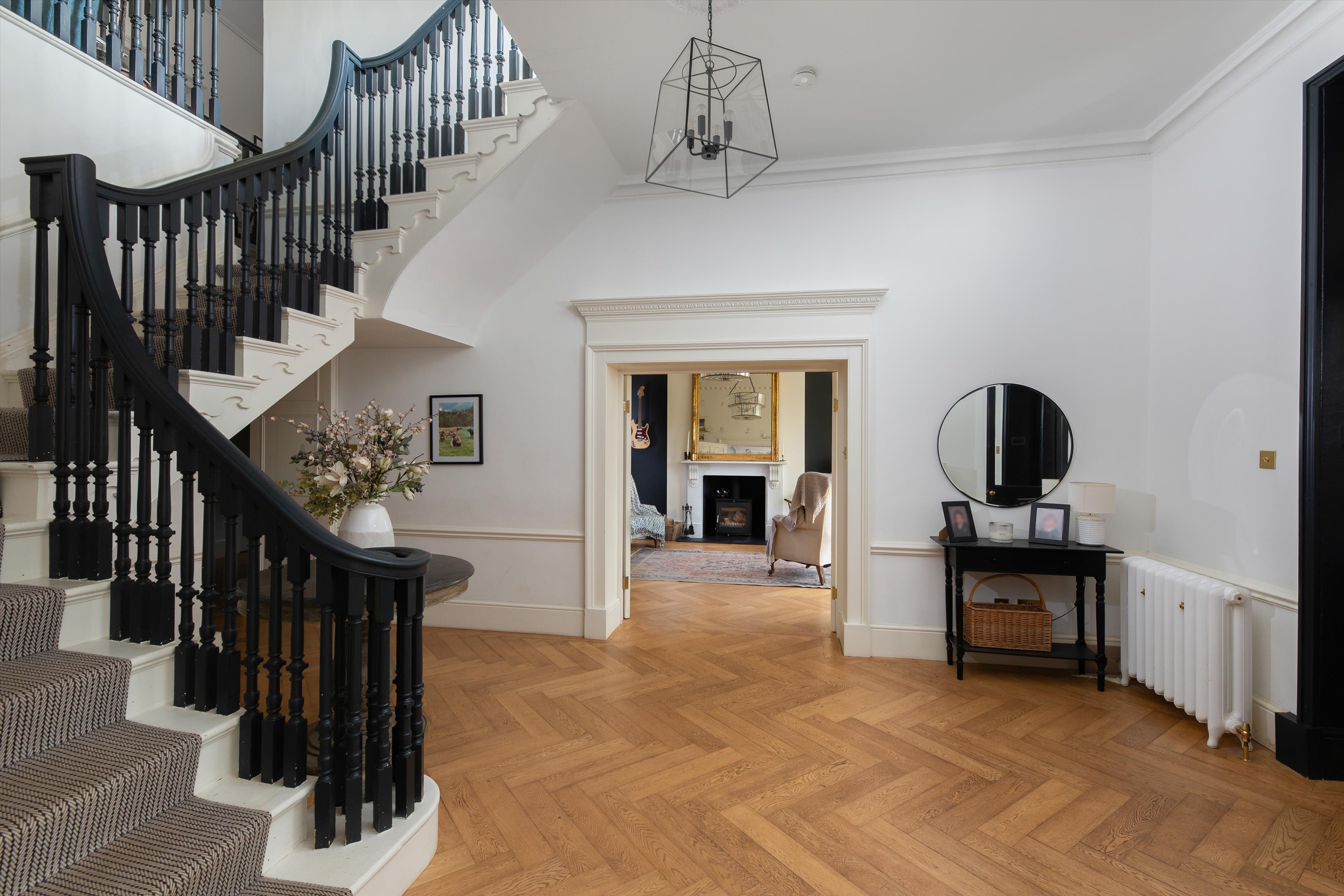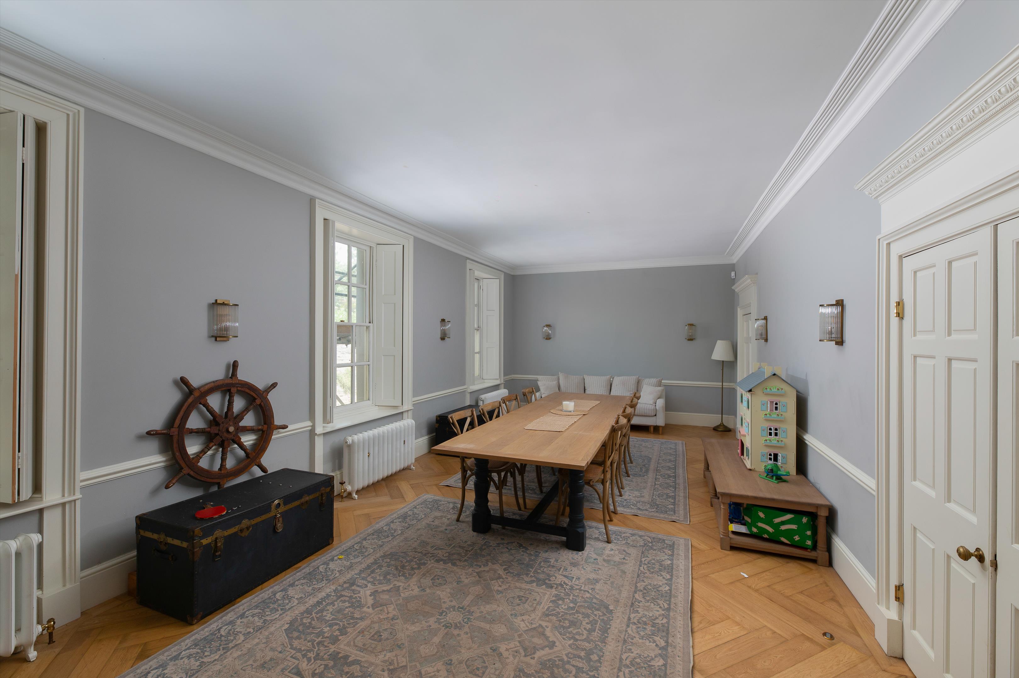 The Grange is a wonderful double fronted house dating from 1750 with Victorian additions. It is slightly elevated and has stunning views looking over its private formal gardens and park-like setting, to a valley of pasture and beyond to countryside. There are many features appropriate to the period including ornate and simple ceiling cornices, period fireplaces, sash windows and window shutters, detailed door architraves and dado rails. The present owner purchased the property in 2018 and undertook a major renovation inside and out which has been done to a meticulously high standard. Part of the interior layout was also redesigned. A purpose built kitchen with electric Aga was installed by John Lewis of Hungerford, all bathroom and shower rooms replaced by Ripples, all floors lifted, levelled or replaced where necessary with oak and parquet floors, walls were lime rendered, wiring upgraded and a new central heating system installed replacing all the radiators to cast iron. All of the sash windows were repaired and draft proofing added.