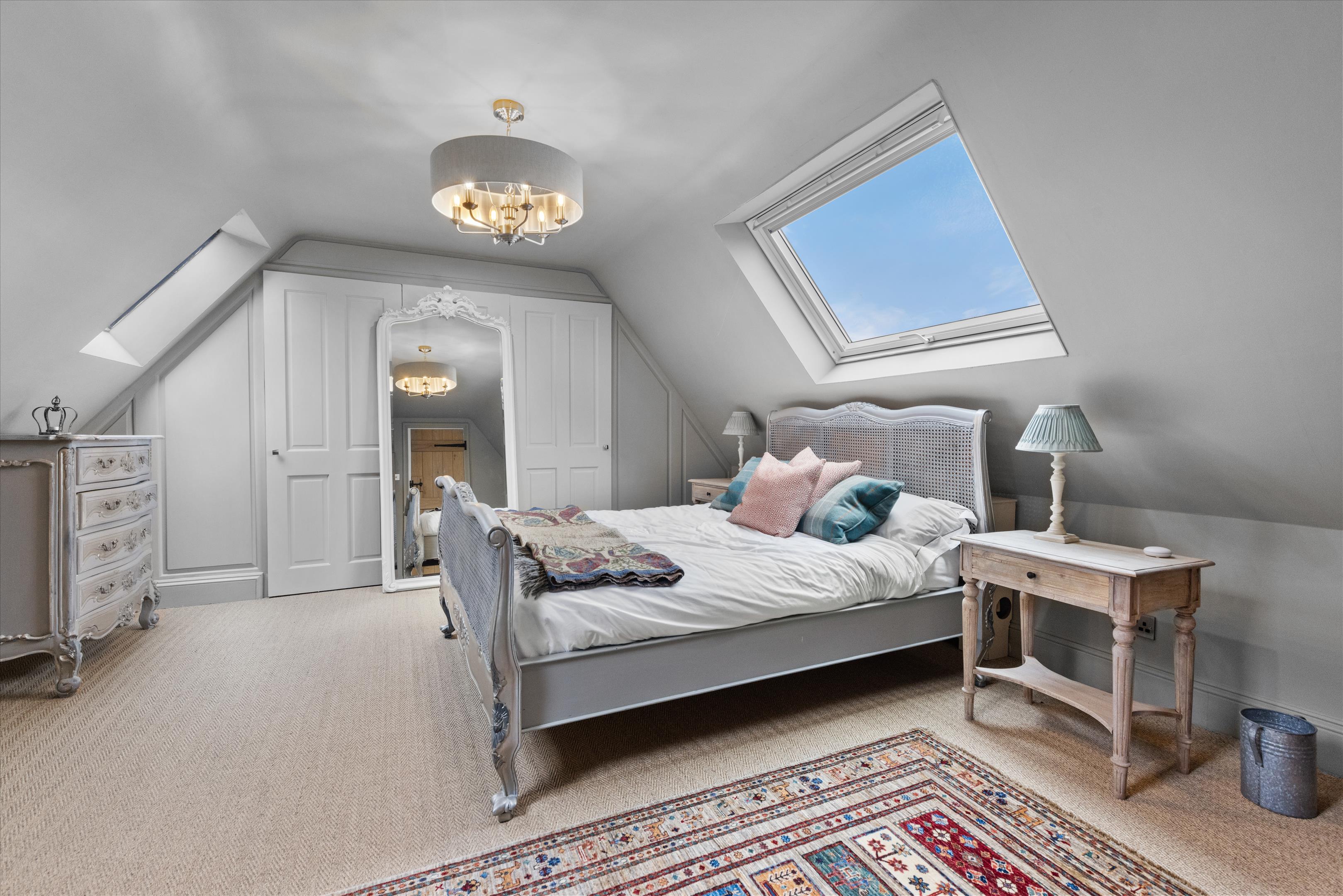 Upstairs, the principal bedroom is a comfortable retreat with a dressing area and en suite bathroom, complemented by a second suite and a further double bedroom with family bathroom. The secondary staircase leads to two additional bedrooms with a shared Jack-and-Jill bathroom, while the top floor offers a further suite, creating excellent flexibility for guests or older children.