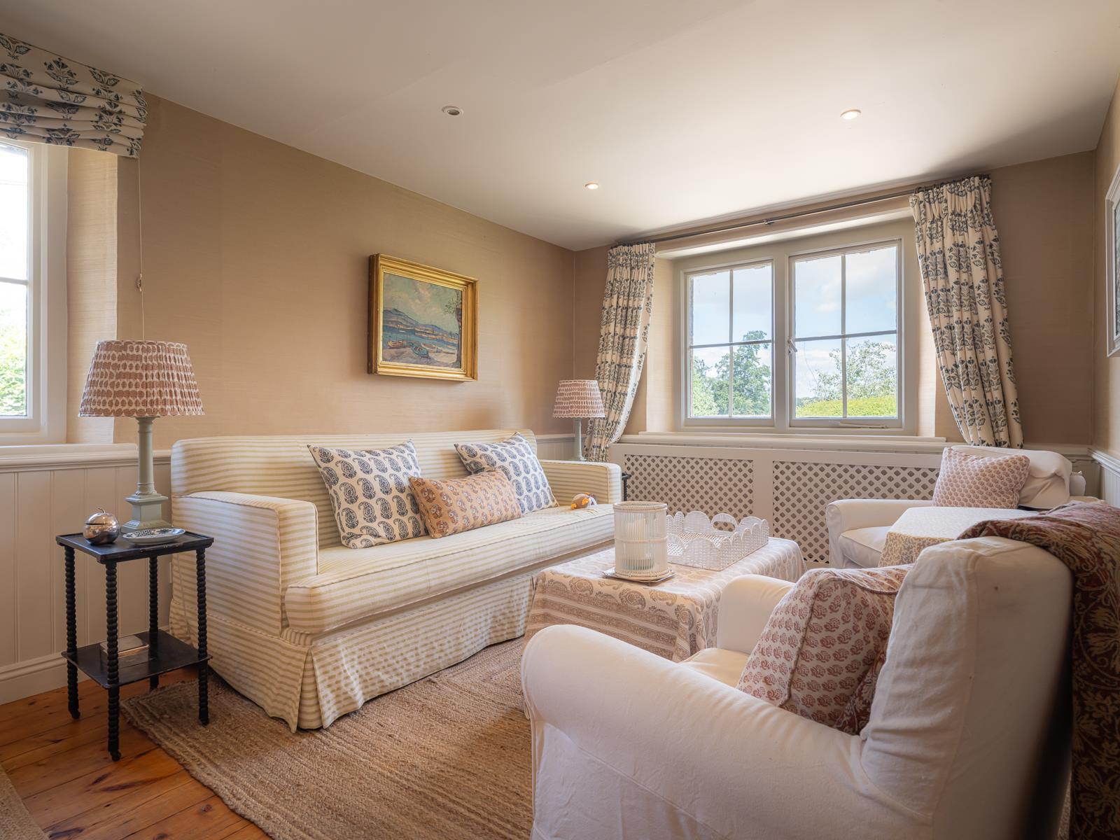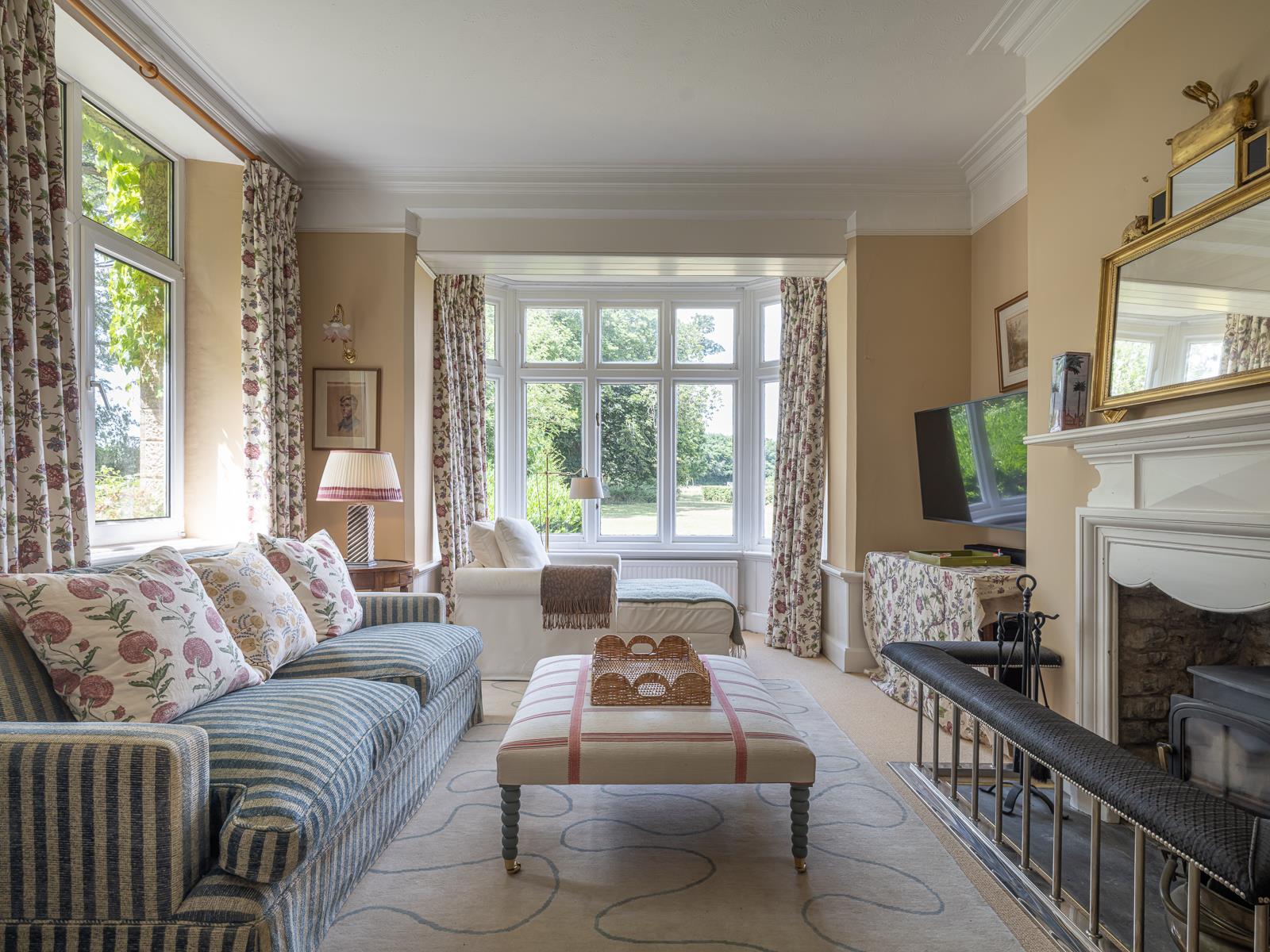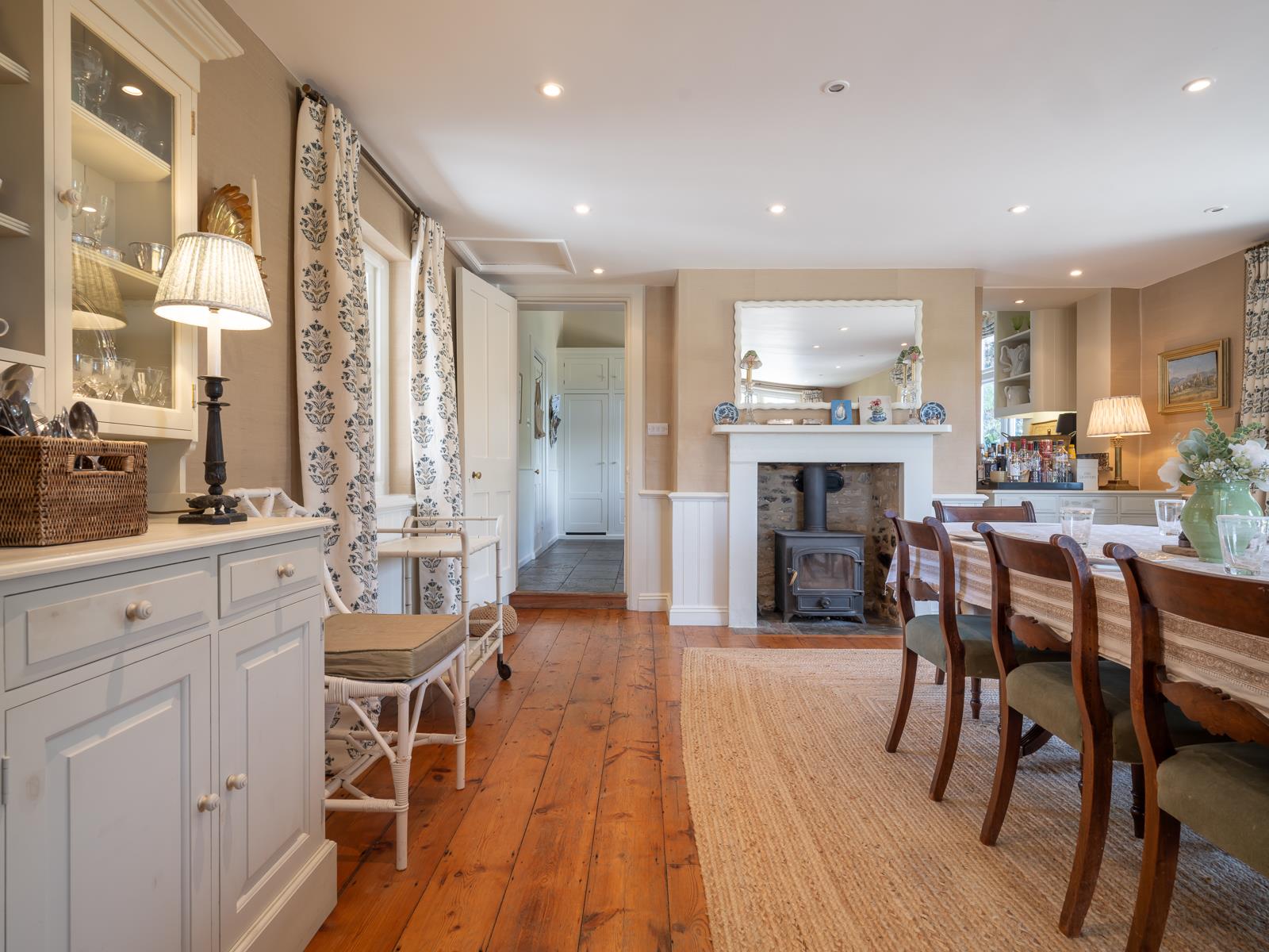 The property offers high ceilings and light-filled, well-proportioned rooms perfect for family living and entertaining. The entrance hall leads to a bay-windowed sitting room with a wood-burning stove, and a dual-aspect study with views over open fields. A cloakroom, an understairs store, and a staircase sit off the hallway. The kitchen features an Aga, a central island, and a tiled floor, with rural views over paddocks. A second reception room with a log-burner opens to a terrace via French doors.