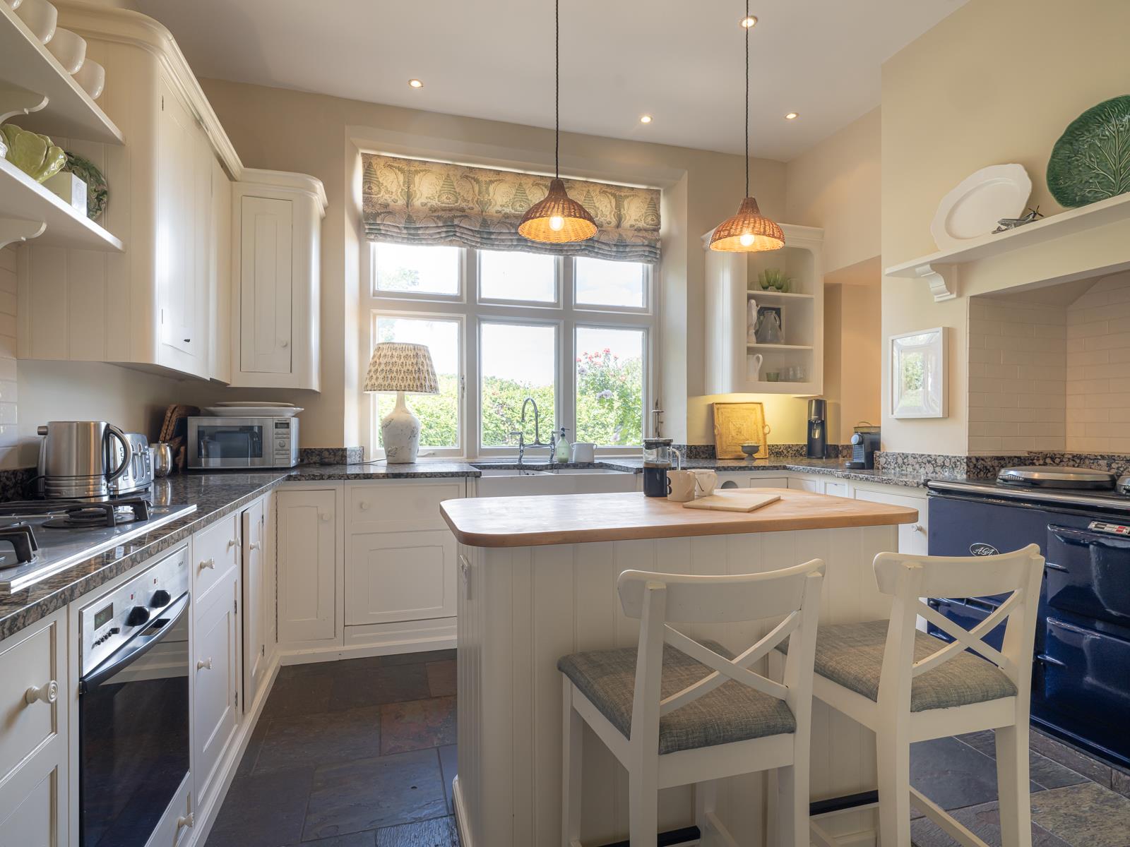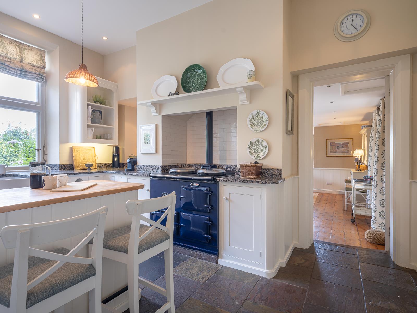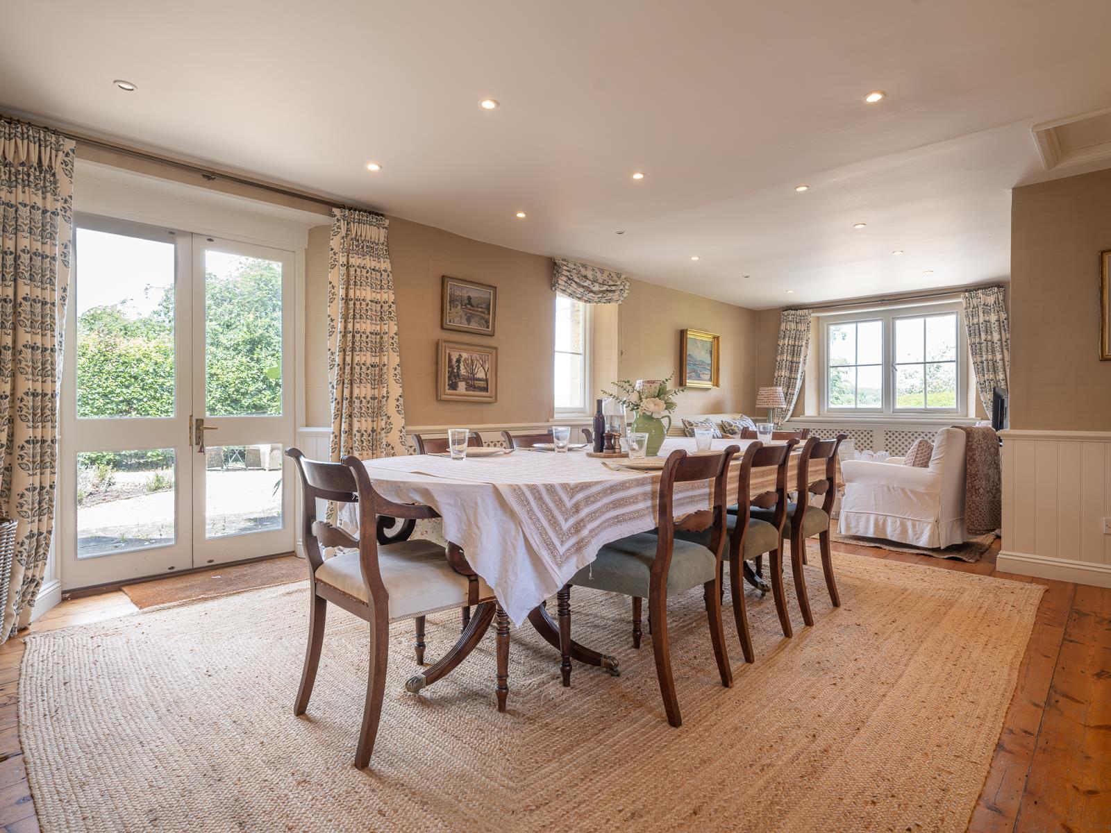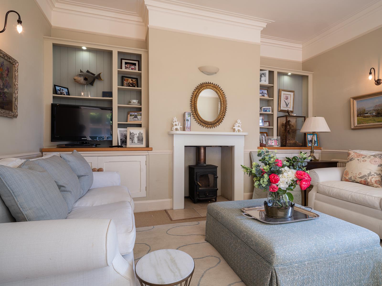 The property offers high ceilings and light-filled, well-proportioned rooms perfect for family living and entertaining. The entrance hall leads to a bay-windowed sitting room with a wood-burning stove, and a dual-aspect study with views over open fields. A cloakroom, an understairs store, and a staircase sit off the hallway. The kitchen features an Aga, a central island, and a tiled floor, with rural views over paddocks. A second reception room with a log-burner opens to a terrace via French doors.