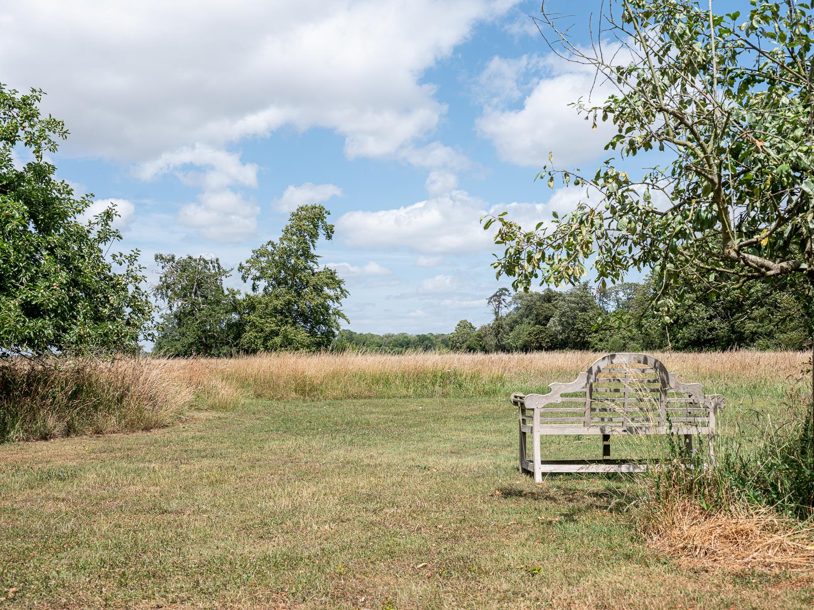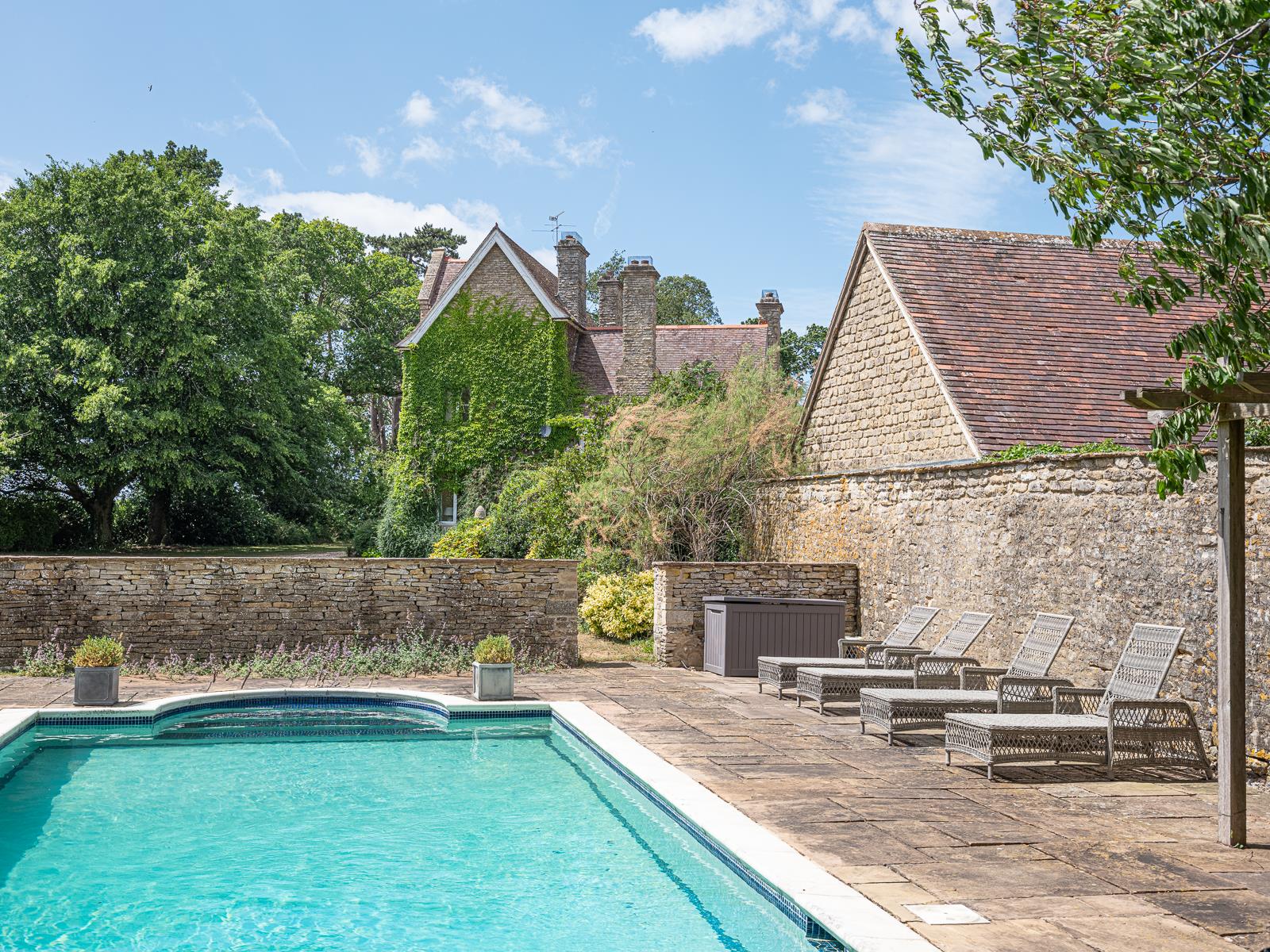 The mature gardens include lawns bordered by Cotswold stone walls, a swimming pool with pergola-covered terrace, a vegetable garden, greenhouse, and organic pasture paddocks with far-reaching countryside views. A small woodland borders the northeastern edge of the property.