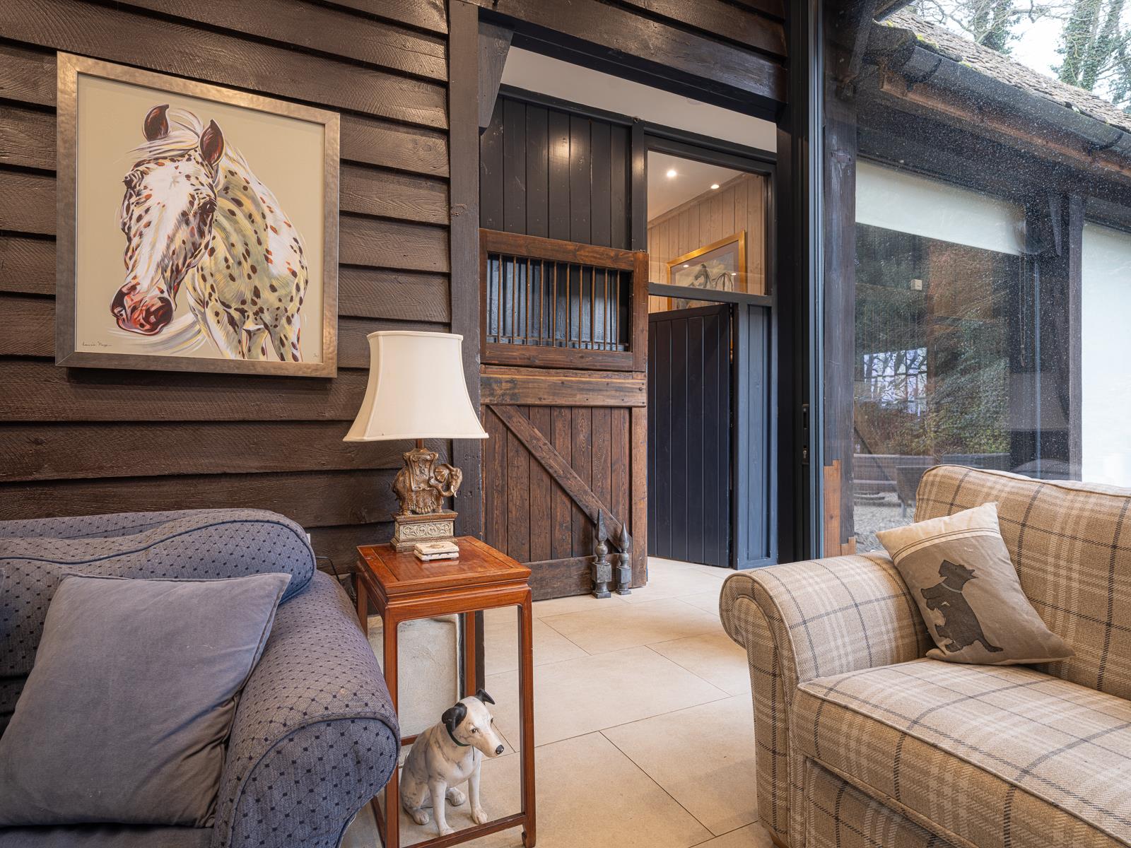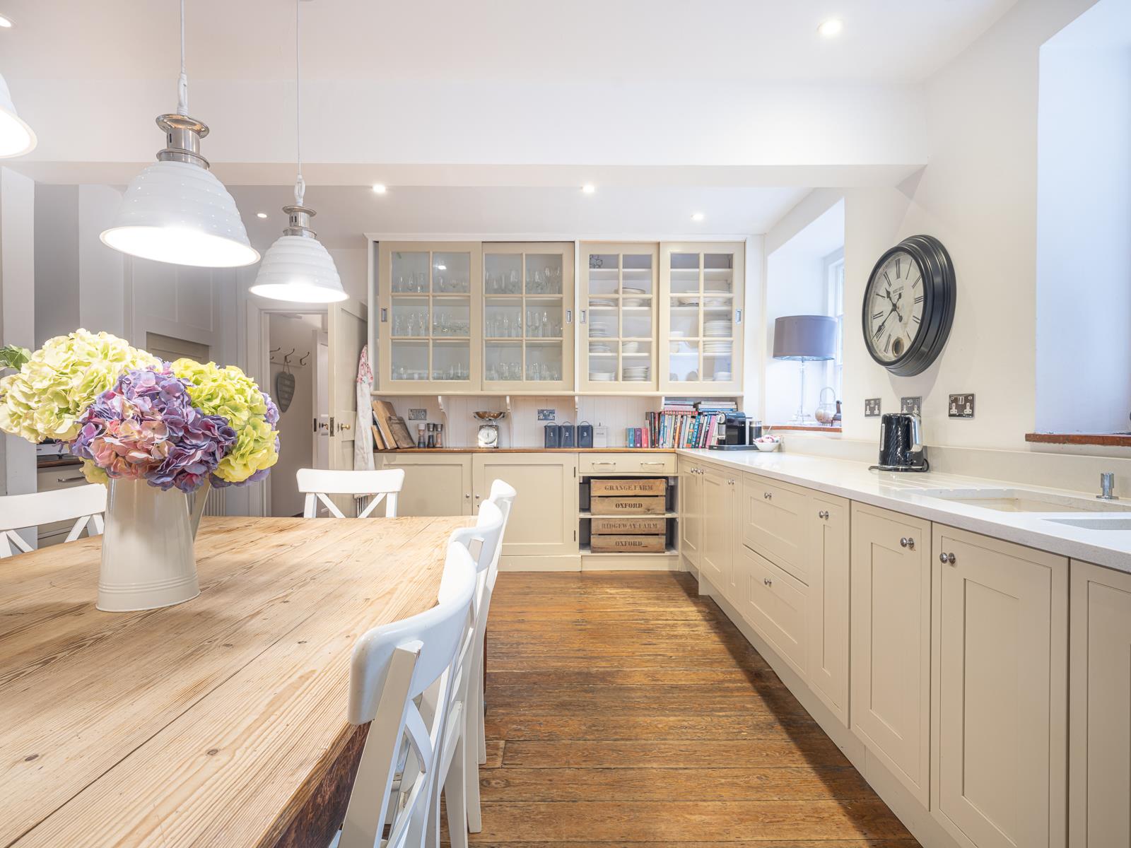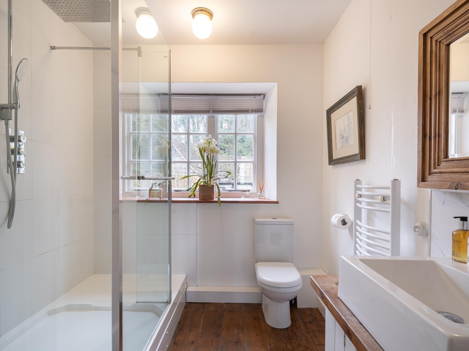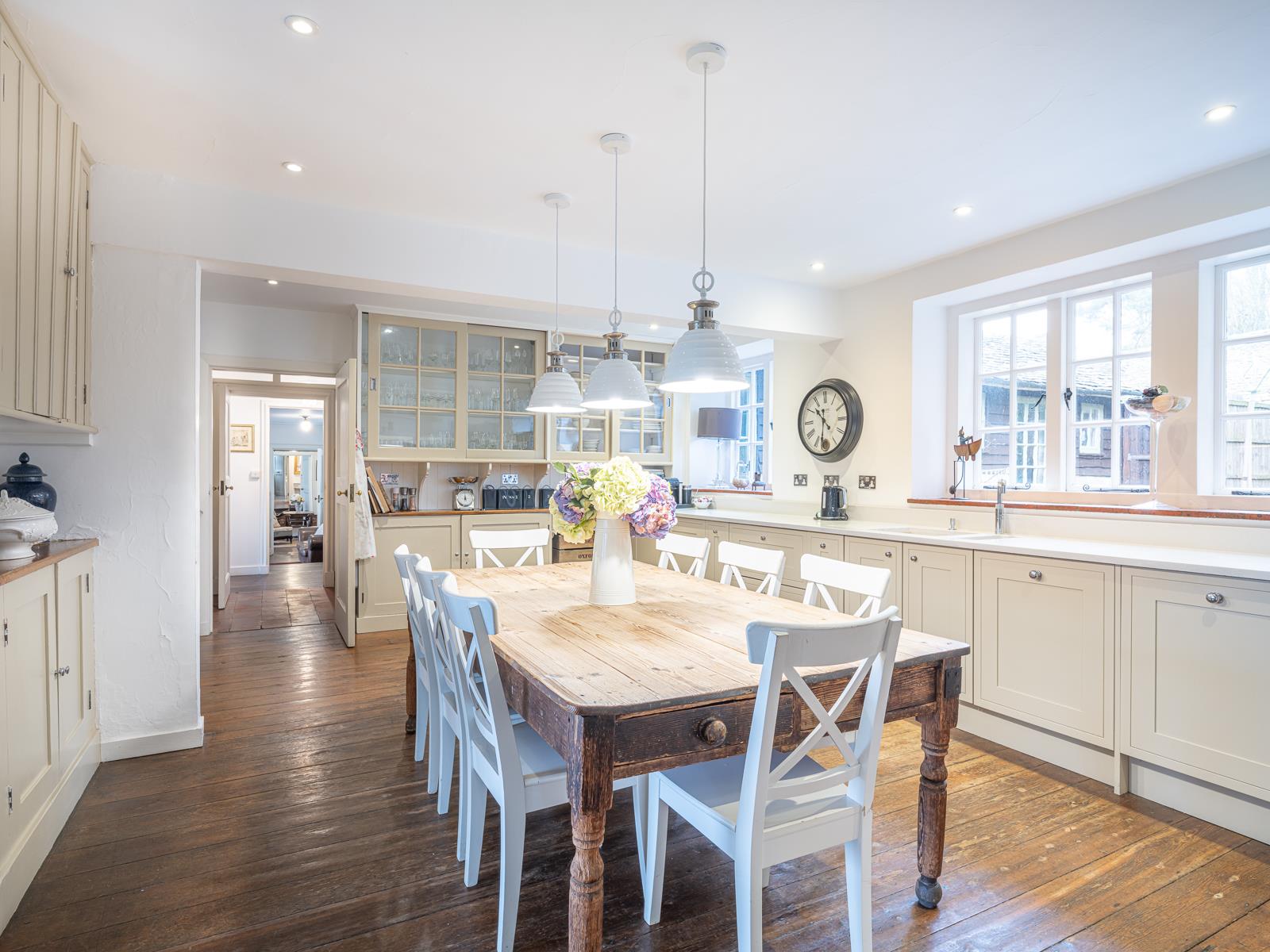 The ground floor kitchen/dining area has large, glazed walls overlooking a courtyard with mature trees beyond. There is also a sitting room, utility room, and two spacious bedrooms with a family bathroom. On the second floor, two further bedrooms with en suite shower rooms fit into the eaves of the former stables and coach house. Ideal for family, guests or letting out.