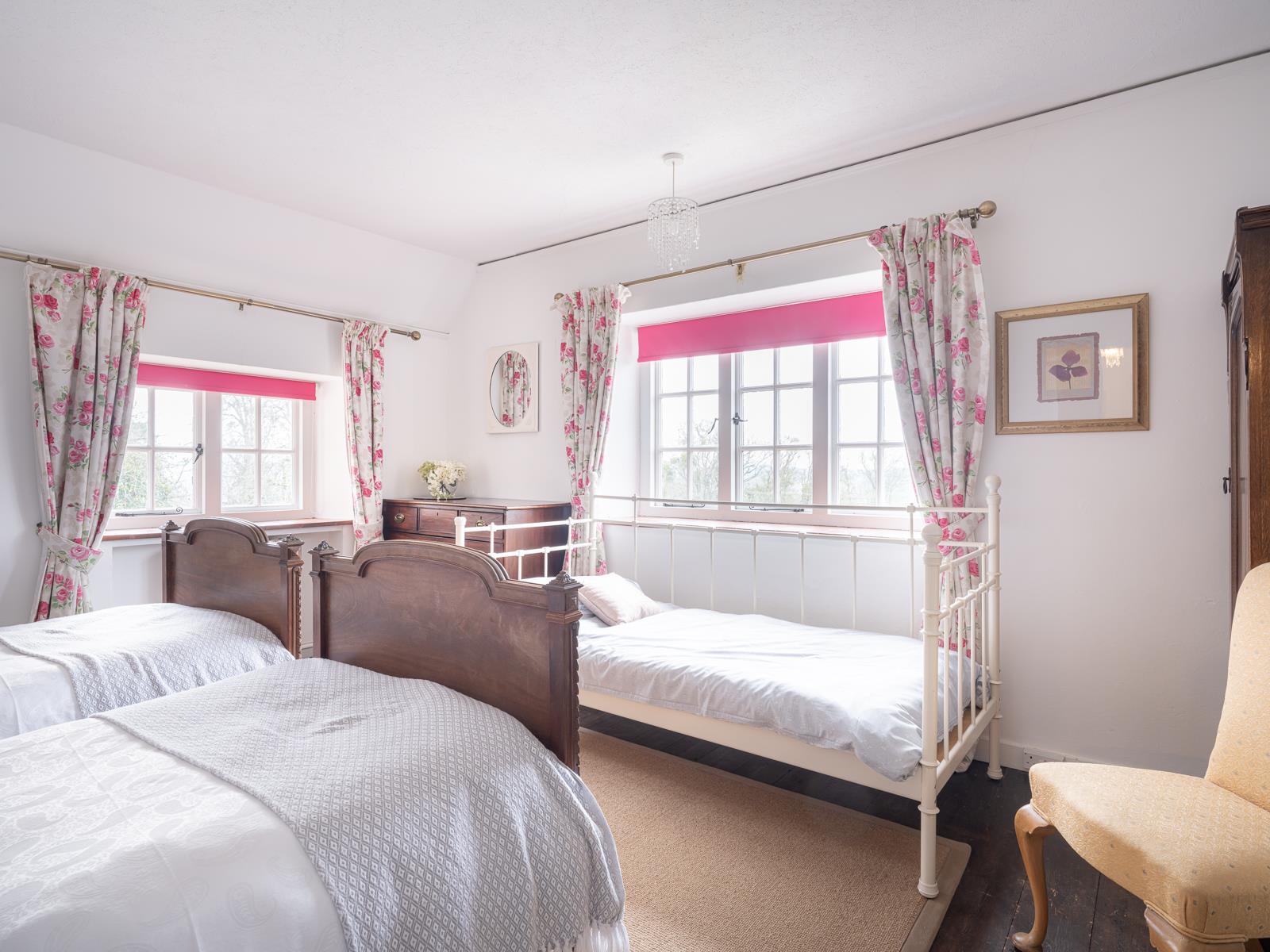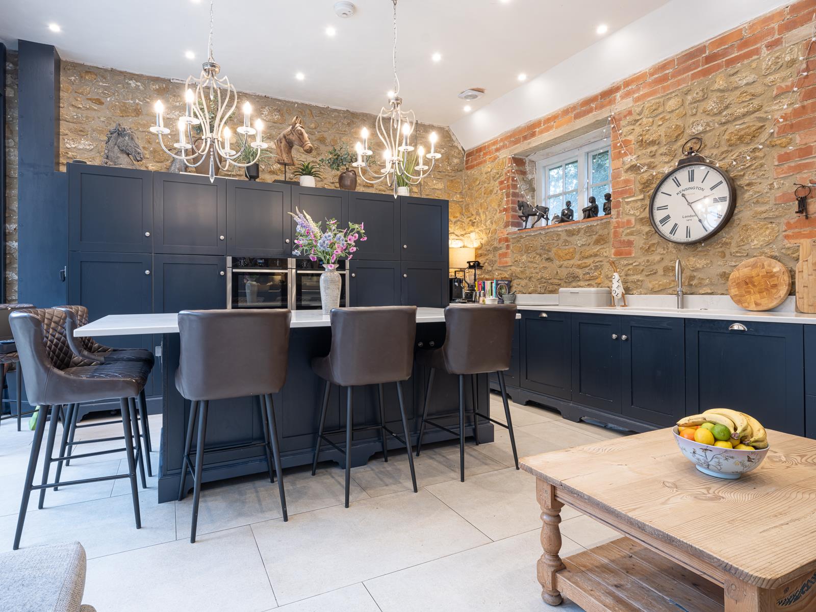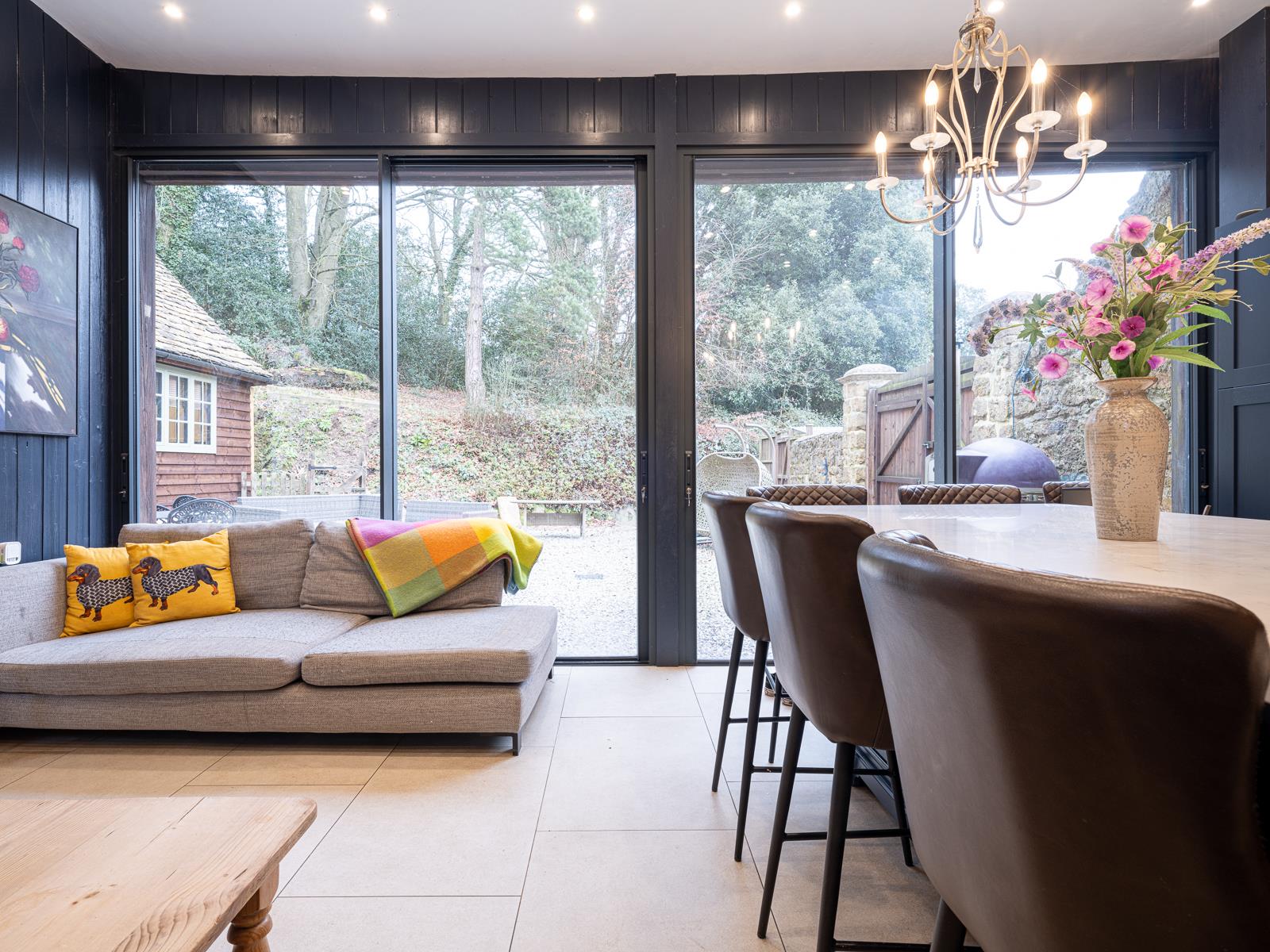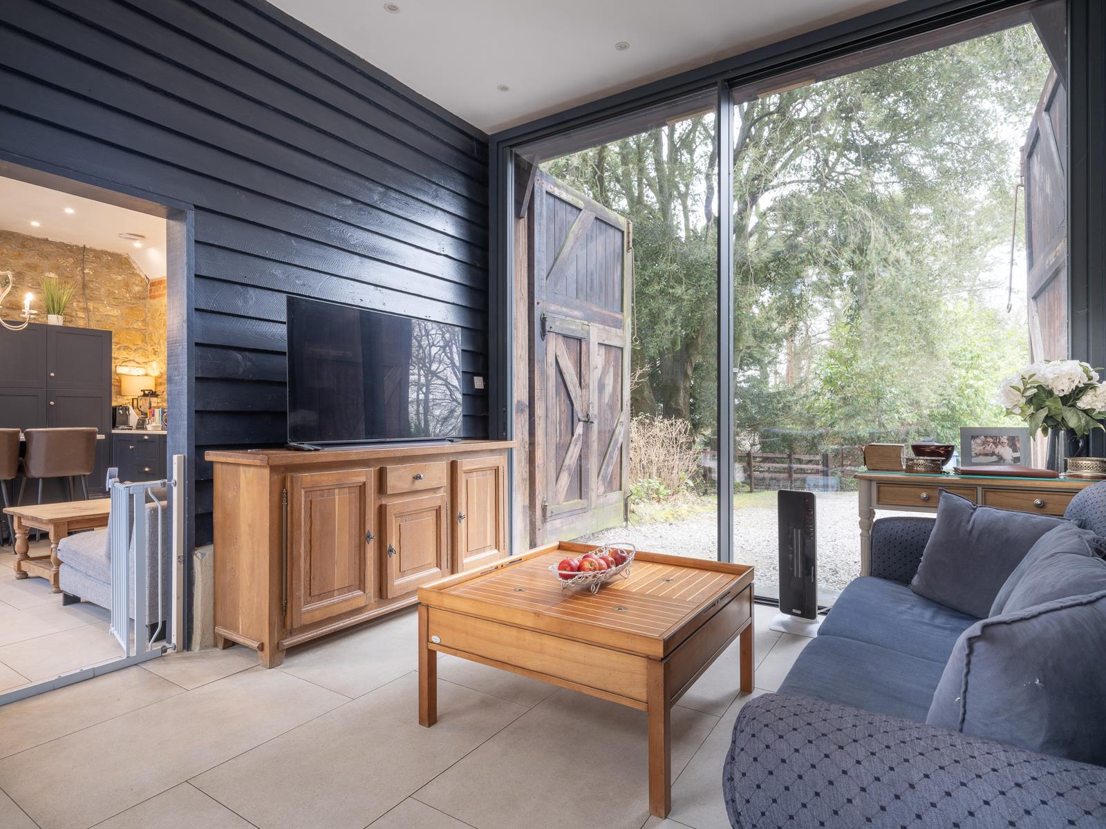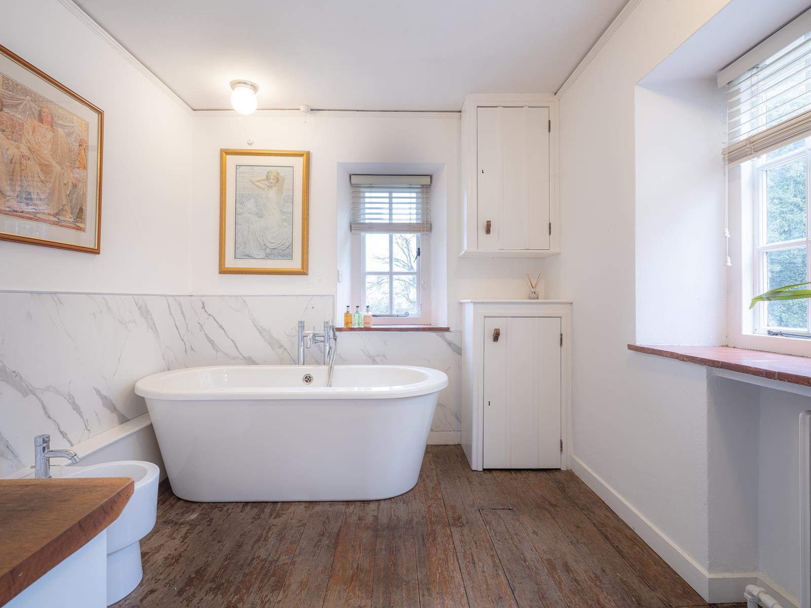 The ground floor kitchen/dining area has large, glazed walls overlooking a courtyard with mature trees beyond. There is also a sitting room, utility room, and two spacious bedrooms with a family bathroom. On the second floor, two further bedrooms with en suite shower rooms fit into the eaves of the former stables and coach house. Ideal for family, guests or letting out.