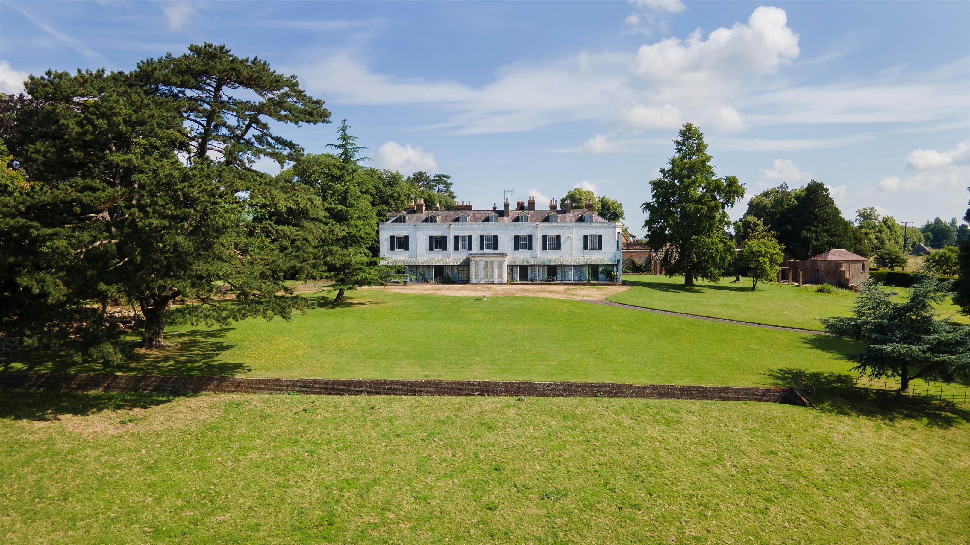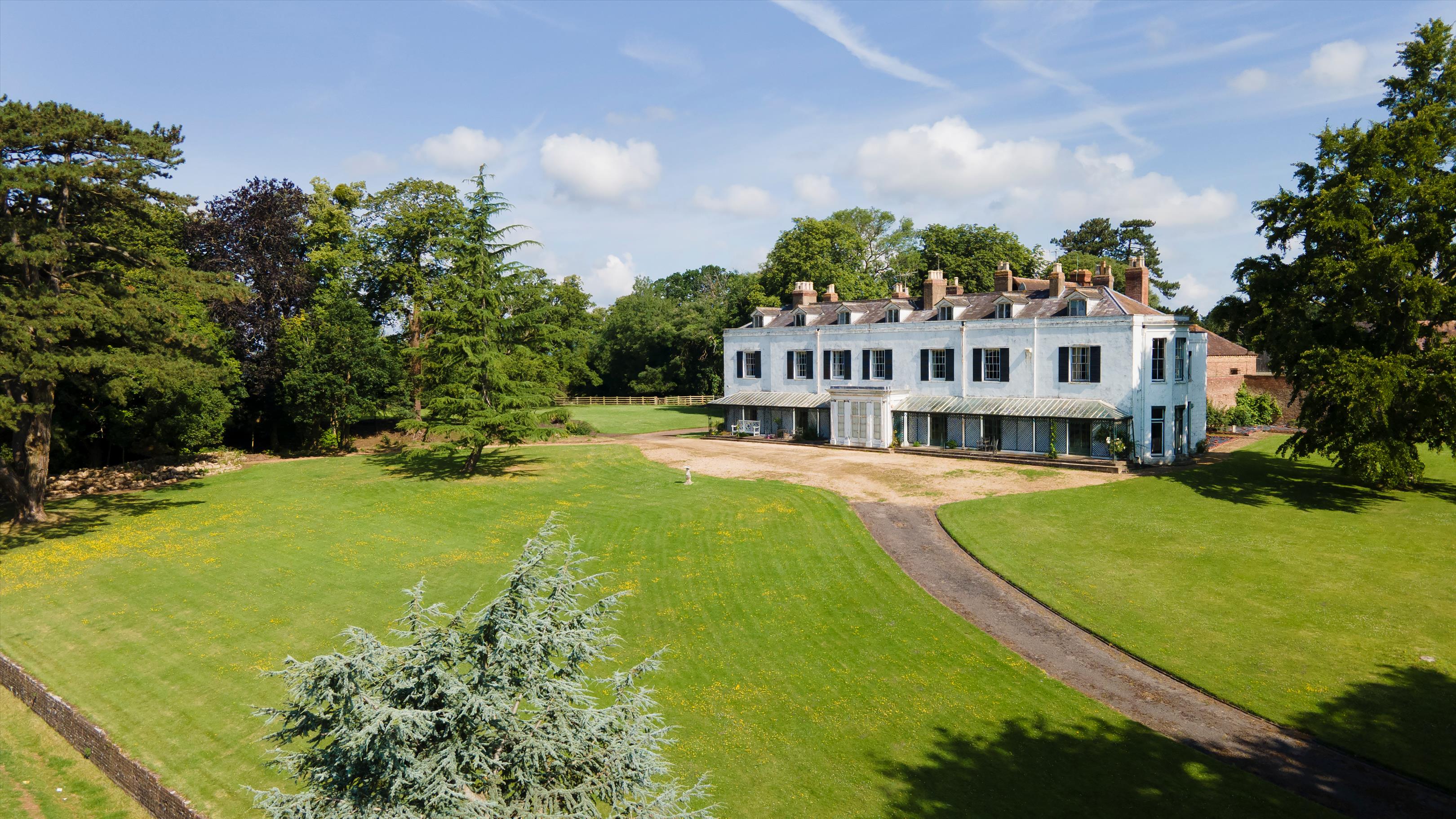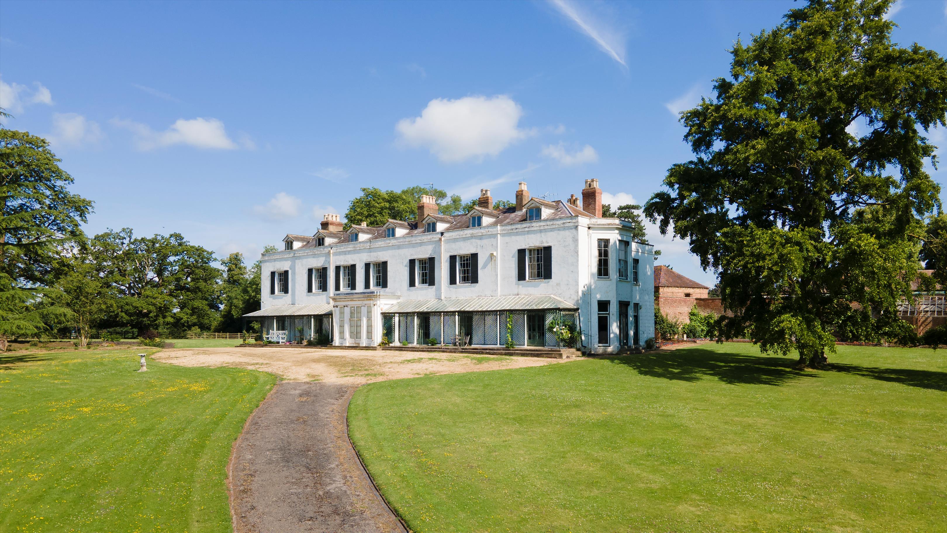 The property originated from a modest 18th-century farmhouse and was much expanded in 1817 for sisters Julianna and Charlotte Strickland by the local renowned architect John Collingwood, whose previous projects included improvements to Gloucester Cathedral and The Precinct. The sister's intention was to create a grand country house for their Gloucestershire Estate, which they had bought in 1815. Collingwood's creation is a stuccoed south front of two storeys and five wide bays with a central ionic porch which was tactfully extended circa 1850 by H Rowe and Son in Worcester for Henry Eustatius, their brother, with additions including slightly extended bays at either end, a full-length cast iron veranda, window shutters and dormer windows. The result today is a stunning late Regency country house sitting in mature specimen gardens and grounds.