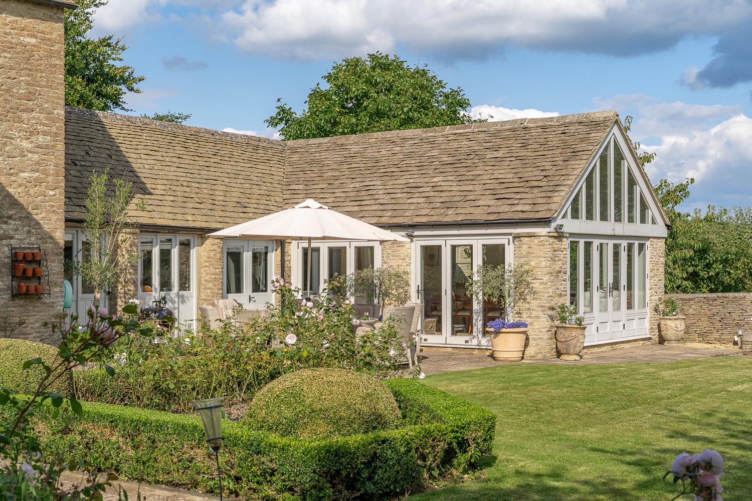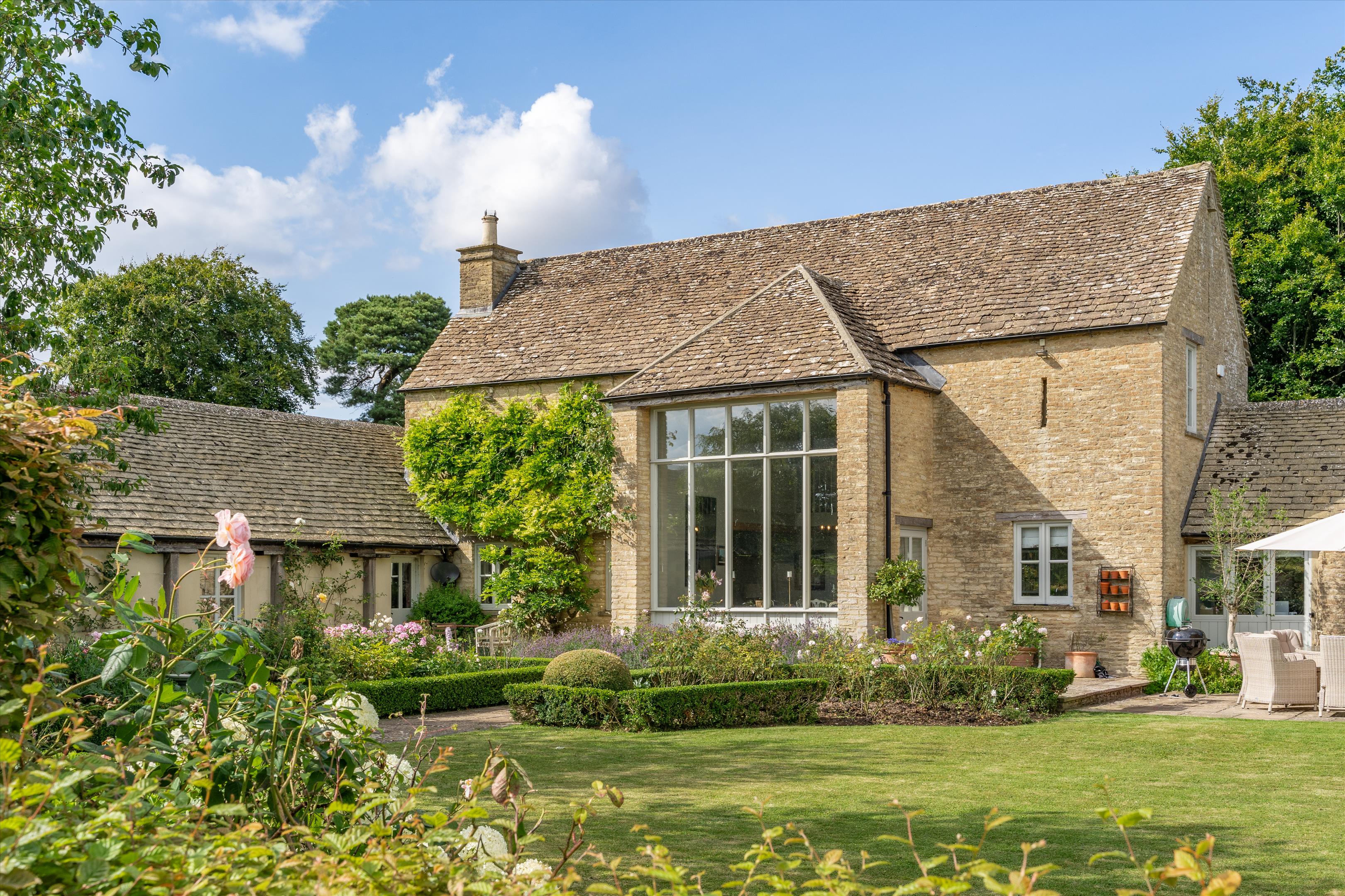 A detached single storey Cotswold stone cottage with an open plan kitchen and sitting room, separate utility and two ensuite double bedrooms. The cottage is in excellent condition and has a lovely private south facing garden and terrace with a pergola.