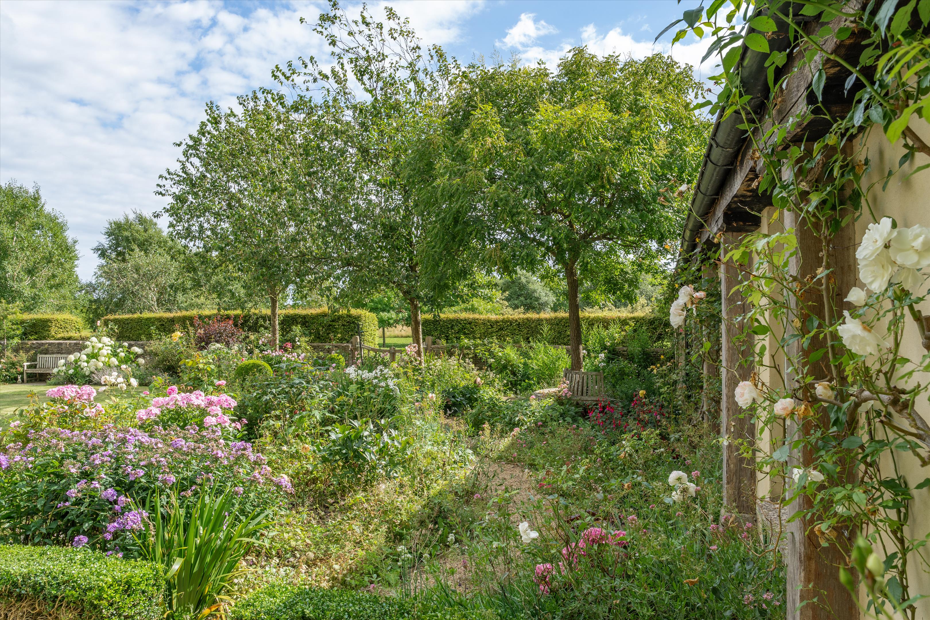 The primarily south-facing gardens are beautifully landscaped with expansive lawns and vibrant flower and shrub borders. The drive leads to a large, gravelled parking area on the north side of the barn where there is a Cotswold stone building with a garage/stores