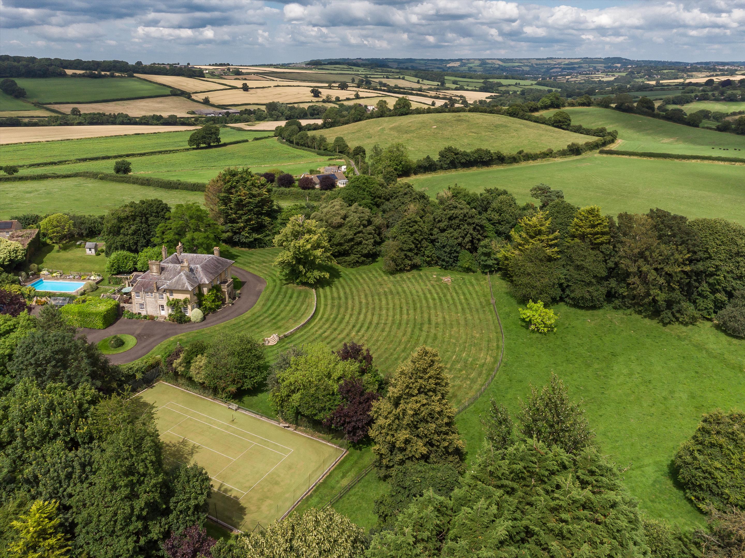 Beyond the garden is an attractive gate and estate railings which lead into the well-maintained pastureland and woodland, currently grazed with sheep. There is a heated outdoor swimming pool and an astro tennis court. The outbuildings include a double garage, workshop, log store and garden store. The land extends to about 20.32 acres in total.