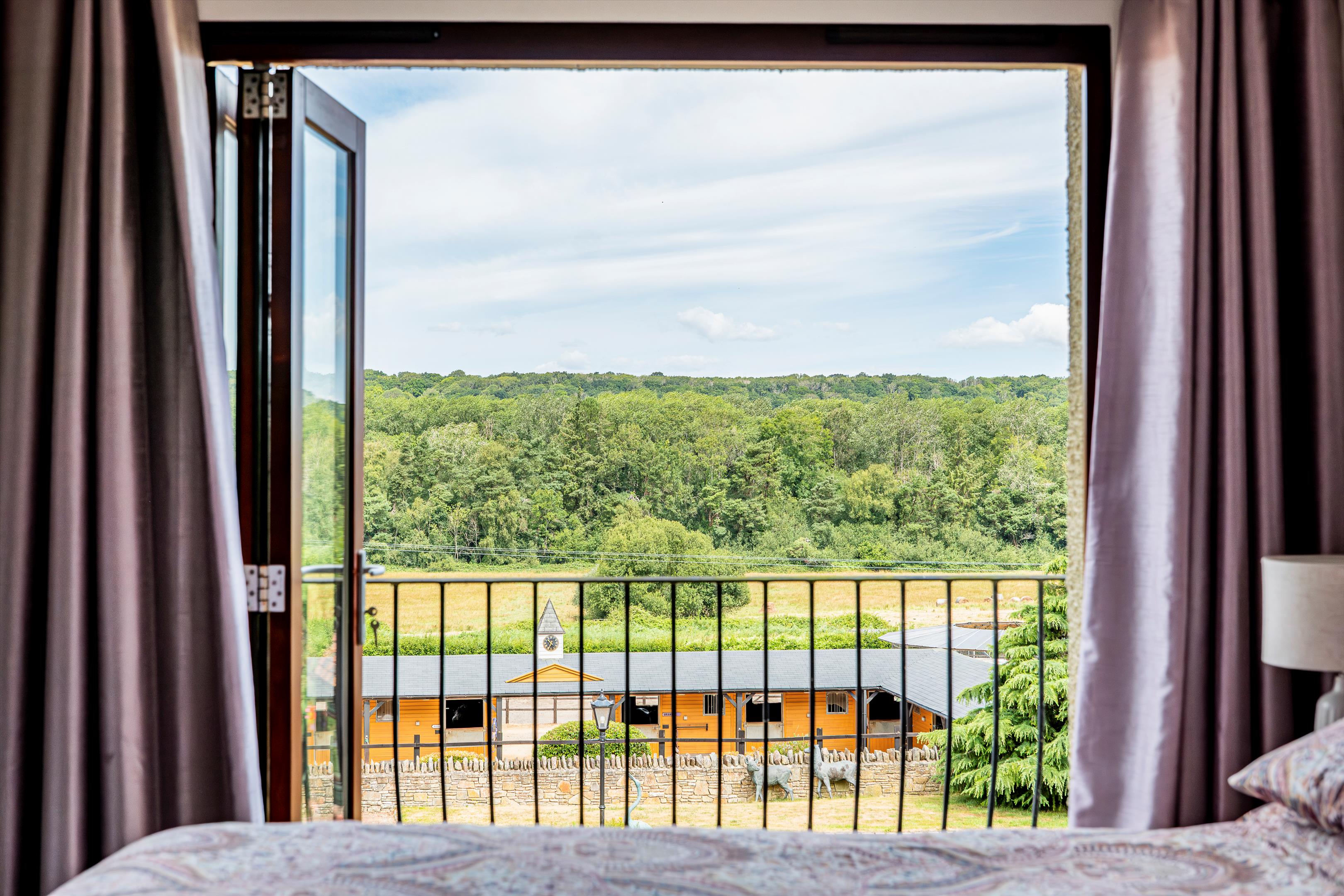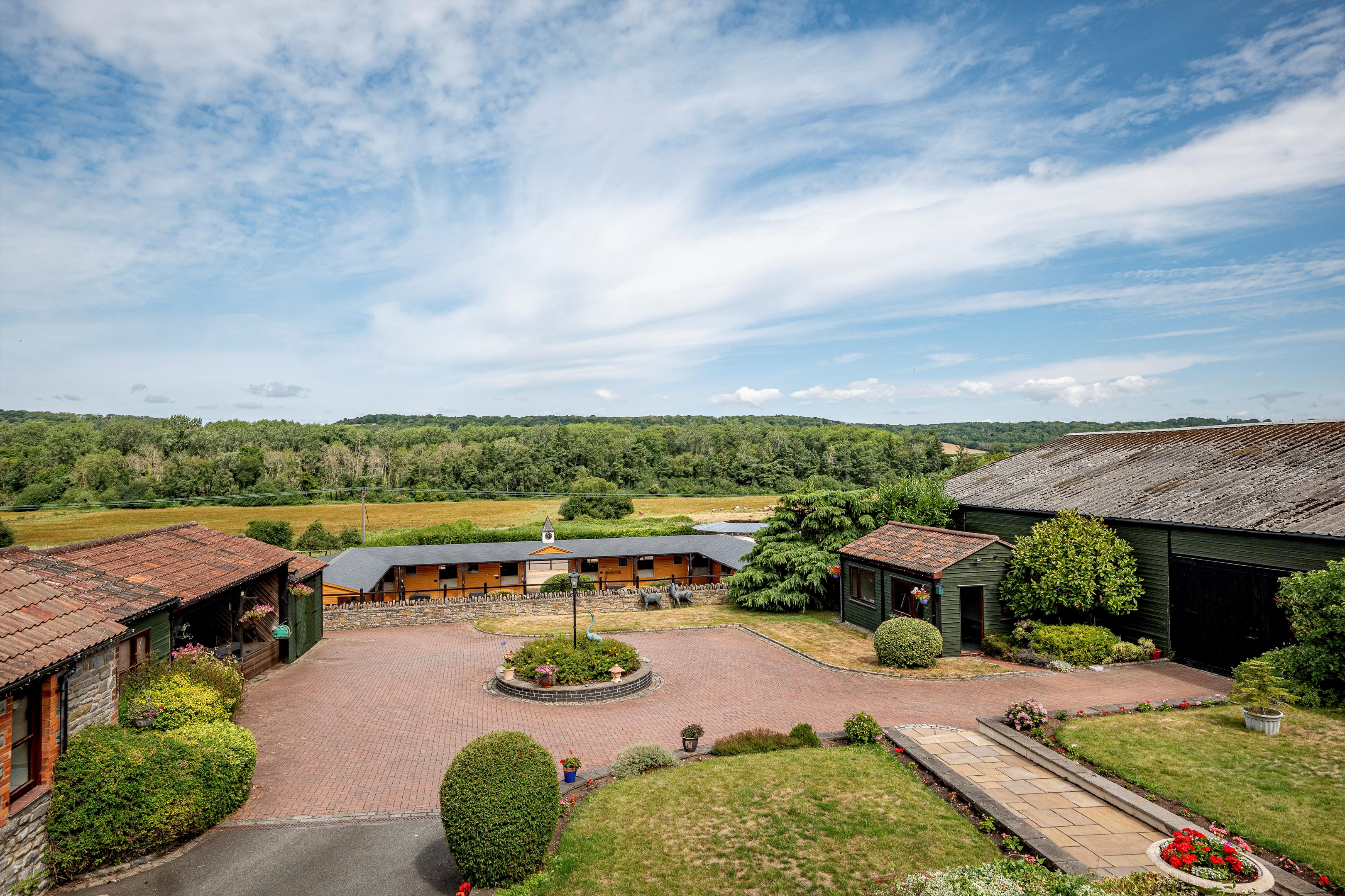 The west drive gives access to Vine Cottage and a turning circle with raised circular bed, part walled courtyard, terrace and garden. Grouped within the courtyard are The Lodge and The Stables, both of which provide ancillary accommodation/air BNBs and each have an open plan living room with kitchen area, and bedroom with en suite shower room. Adjoining is a home office, WC, double carport and single garage. Across the courtyard is a further outbuilding used as a gym, and there is pedestrian access to the livery yard and land, from the courtyard.