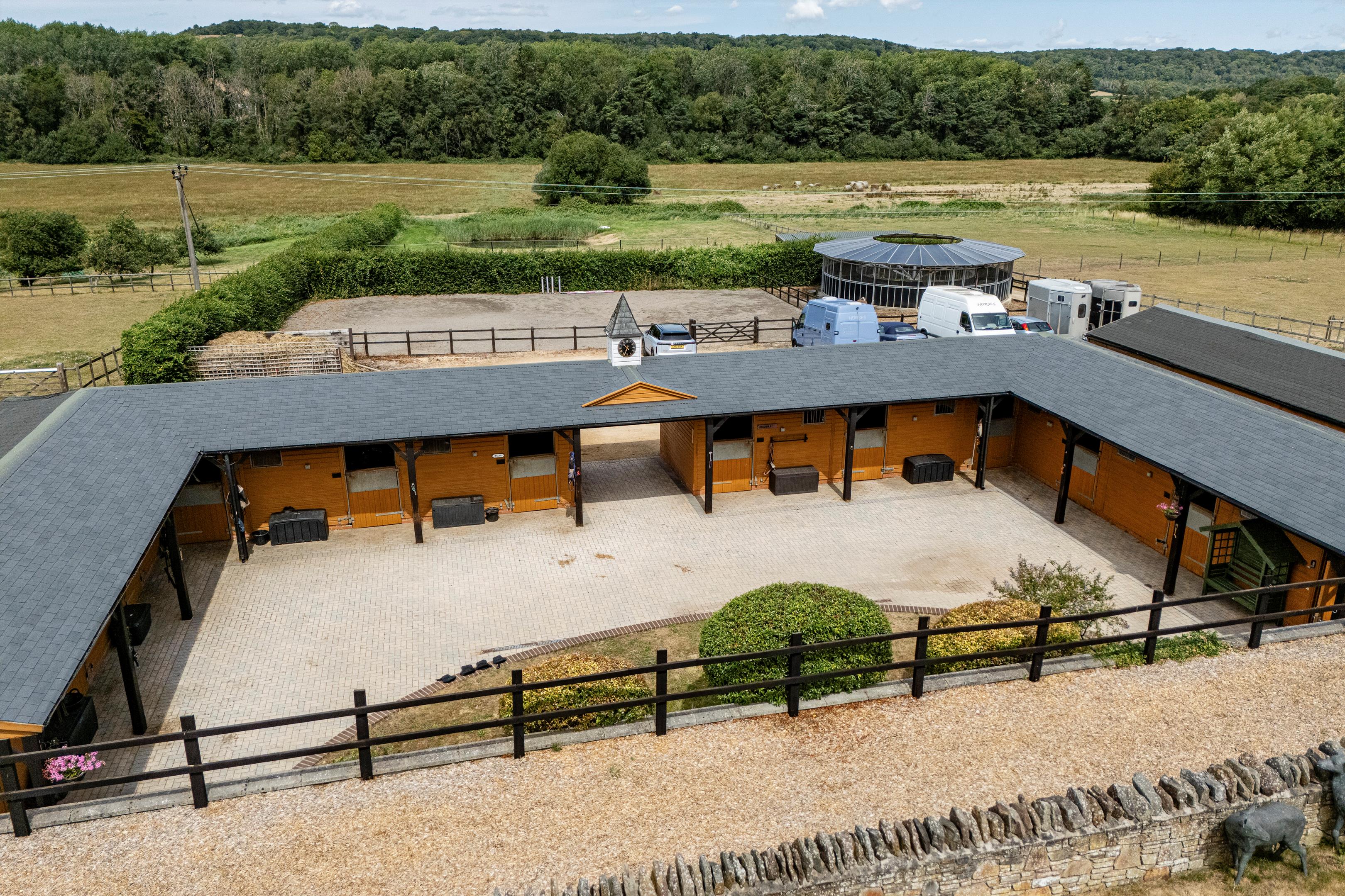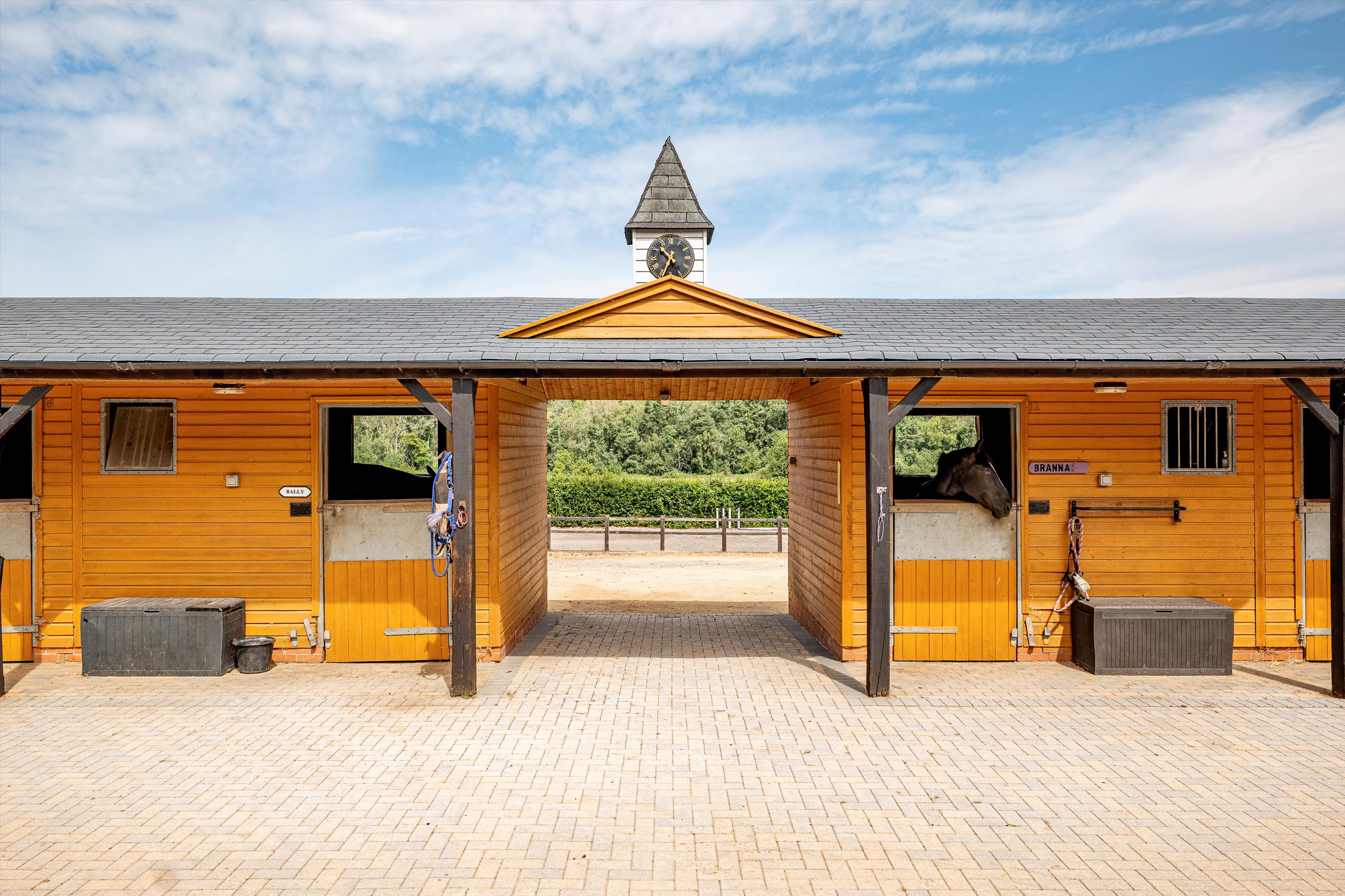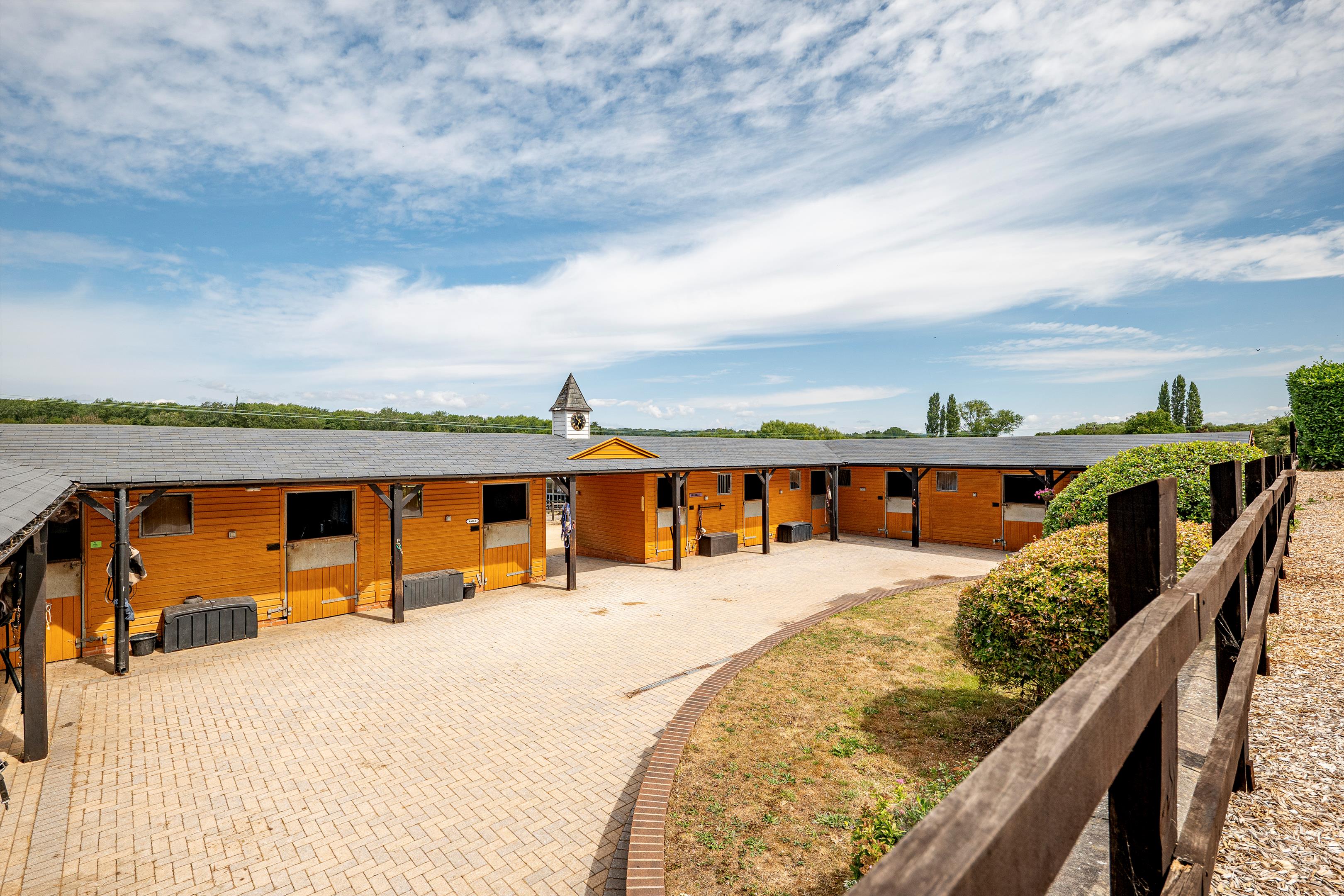 The livery yard has been run for many years as a very successful business on a DIY basis. The east drive leads to the livery yard and a large parking area for trailers and horse boxes. There are two excellent purpose built timber stable blocks each with yard, and are of half H in design. One block comprises 10/12 stables and the other block