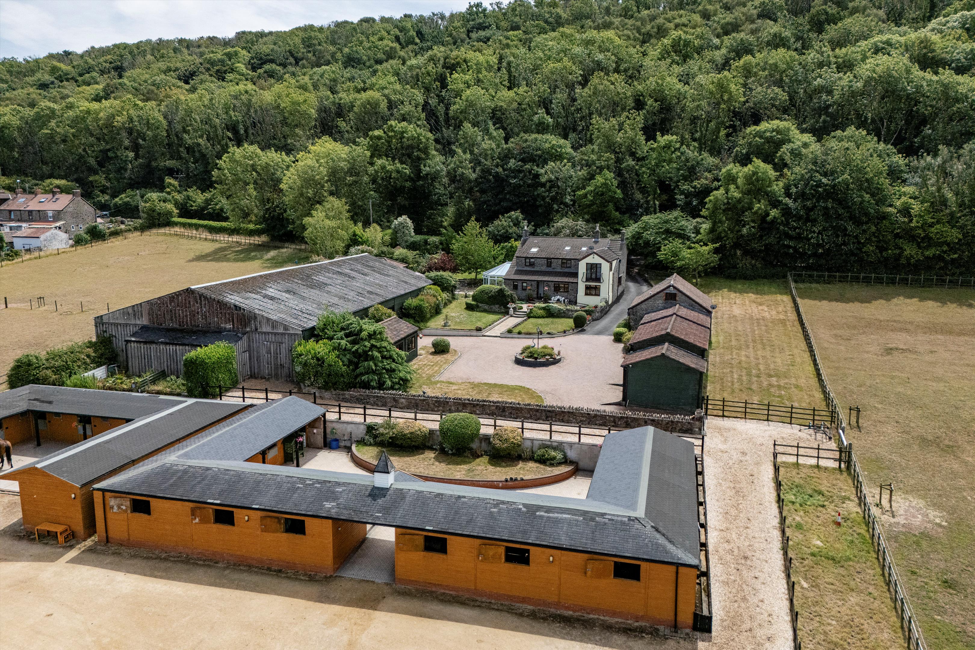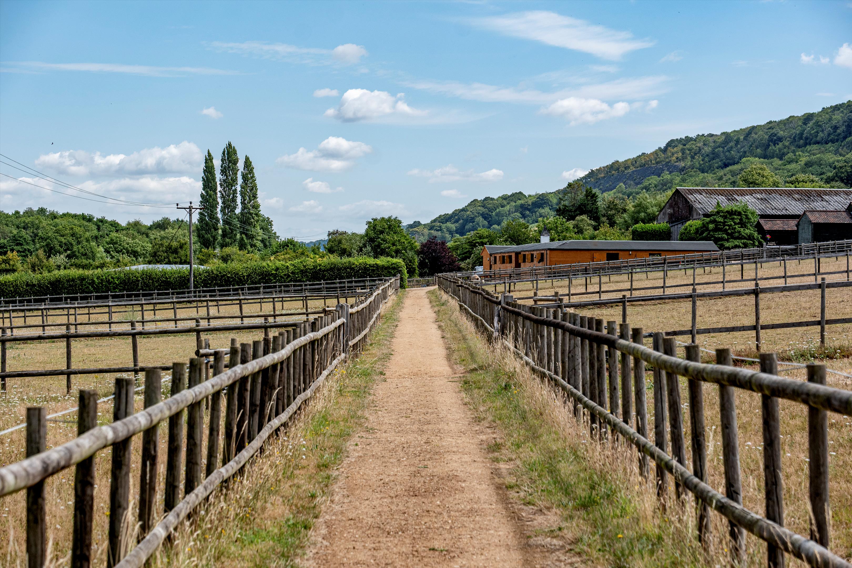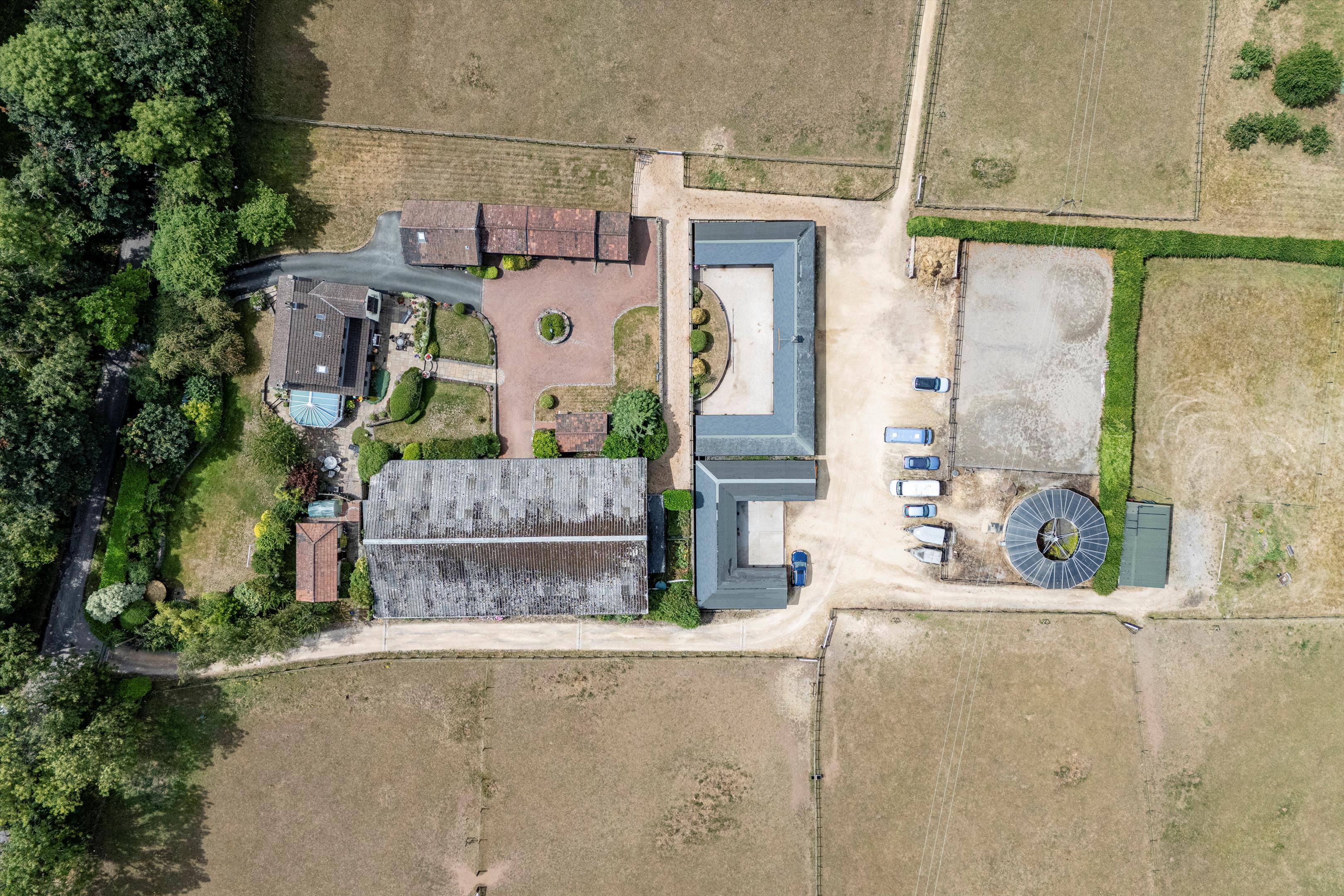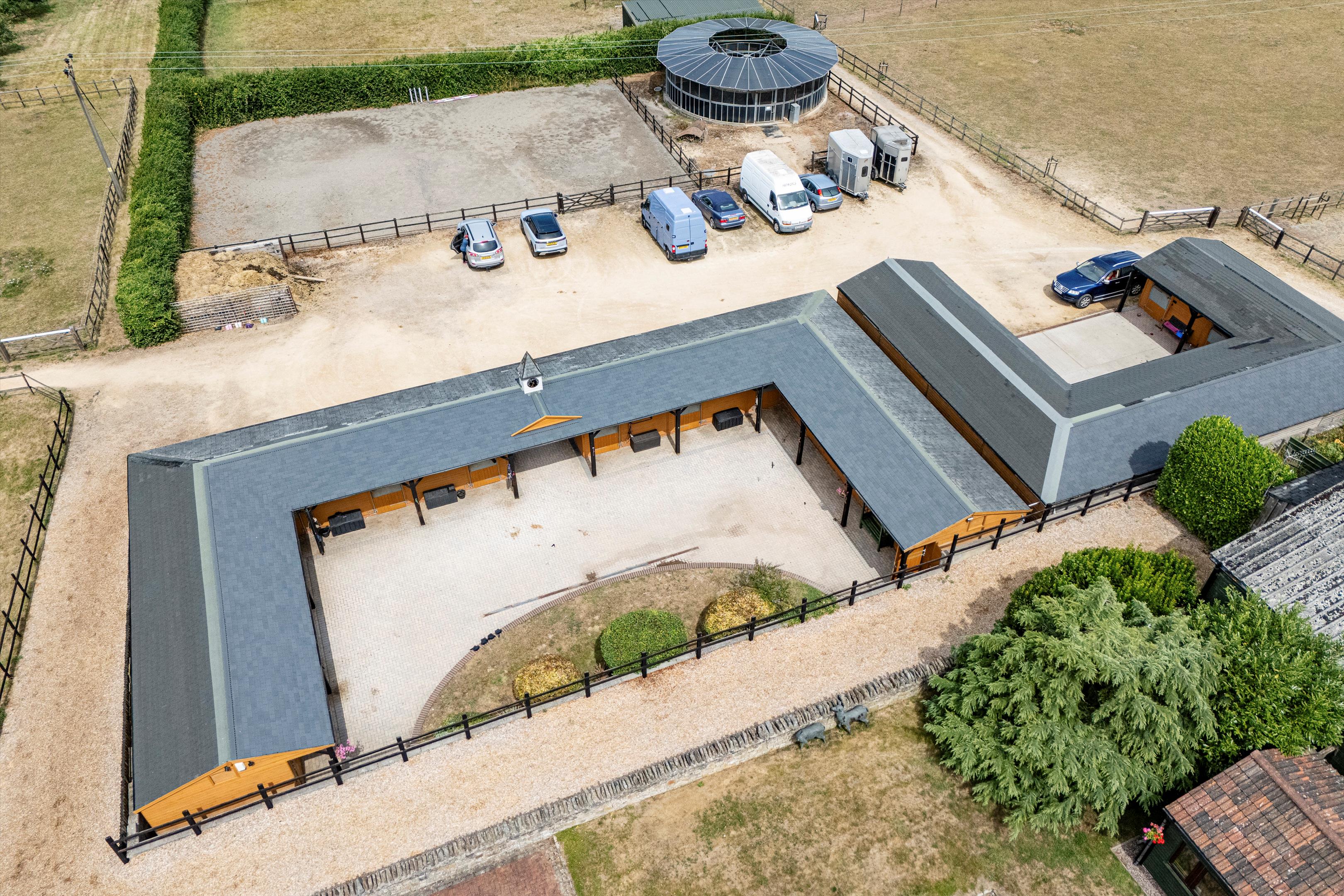 The livery yard has been run for many years as a very successful business on a DIY basis. The east drive leads to the livery yard and a large parking area for trailers and horse boxes. There are two excellent purpose built timber stable blocks each with yard, and are of half H in design. One block comprises 10/12 stables and the other block