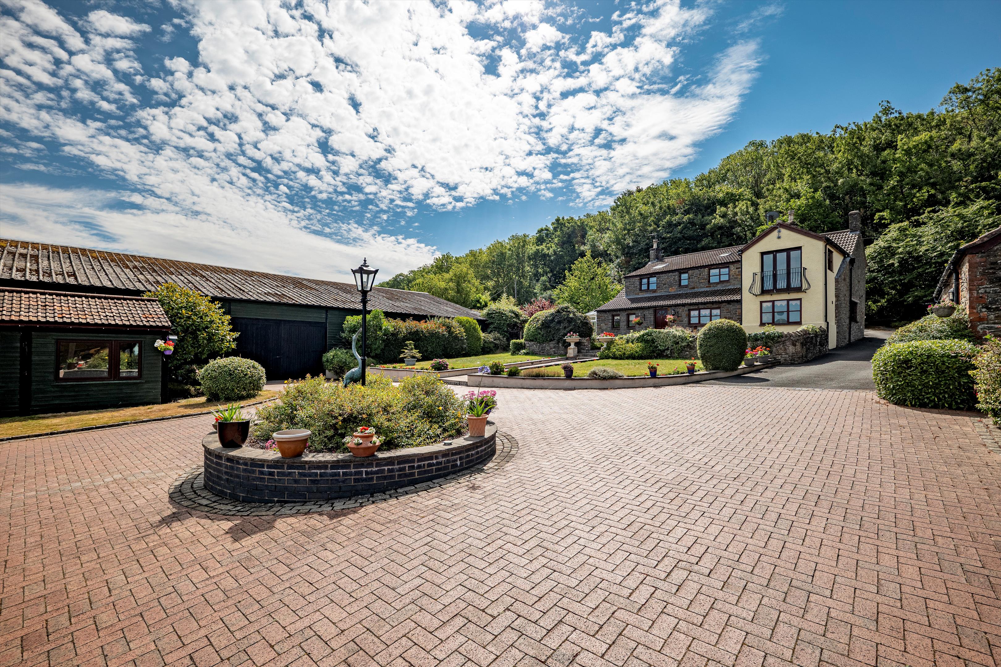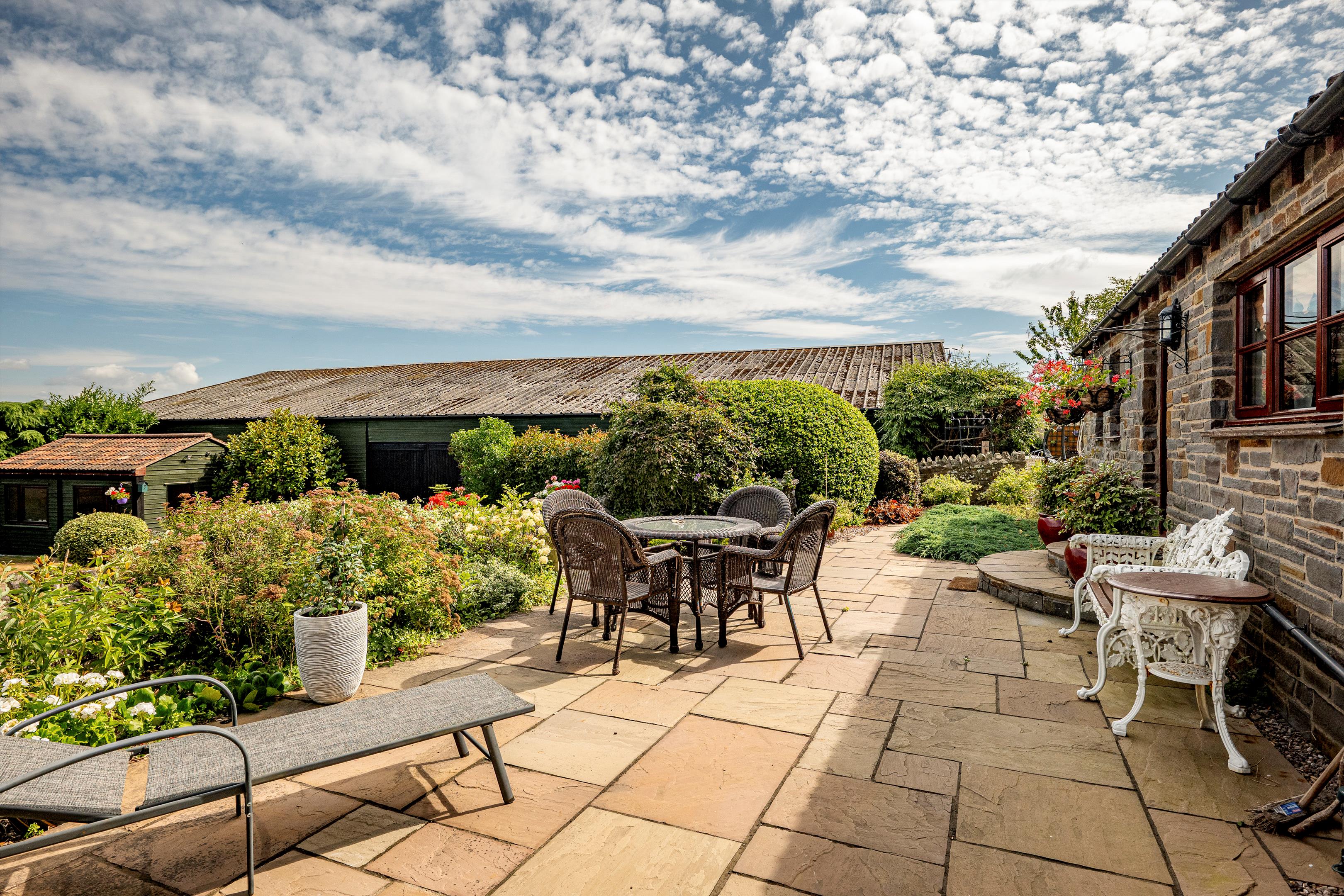 The pretty south facing gardens are hidden from the lane by well established tall shrubs and trees. There is an expanse of private level lawn, raised borders, and mixed shrubbery beds. From the lawn, to the east, steps lead down to a paved area outside the conservatory. The paved area, with borders of shrubs continues to the rear of the property and to a paved terrace, with stunning views to Gordano woods. Borders are planted with a variety of shrubs and plants, and central steps with lawn on either side, lead down to the courtyard.