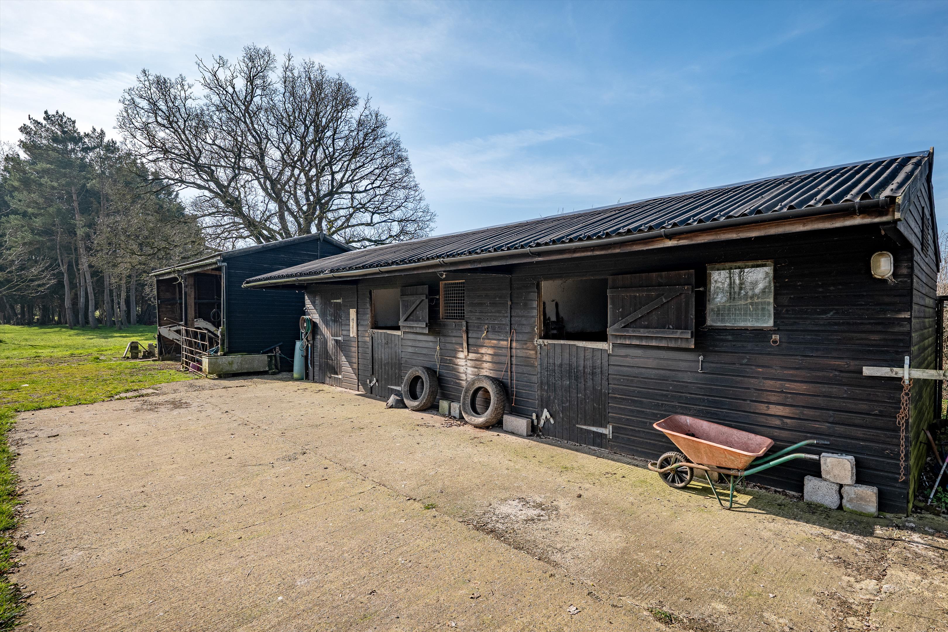 A range of outbuildings accompanies the main house, including two stables with an adjoining tack room, a hay store with an attached log store, several additional stores, and a hen house. There is also a larger double doored barn, with mains water and electricity serving both the stable block and tack room.