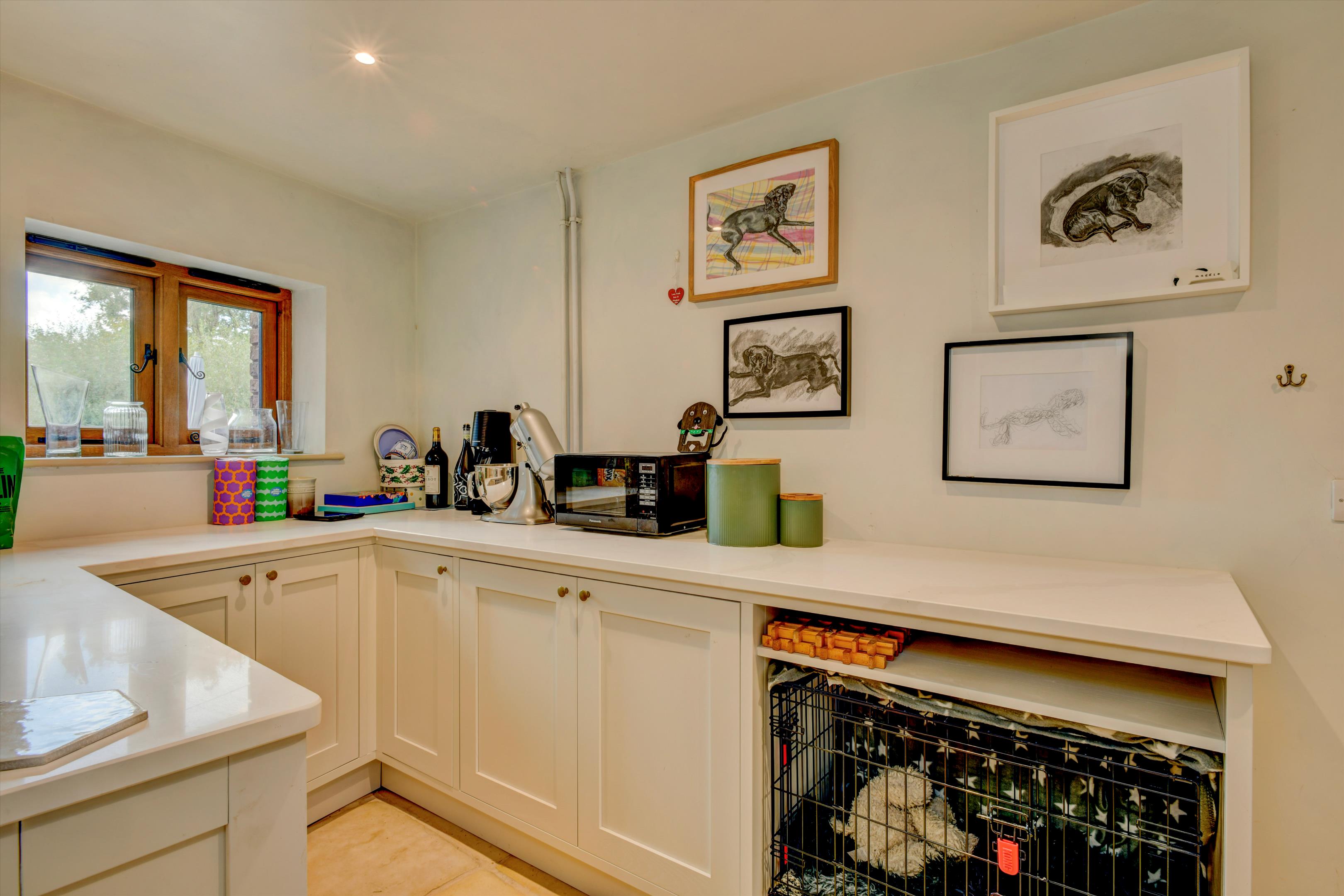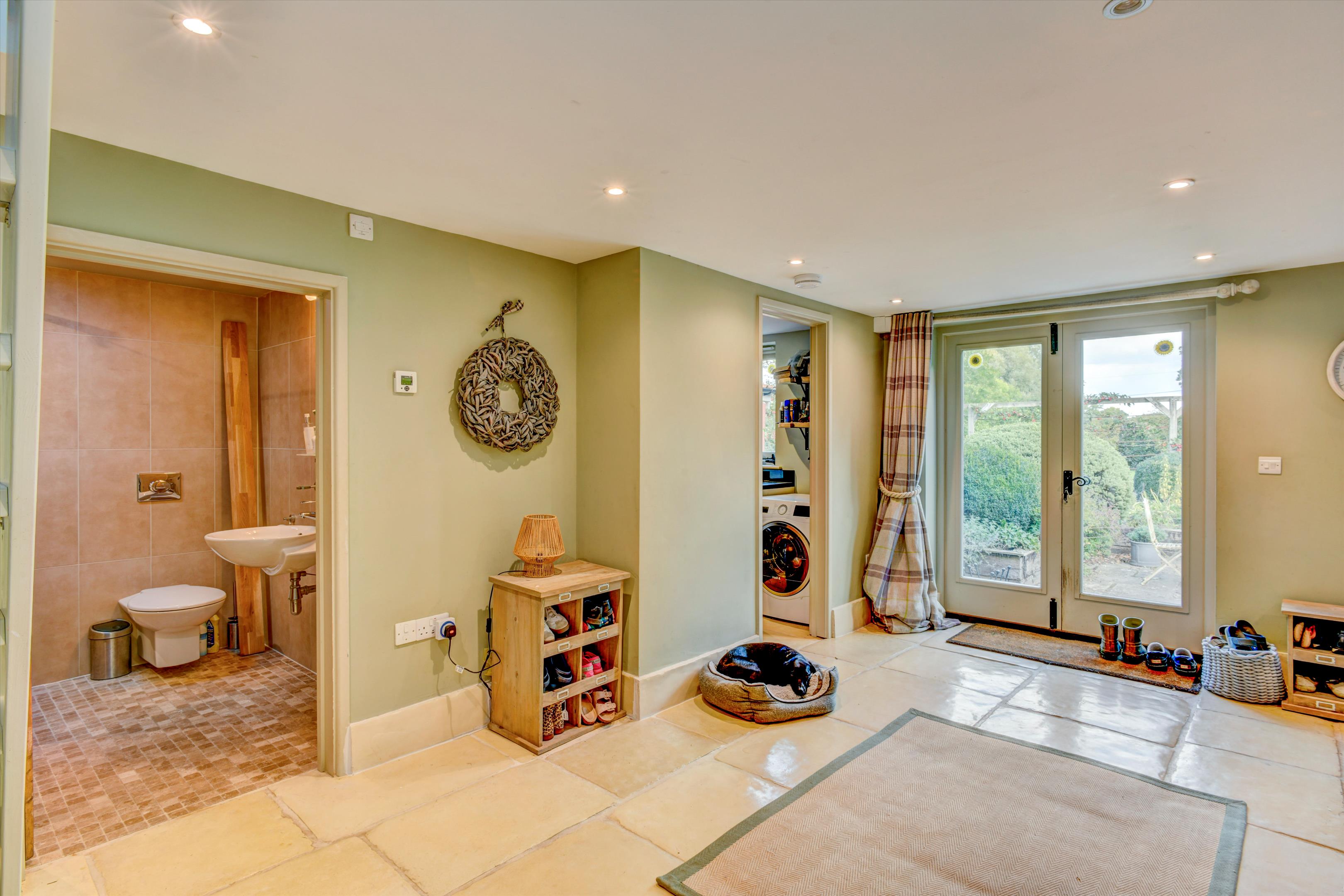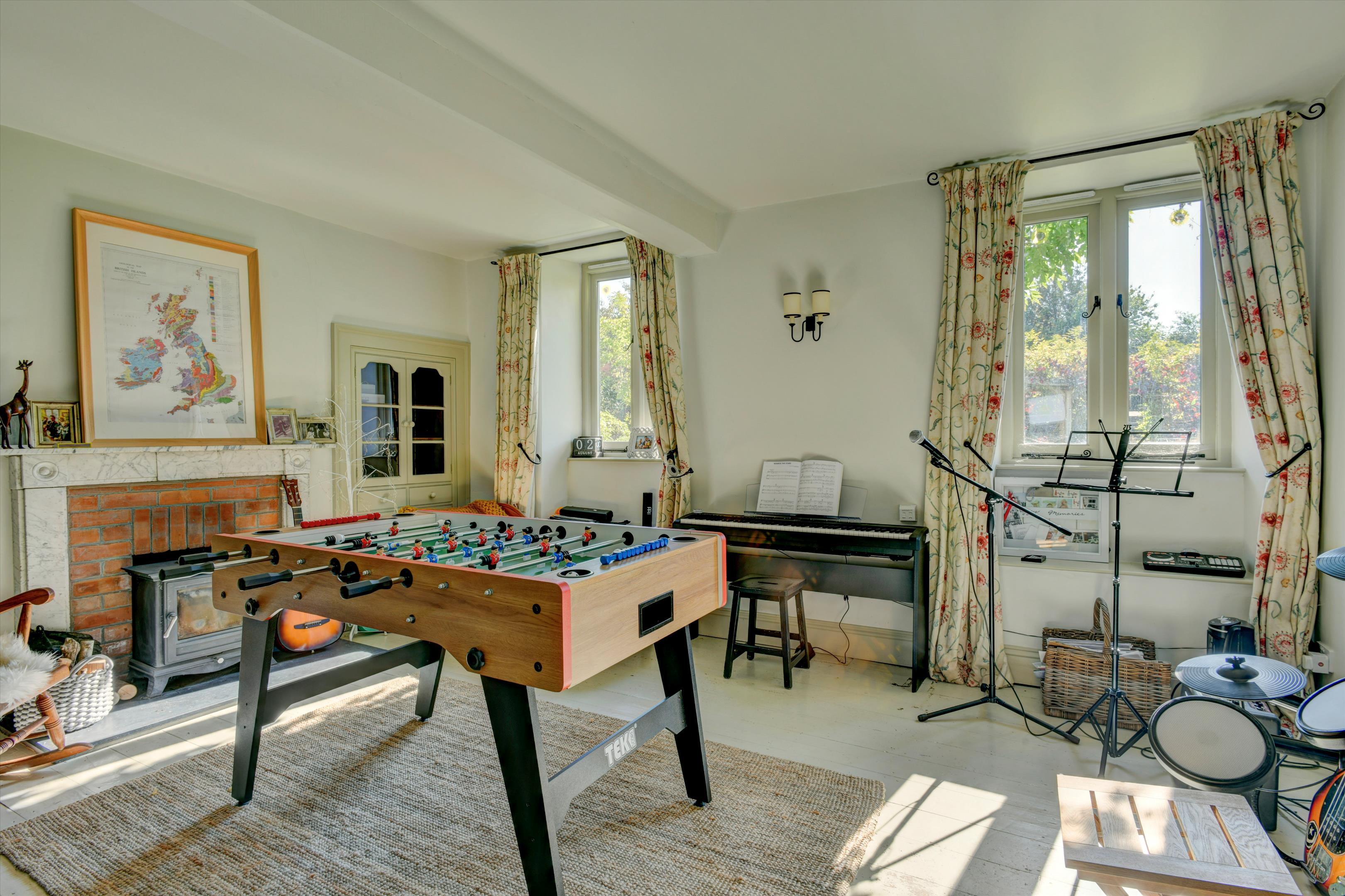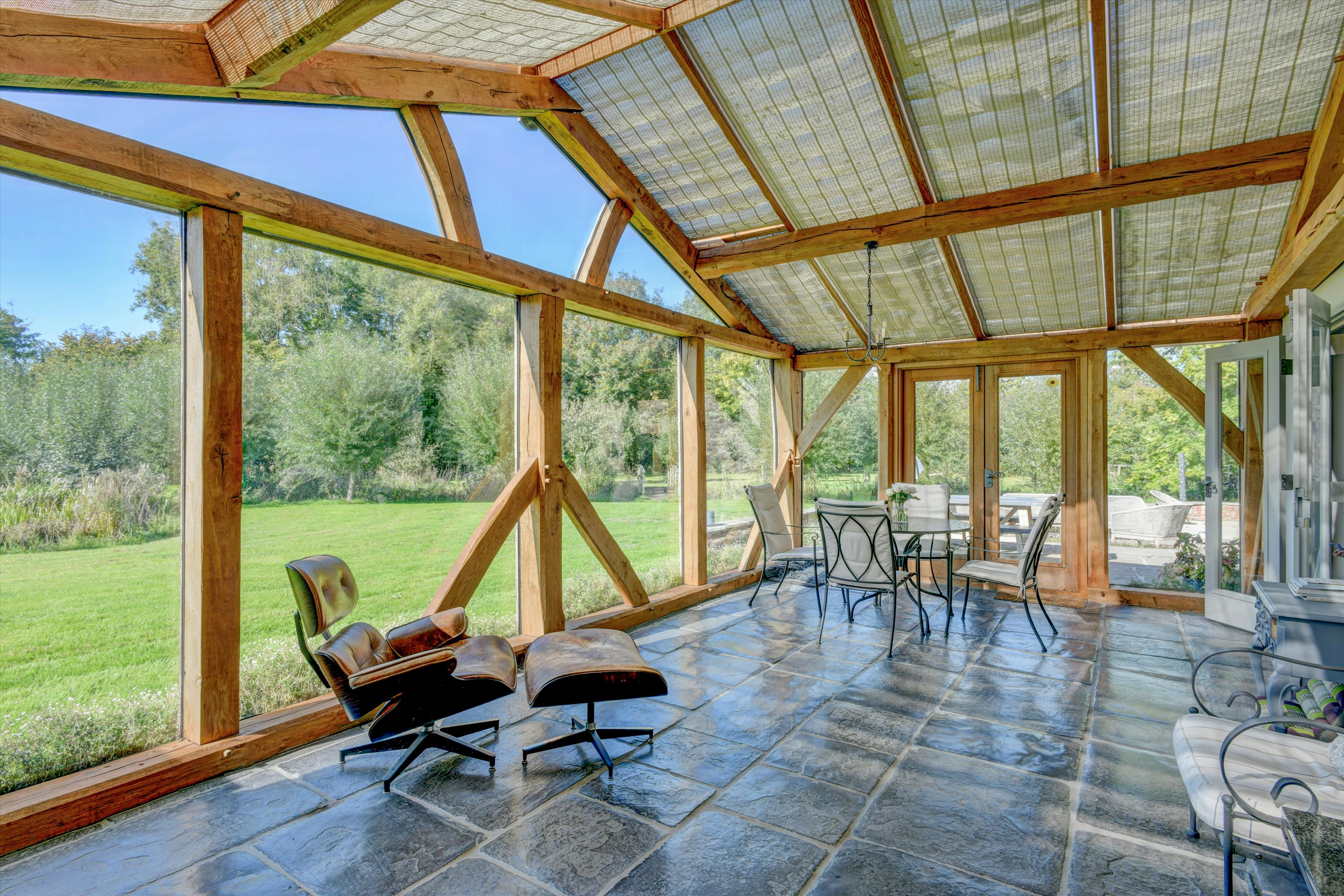 Rendy Farm is a historic and charming south-facing period farmhouse, set well back from a small country road at the end of an entrance driveway, overlooking its beautiful and extensive gardens and grounds, in a quiet, rural setting. Although believed to date back around 400 years, the house has been sympathetically renovated and extended to a very high standard and the current owners have added further improvements. There are many period features such as exposed beams and ceiling timbers , flagstone floors and attractive fireplaces, thus combining period character and charm with the comforts of modern living. There is very spacious and comfortable family accommodation. The fireplaces in the sitting room, music room and snug all have woodburners and the large sitting room has French doors out to the terrace and gardens. The kitchen is fitted Neptune with hand painted cupboards, an island within induction hob and a four oven AGA and stone tiled floor. A fitted side kitchen has convection oven, additional fridge and wine fridge. The dining area boasts exposed wood boarded flooring and opens into the lovely, light and spacious glazed and oak framed garden room with stone paved