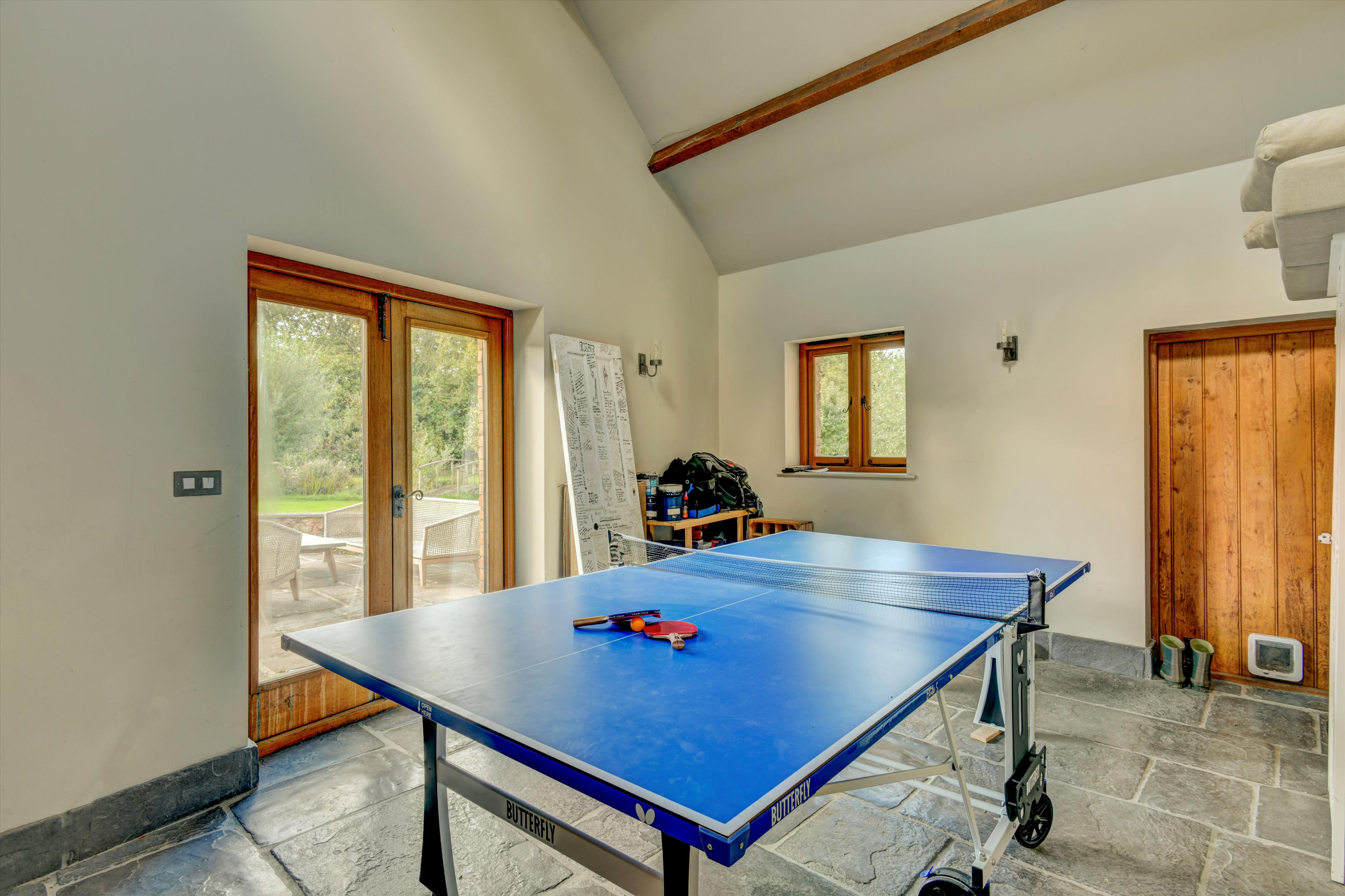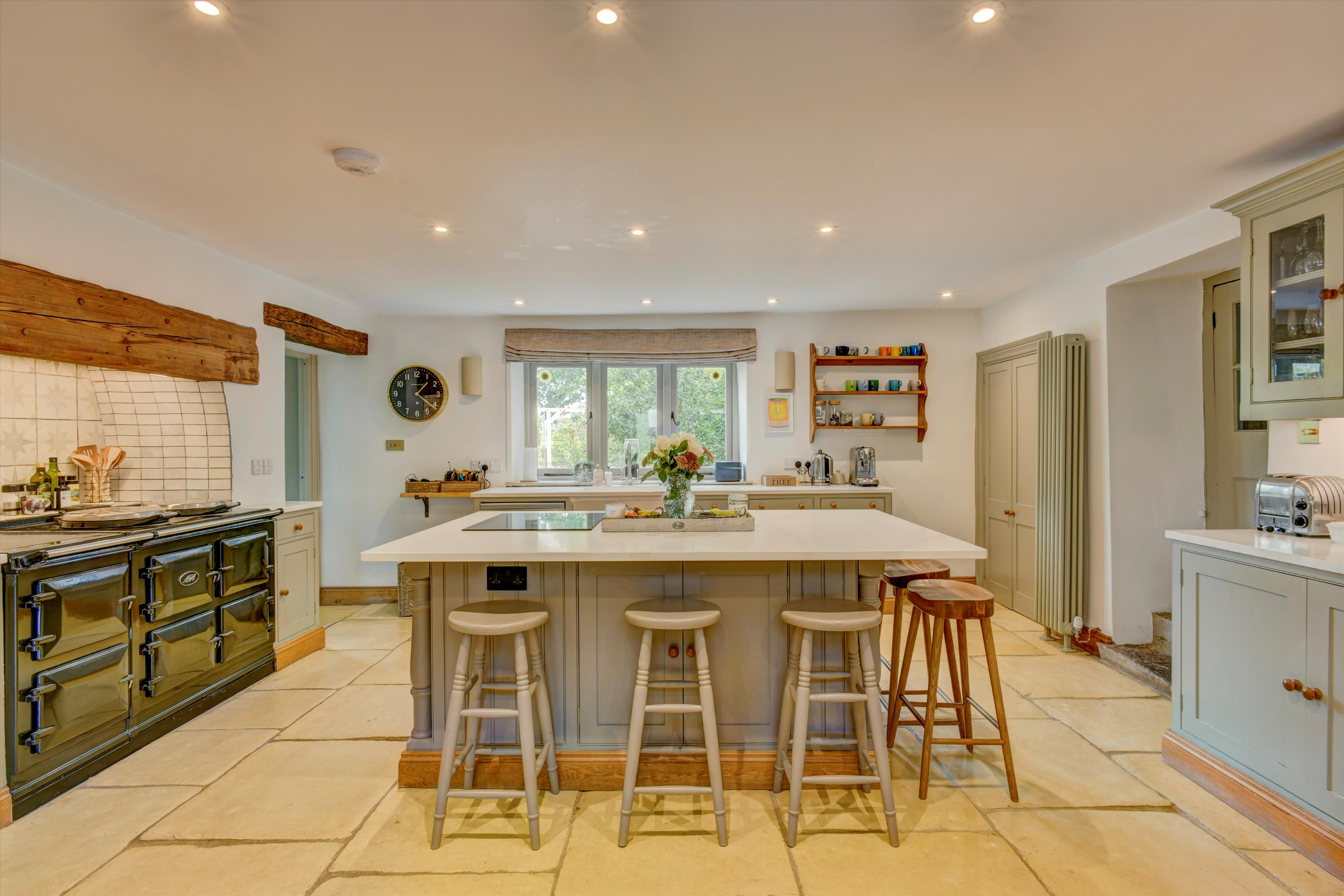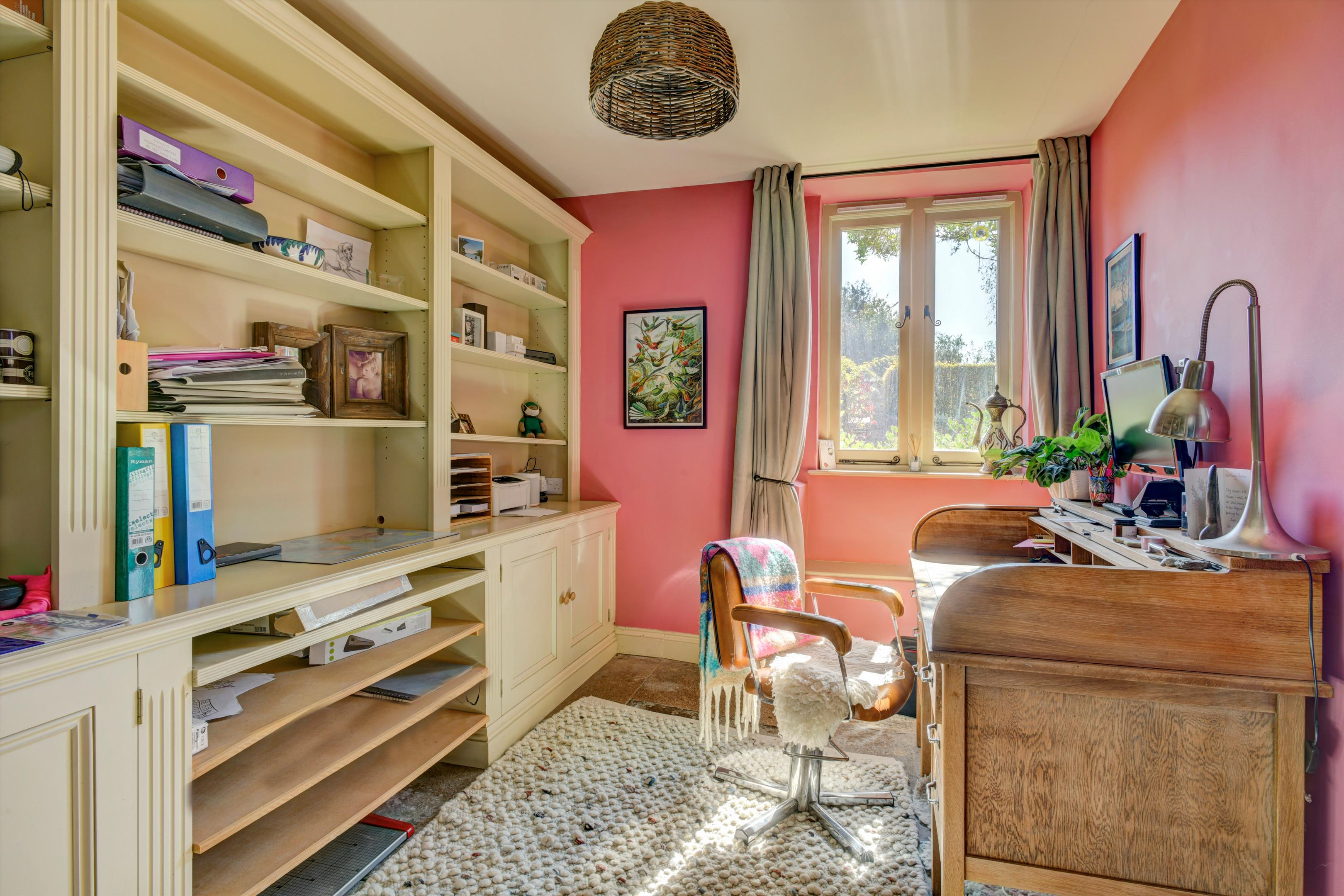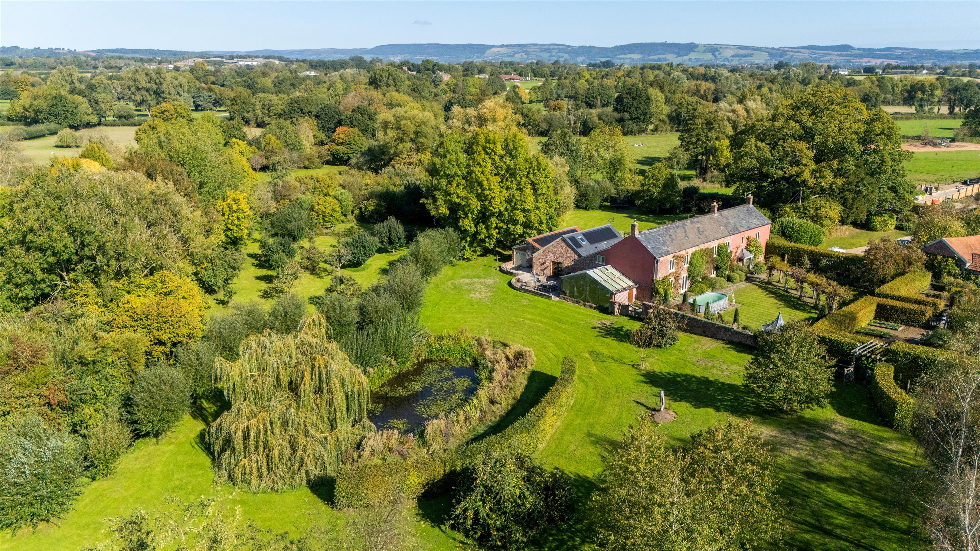 Rendy Farm is a historic and charming south-facing period farmhouse, set well back from a small country road at the end of an entrance driveway, overlooking its beautiful and extensive gardens and grounds, in a quiet, rural setting. Although believed to date back around 400 years, the house has been sympathetically renovated and extended to a very high standard and the current owners have added further improvements. There are many period features such as exposed beams and ceiling timbers , flagstone floors and attractive fireplaces, thus combining period character and charm with the comforts of modern living. There is very spacious and comfortable family accommodation. The fireplaces in the sitting room, music room and snug all have woodburners and the large sitting room has French doors out to the terrace and gardens. The kitchen is fitted Neptune with hand painted cupboards, an island within induction hob and a four oven AGA and stone tiled floor. A fitted side kitchen has convection oven, additional fridge and wine fridge. The dining area boasts exposed wood boarded flooring and opens into the lovely, light and spacious glazed and oak framed garden room with stone paved