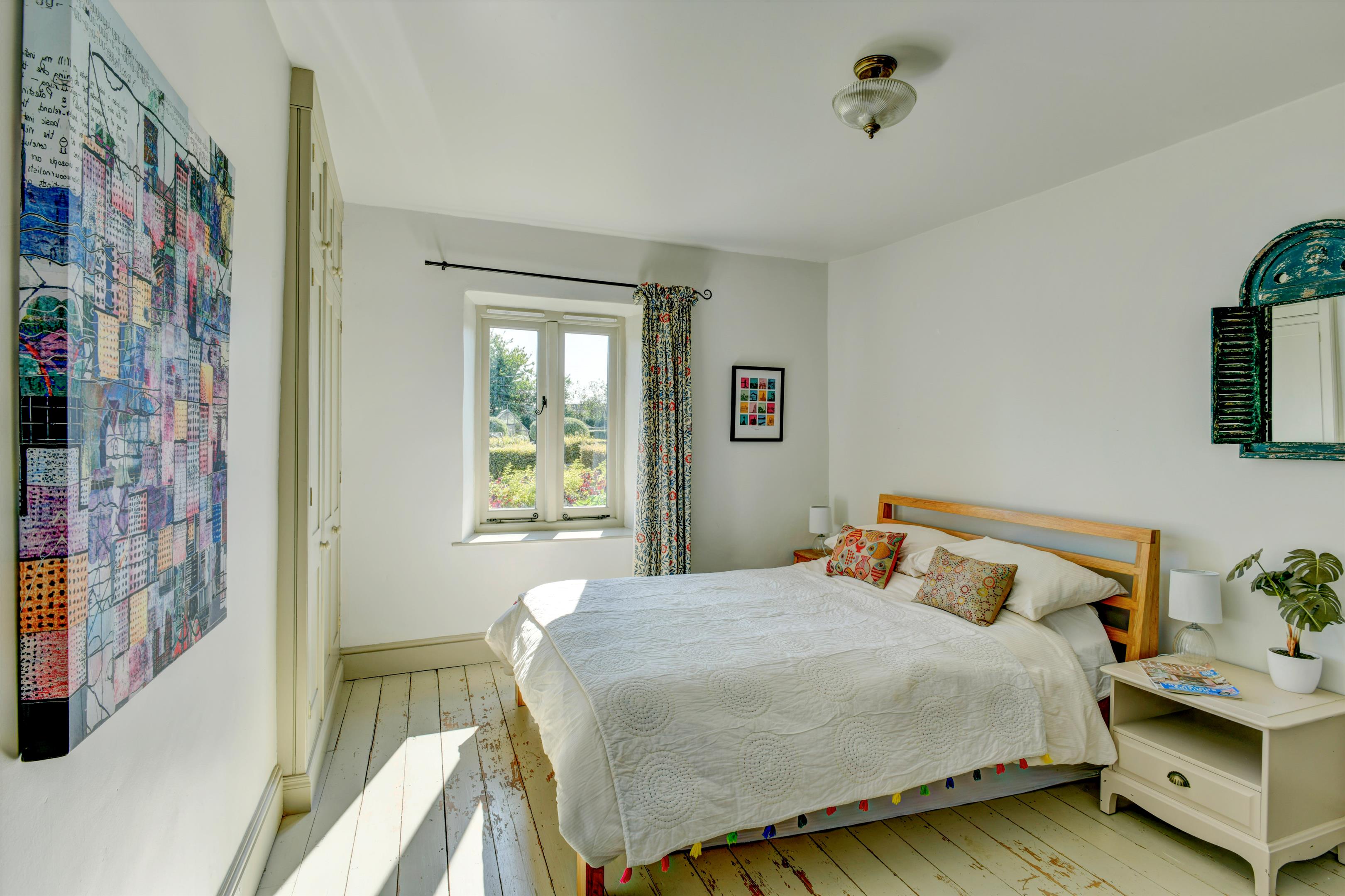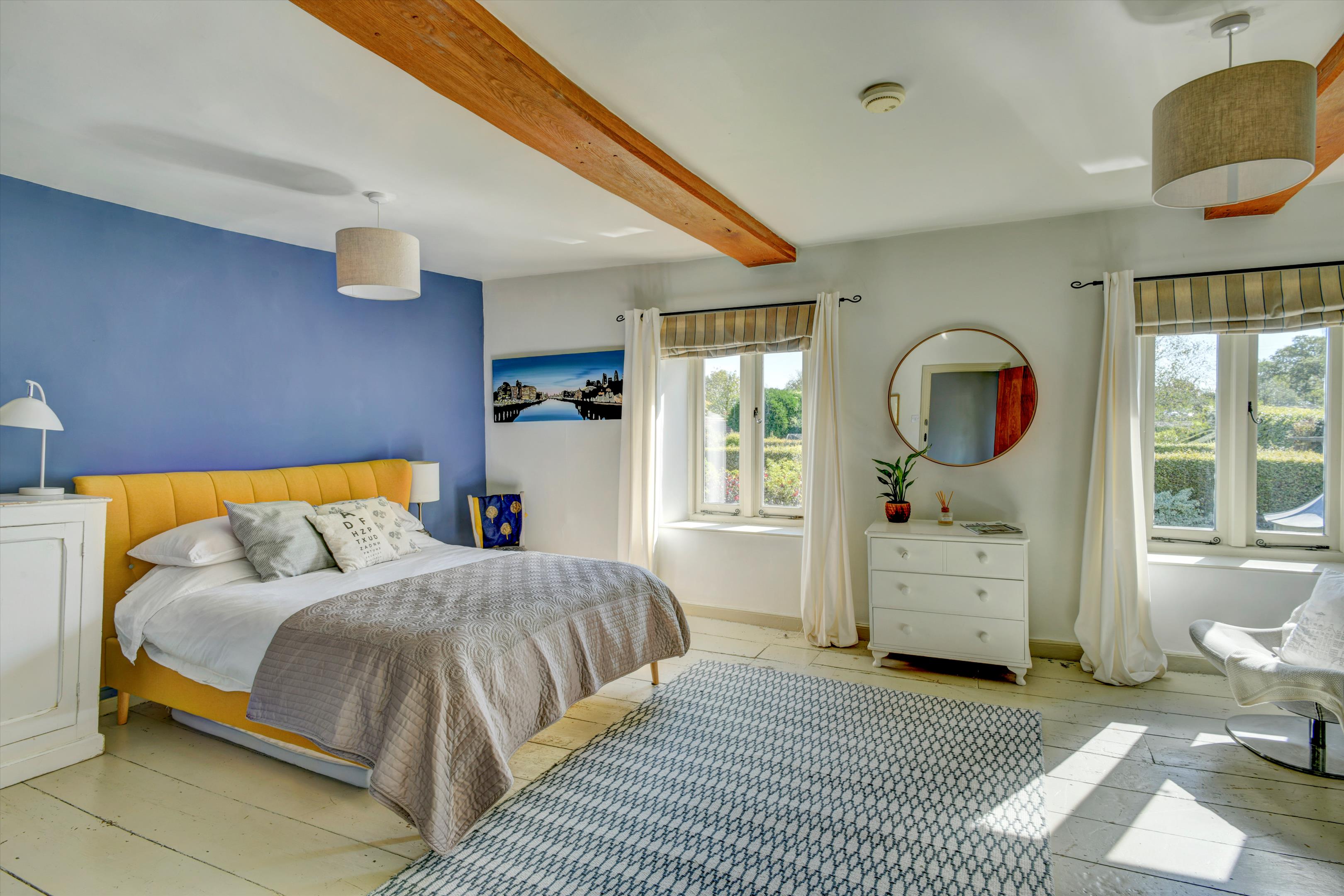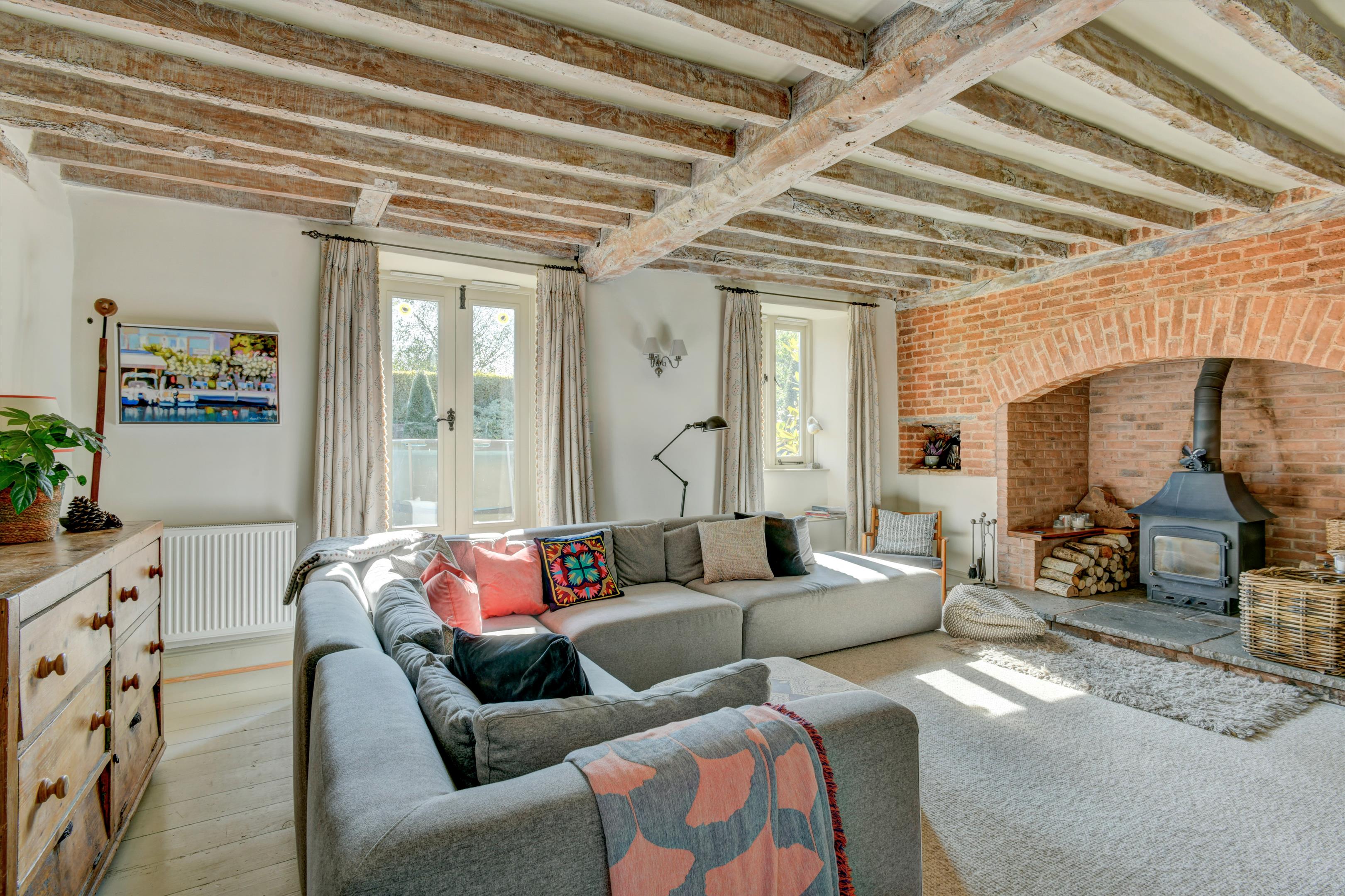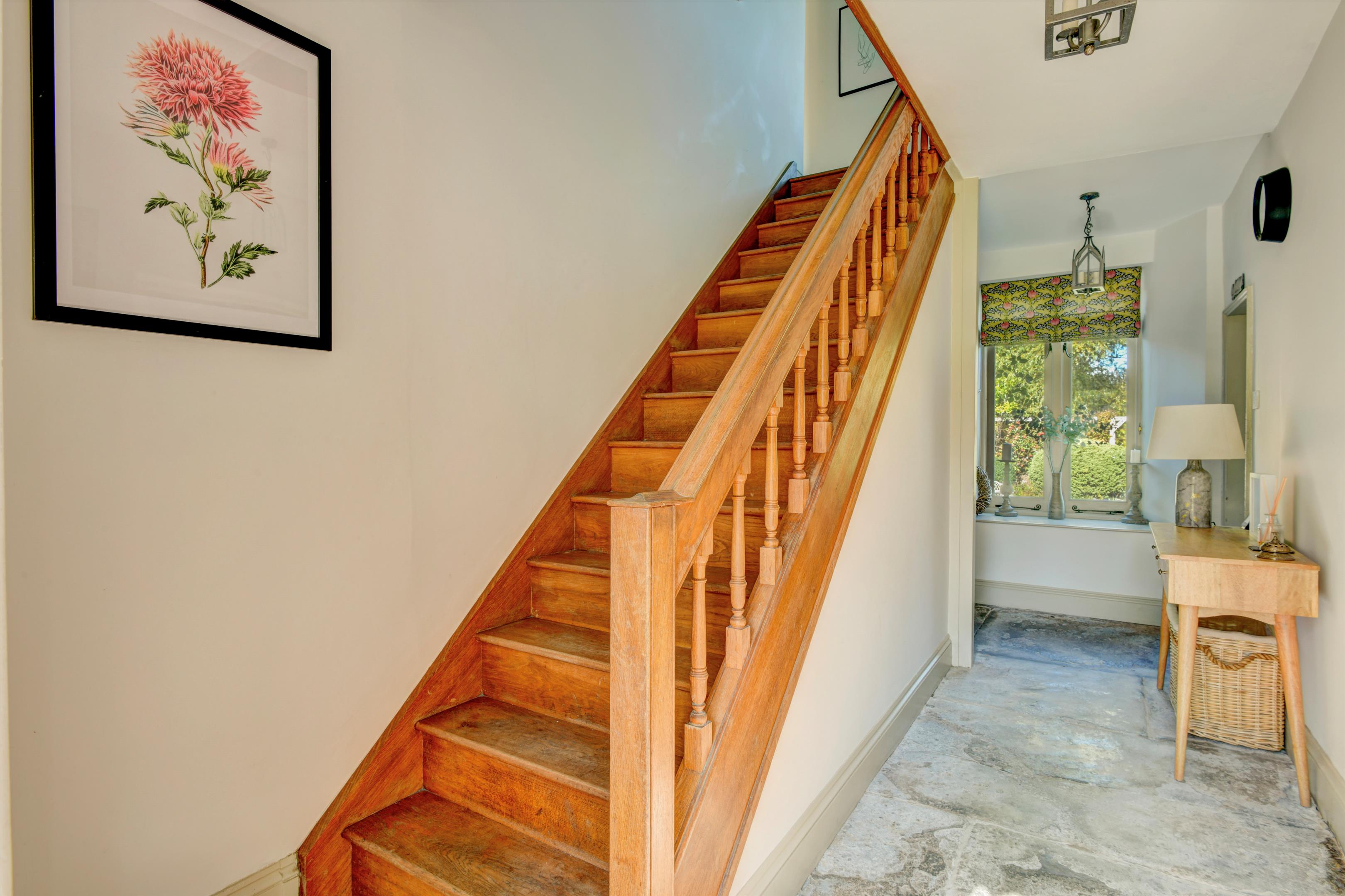 Rendy Farm is a historic and charming south-facing period farmhouse, set well back from a small country road at the end of an entrance driveway, overlooking its beautiful and extensive gardens and grounds, in a quiet, rural setting. Although believed to date back around 400 years, the house has been sympathetically renovated and extended to a very high standard and the current owners have added further improvements. There are many period features such as exposed beams and ceiling timbers , flagstone floors and attractive fireplaces, thus combining period character and charm with the comforts of modern living. There is very spacious and comfortable family accommodation. The fireplaces in the sitting room, music room and snug all have woodburners and the large sitting room has French doors out to the terrace and gardens. The kitchen is fitted Neptune with hand painted cupboards, an island within induction hob and a four oven AGA and stone tiled floor. A fitted side kitchen has convection oven, additional fridge and wine fridge. The dining area boasts exposed wood boarded flooring and opens into the lovely, light and spacious glazed and oak framed garden room with stone paved