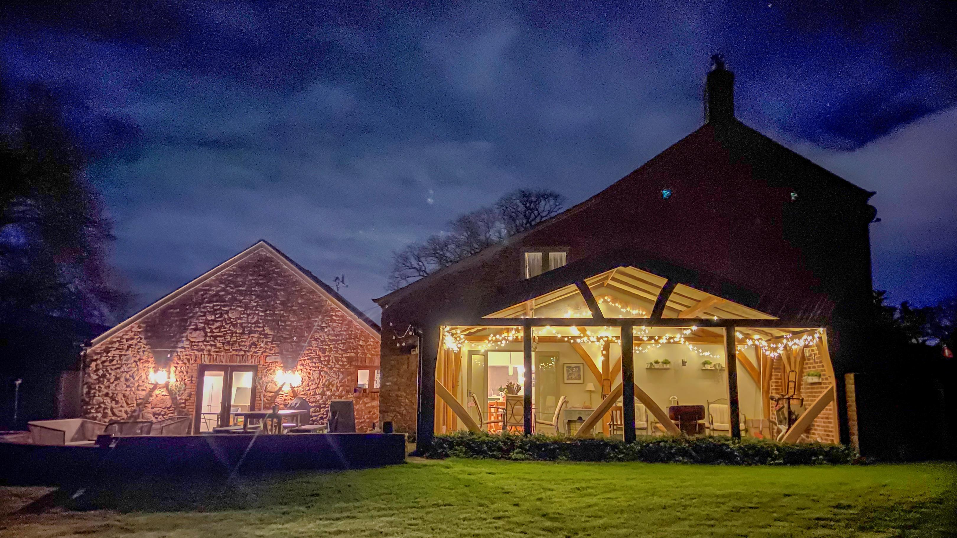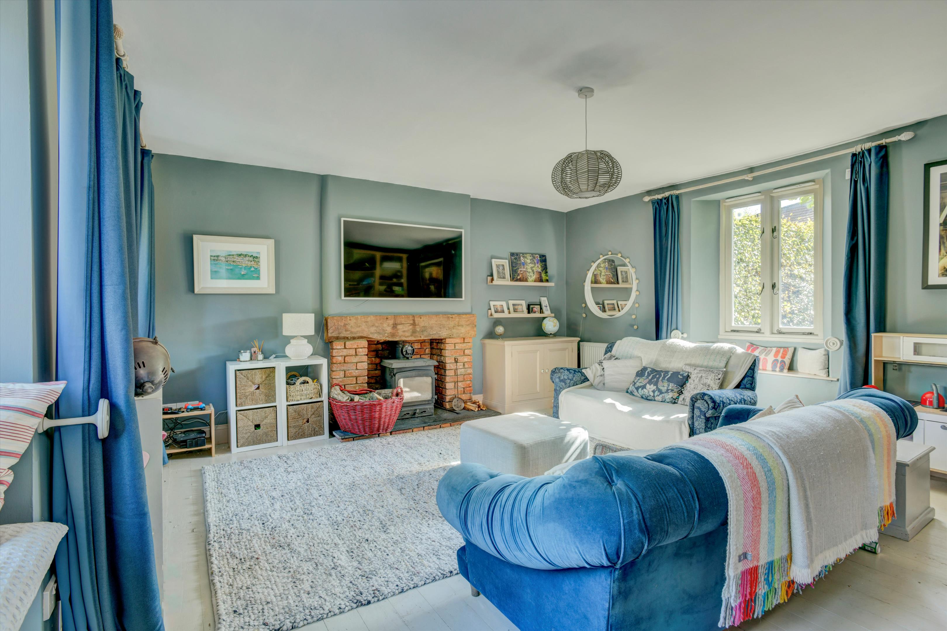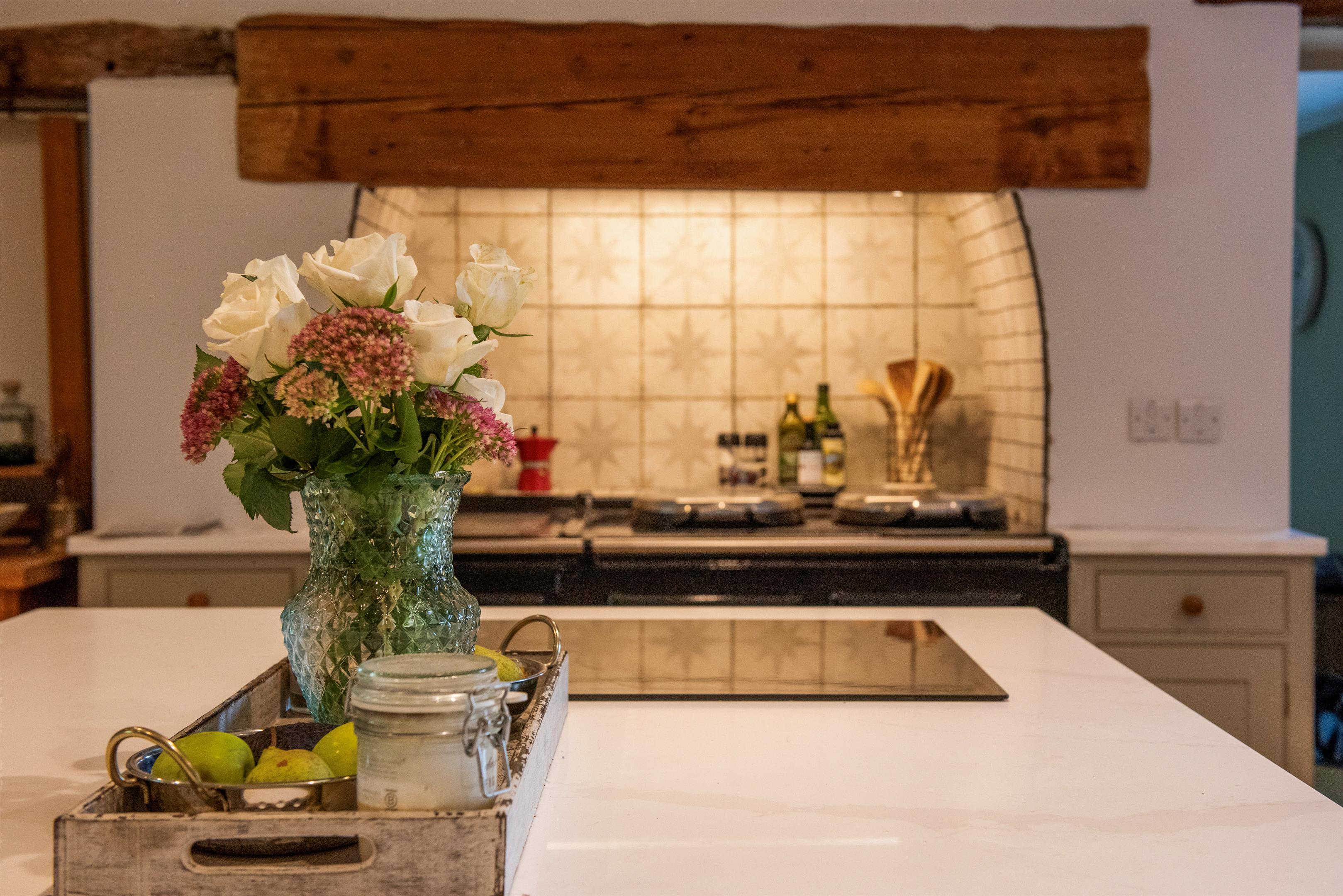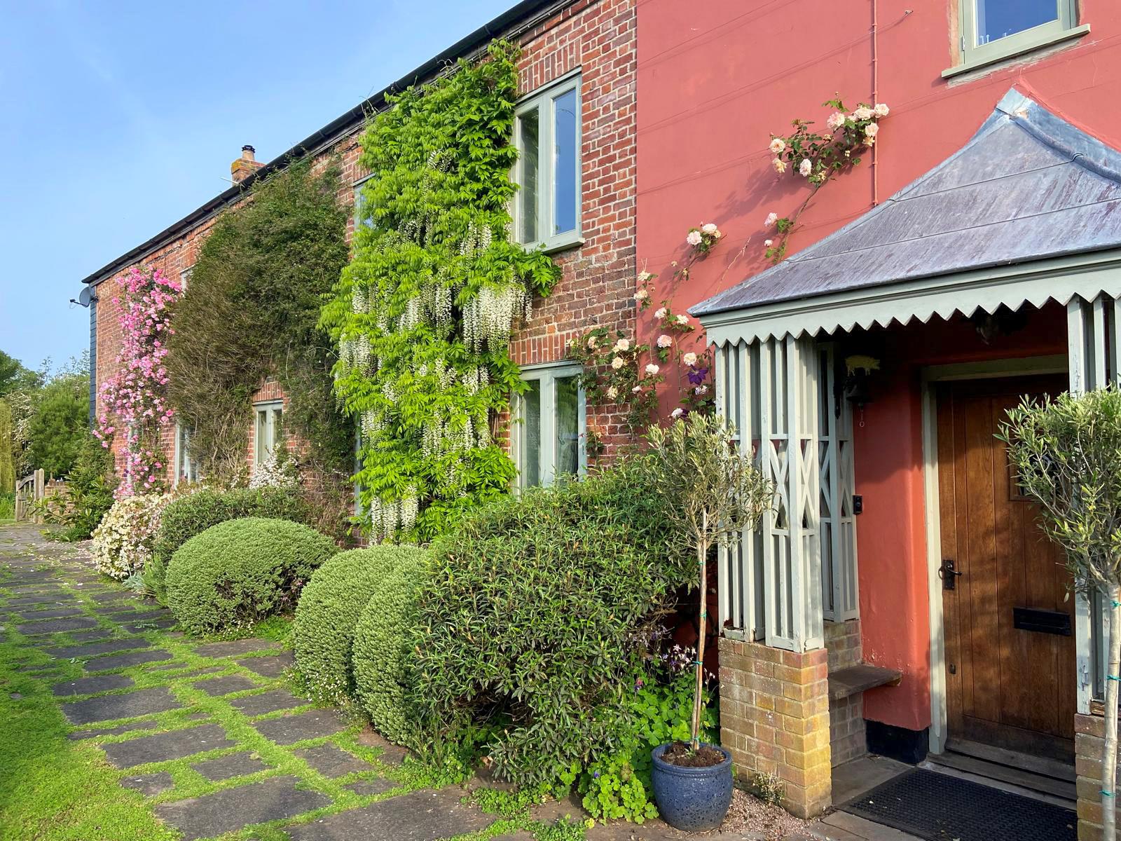Rendy Farm is a historic and charming south-facing period farmhouse, set well back from a small country road at the end of an entrance driveway, overlooking its beautiful and extensive gardens and grounds, in a quiet, rural setting. Although believed to date back around 400 years, the house has been sympathetically renovated and extended to a very high standard and the current owners have added further improvements. There are many period features such as exposed beams and ceiling timbers , flagstone floors and attractive fireplaces, thus combining period character and charm with the comforts of modern living. There is very spacious and comfortable family accommodation. The fireplaces in the sitting room, music room and snug all have woodburners and the large sitting room has French doors out to the terrace and gardens. The kitchen is fitted Neptune with hand painted cupboards, an island within induction hob and a four oven AGA and stone tiled floor. A fitted side kitchen has convection oven, additional fridge and wine fridge. The dining area boasts exposed wood boarded flooring and opens into the lovely, light and spacious glazed and oak framed garden room with stone paved