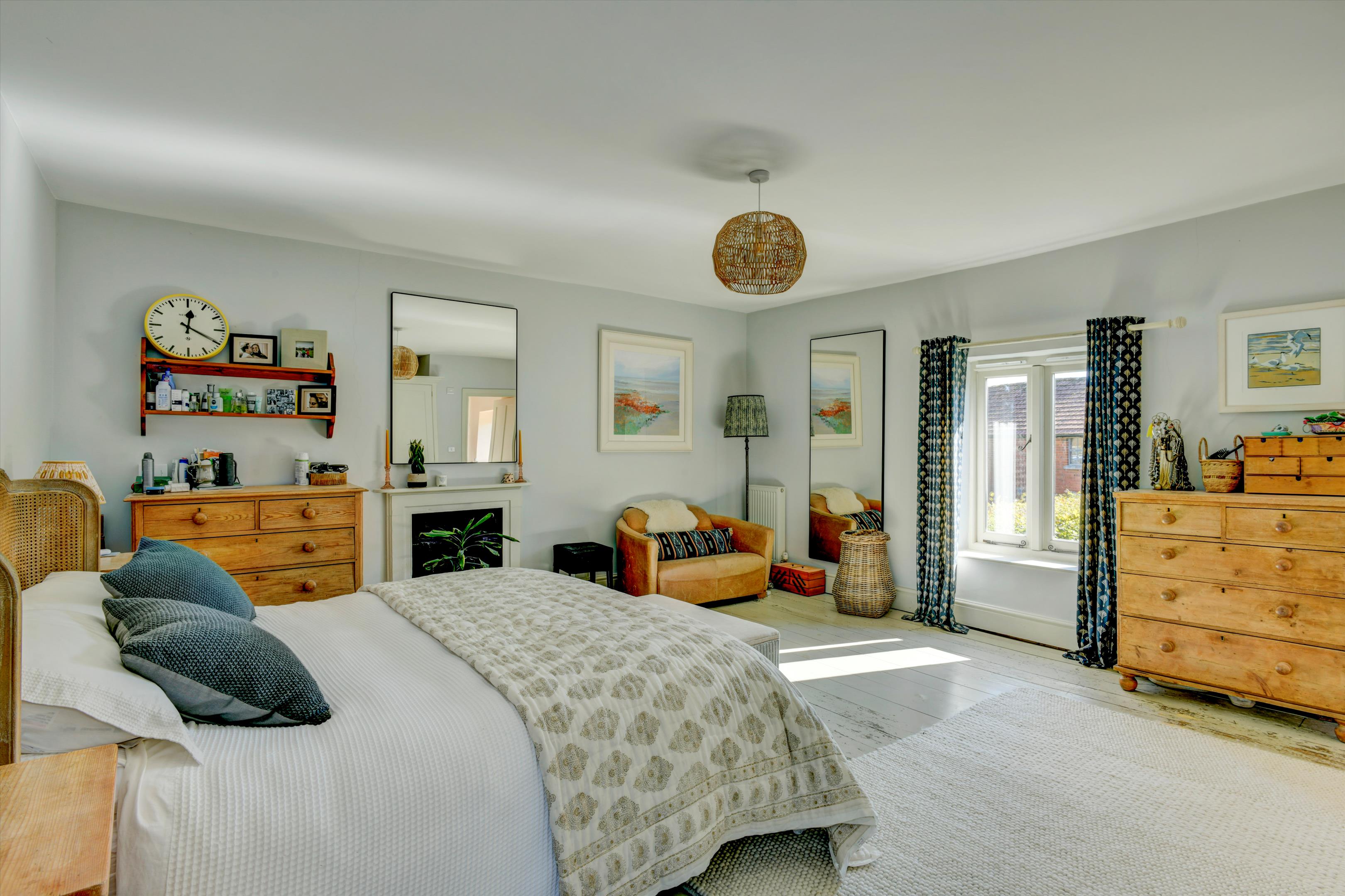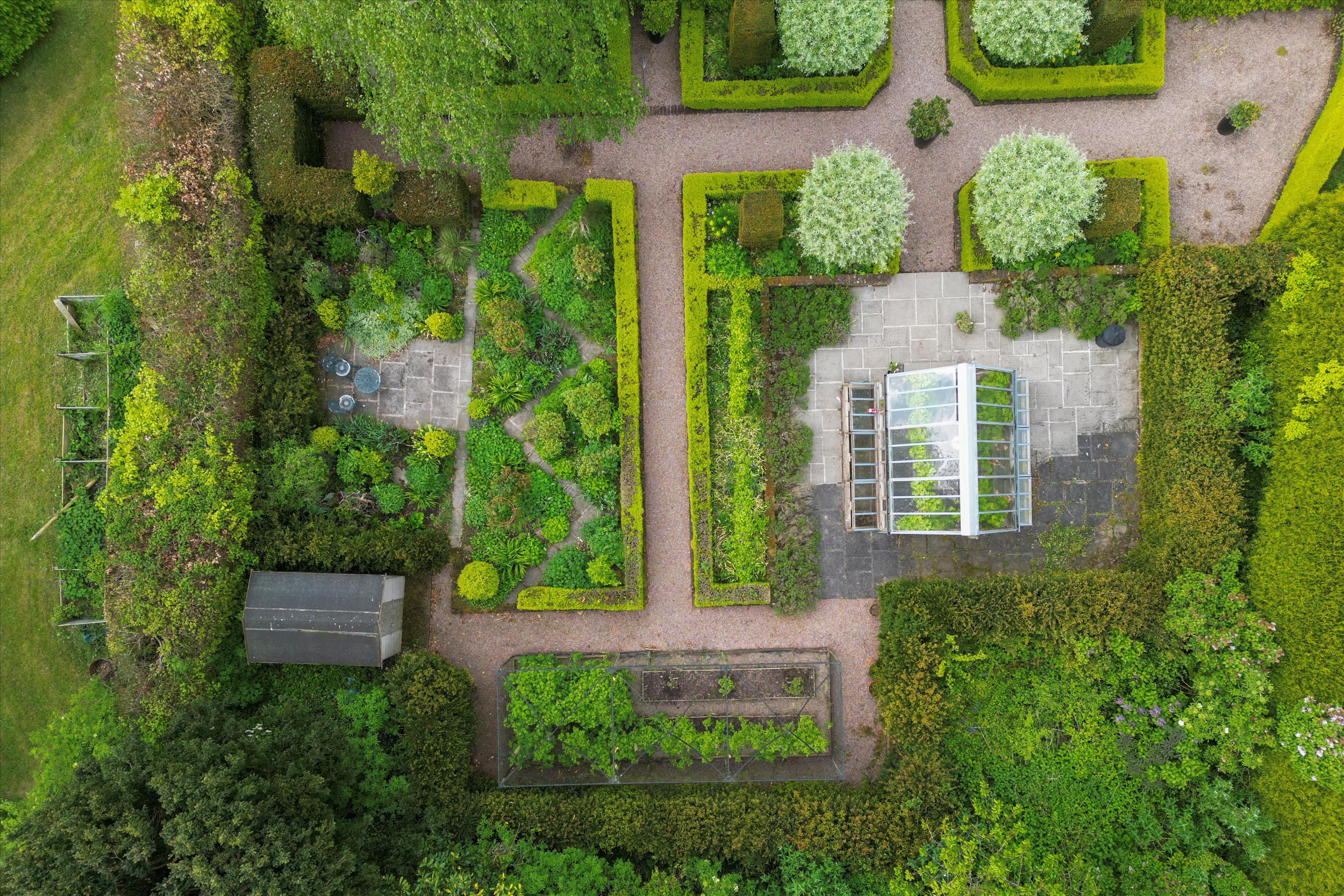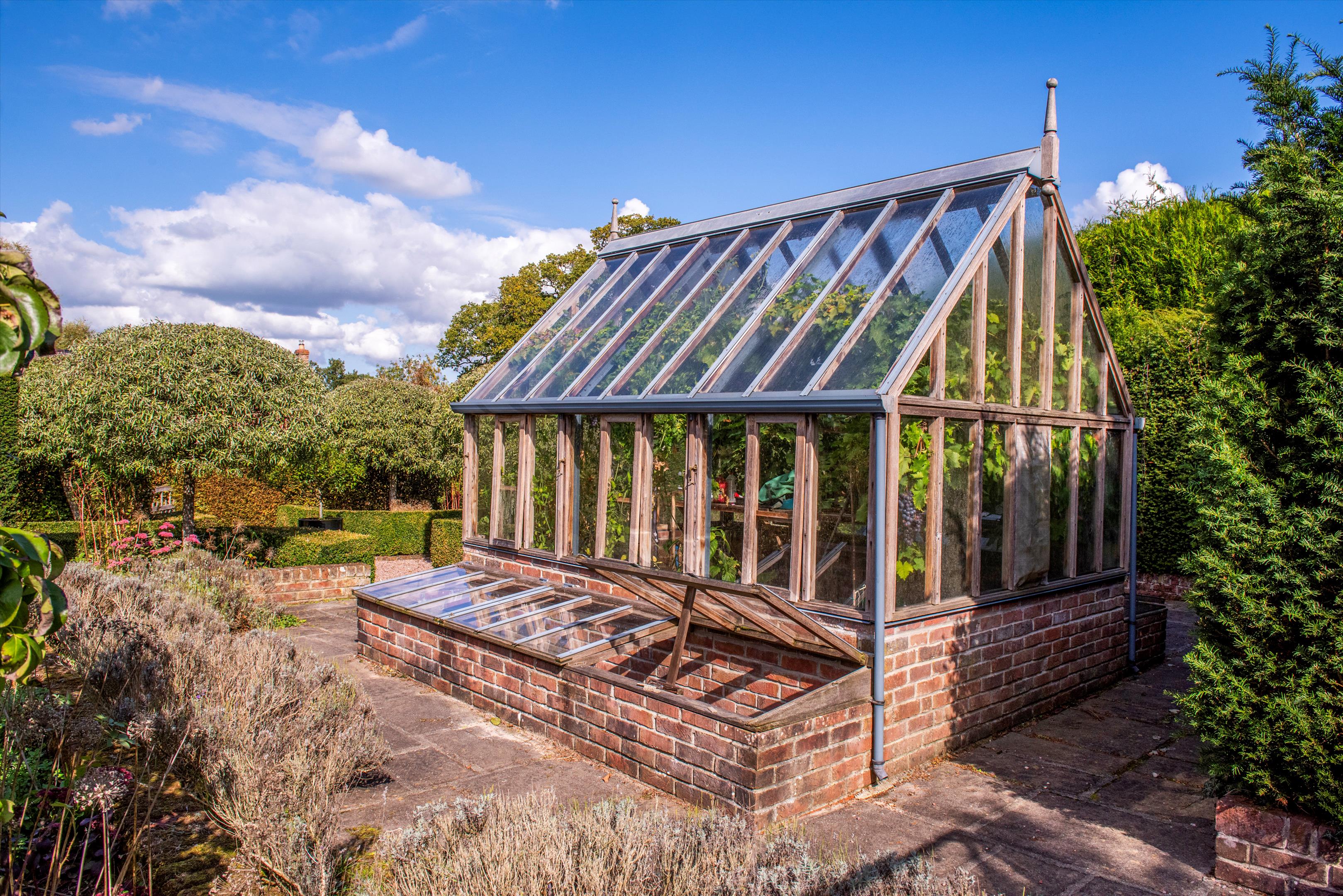 flooring and views over the garden and pond and French doors out to the rear terrace. A staircase from the boot room rises to the studio/bedroom 6 and there is access from the hobbies room into the storerooms and workshop. The conservatory, boat room, and hobbies room all benefit from thermostatically controlled underfloor heating. All of the bedrooms have plenty of fitted wardrobe space and enjoy lovely views over the gardens. The bathrooms are all fitted with high quality contemporary fittings. The gravel entrance driveway leads to extensive parking space and you are greeted by an old beautiful arch which leads through to the broad paved terrace to the front of the house, giving onto the partly walled front garden with level lawns edged by well stocked and colourful plant borders. A path covered by a pergola with roses, clematis and vine leads between the lawns to the kitchen garden enclosed by clipped hedging and with raised beds and an asparagus bed as well as further flower beds, fruit cage and a timber framed greenhouse.