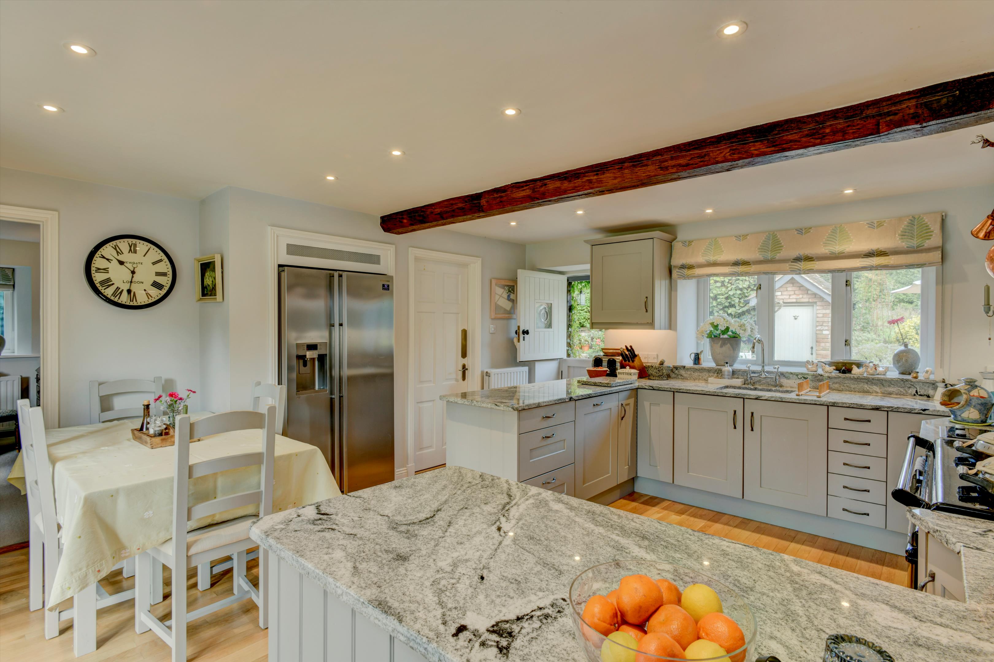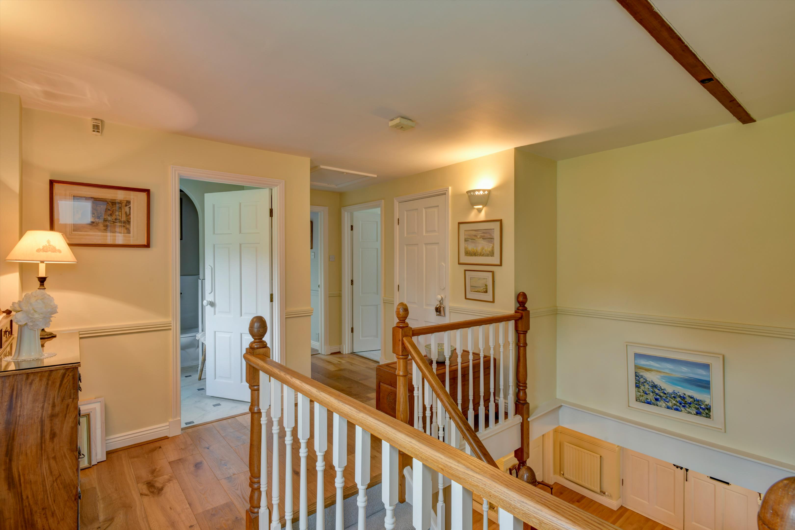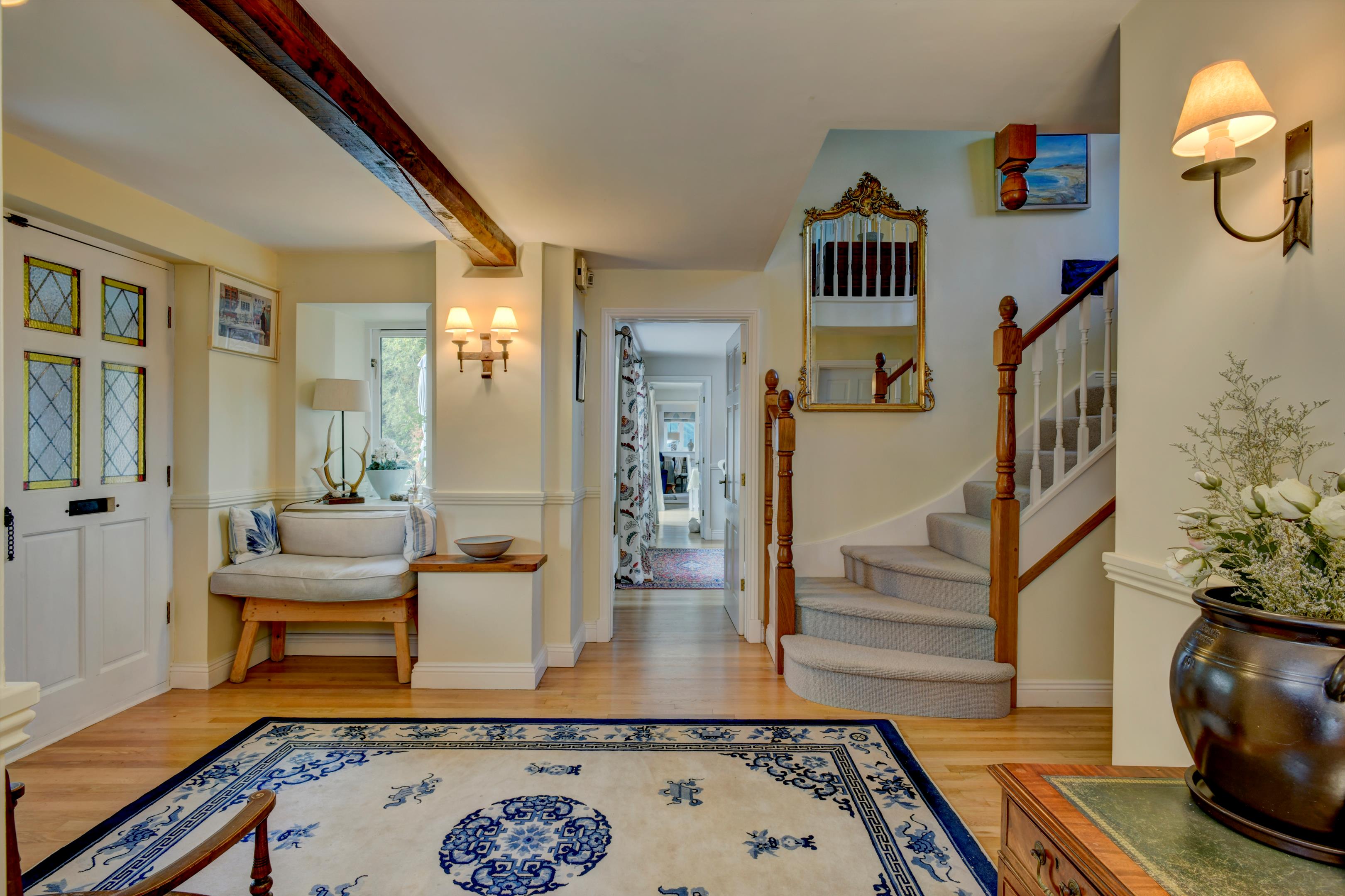 Off the reception hall, the study is fully fitted with desk and office furniture and the large sitting room has a woodburner and exposed beams and French doors out to the terrace and front gardens.