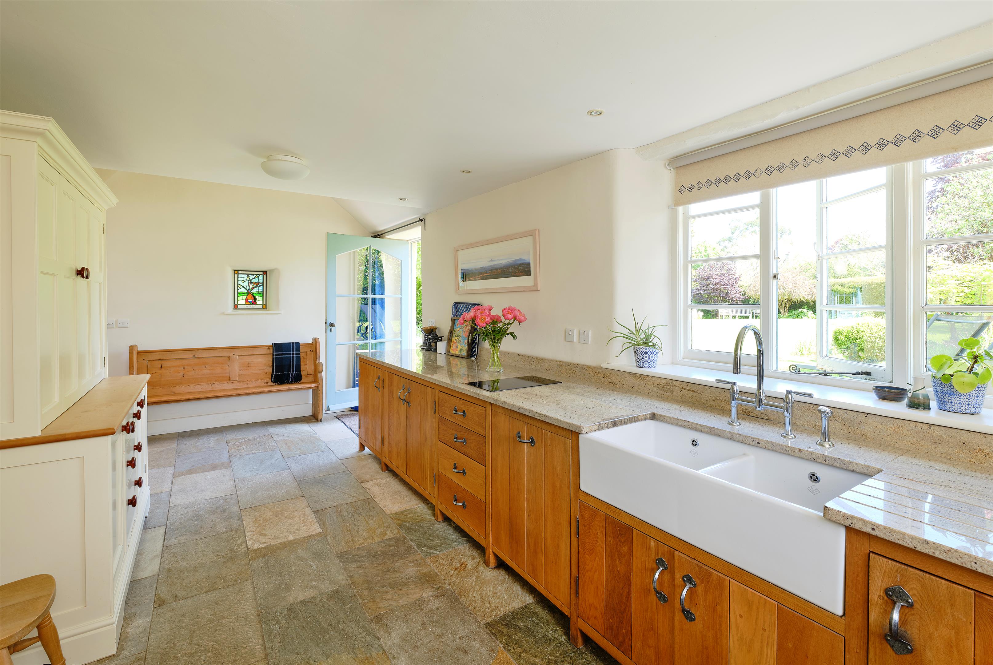 The drawing room is a former bishop's parlour with moulded beams and large stone fireplace with log burning stove. The sitting room has a large fireplace fitted with a log burning stove and Georgian china cupboard. Both drawing room and sitting room face south and overlook the meadow. The very pretty Georgian panelled family room has a stone open fireplace and looks east over its lovely gardens. The dining/breakfast room with Aga links with the kitchen through a stunning stone archway, with the kitchen overlooking the garden.
