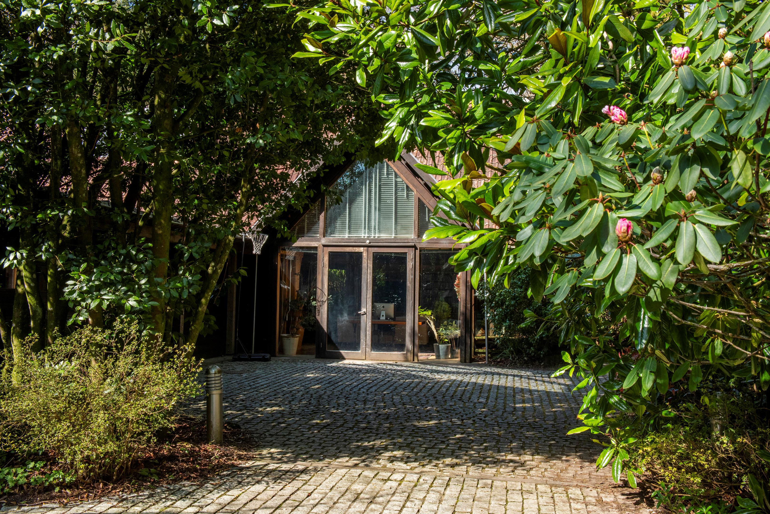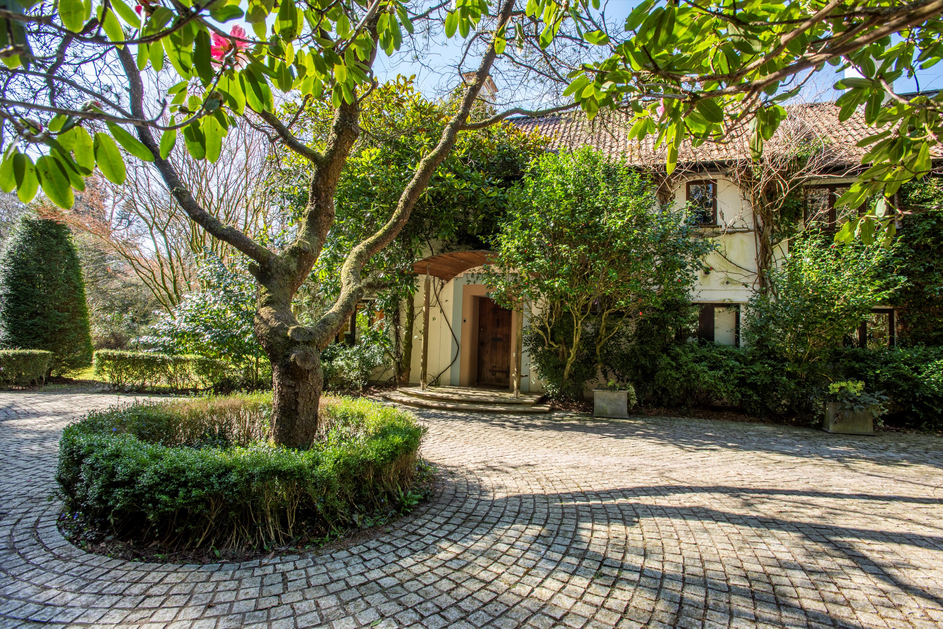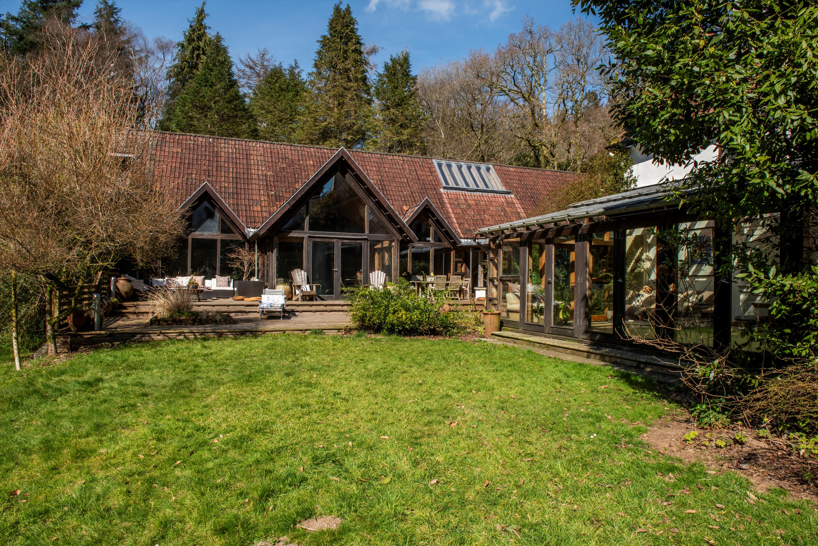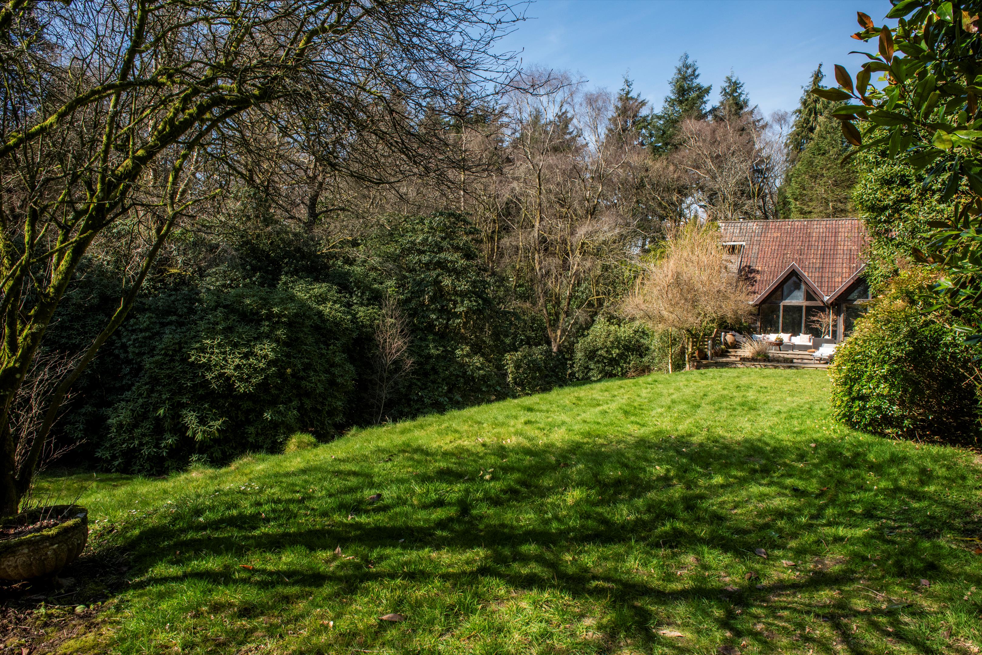 The gardens and grounds are an integral part of the estate's appeal. Terraced lawns extend from the house to a series of ponds and seating areas, framed by mature planting and rare tree specimens including Davidia involucrata, Japanese maples, red and pin oaks, and scented rhododendrons. Ancient Ilex trees, believed to date from the 14th century, provide a remarkable historic backdrop to the woodland walks.
