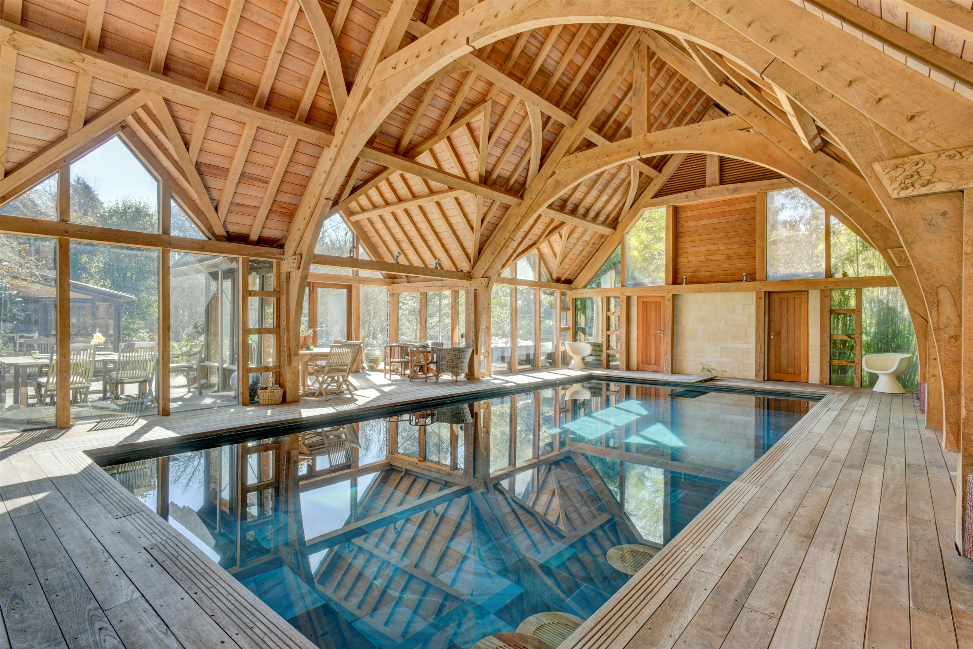 The impressive indoor swimming pool complex forms a striking centrepiece, its dramatic timber-framed ceiling echoing the woodland beyond. Adjoining the pool is a double-height artist's studio, flooded with natural light and overlooking the gardens, offering a wonderful creative or recreational space.
