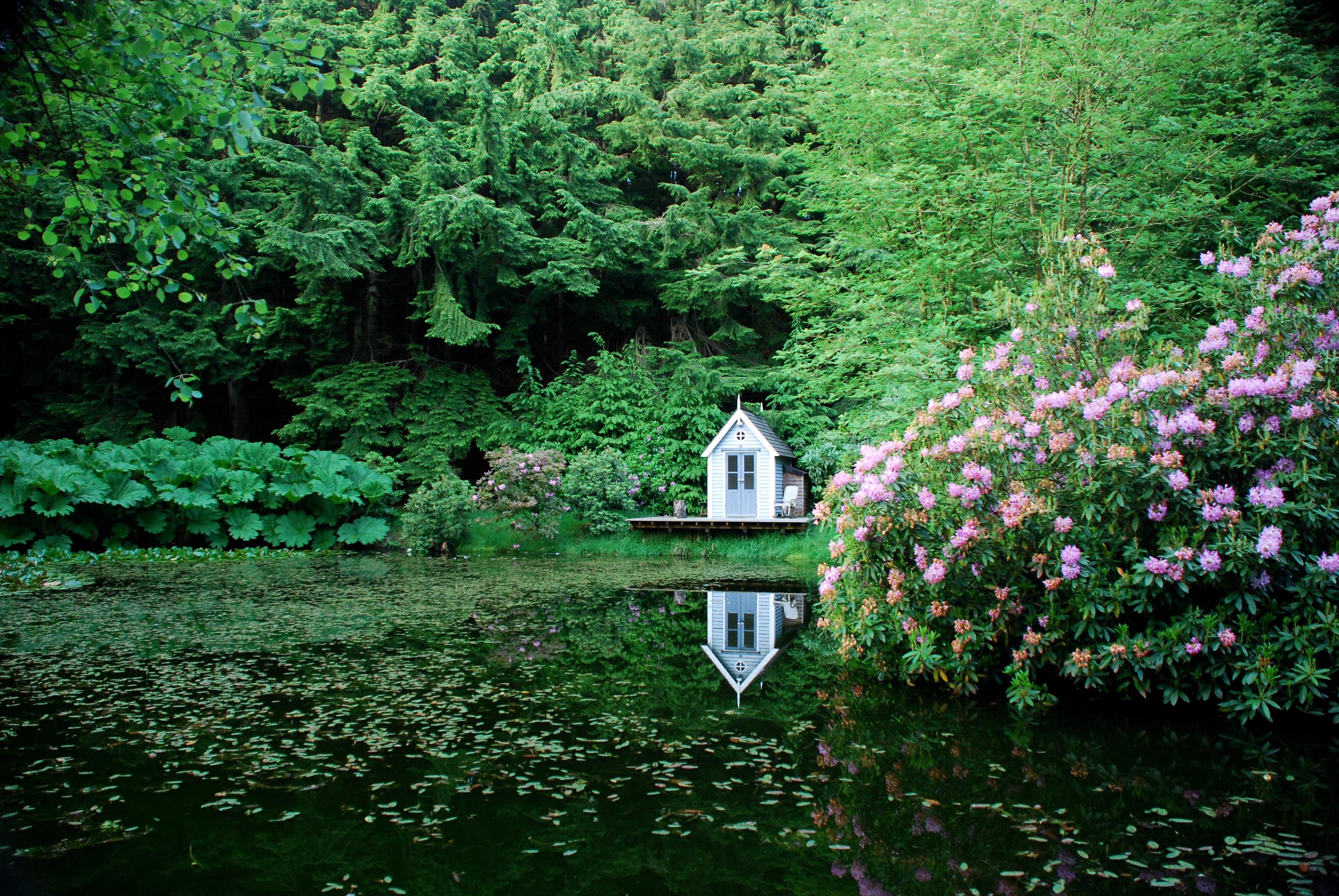 A secluded lake with jetty forms a tranquil focal point within the grounds, bordered by tall hemlocks and approached via winding paths through the woodland. Nearby, a timber-framed summer house provides a peaceful vantage point from which to enjoy the quiet beauty of the estate.