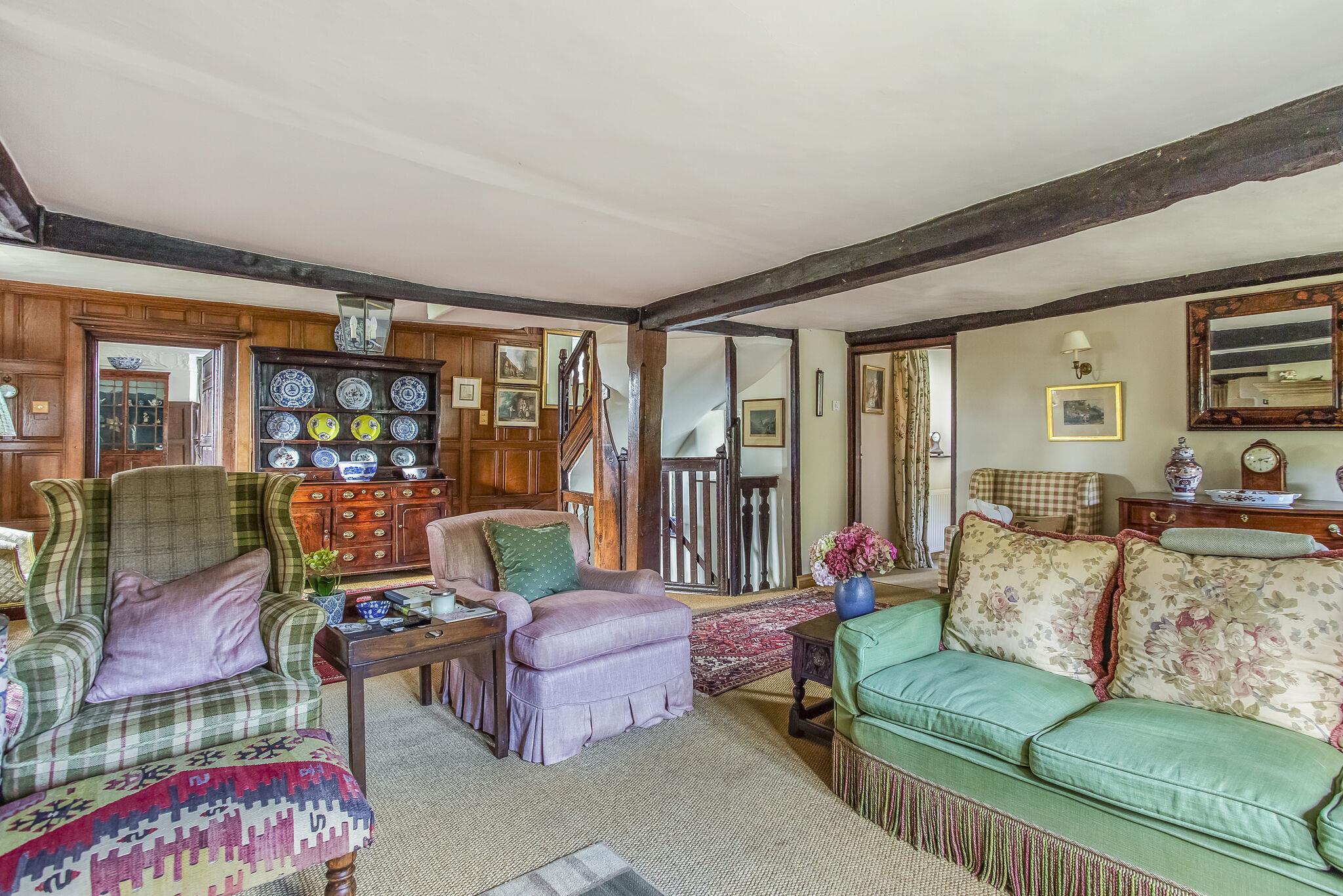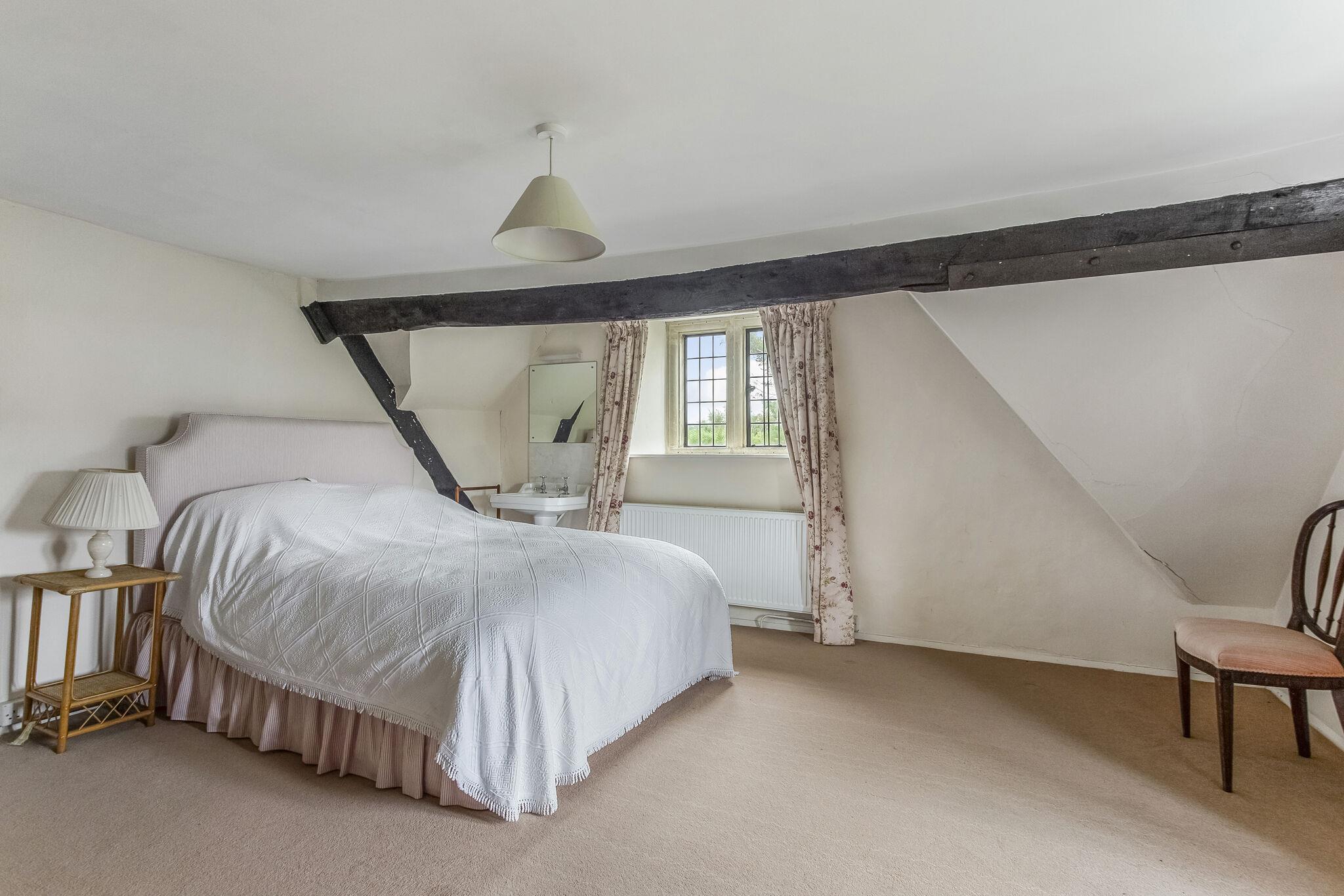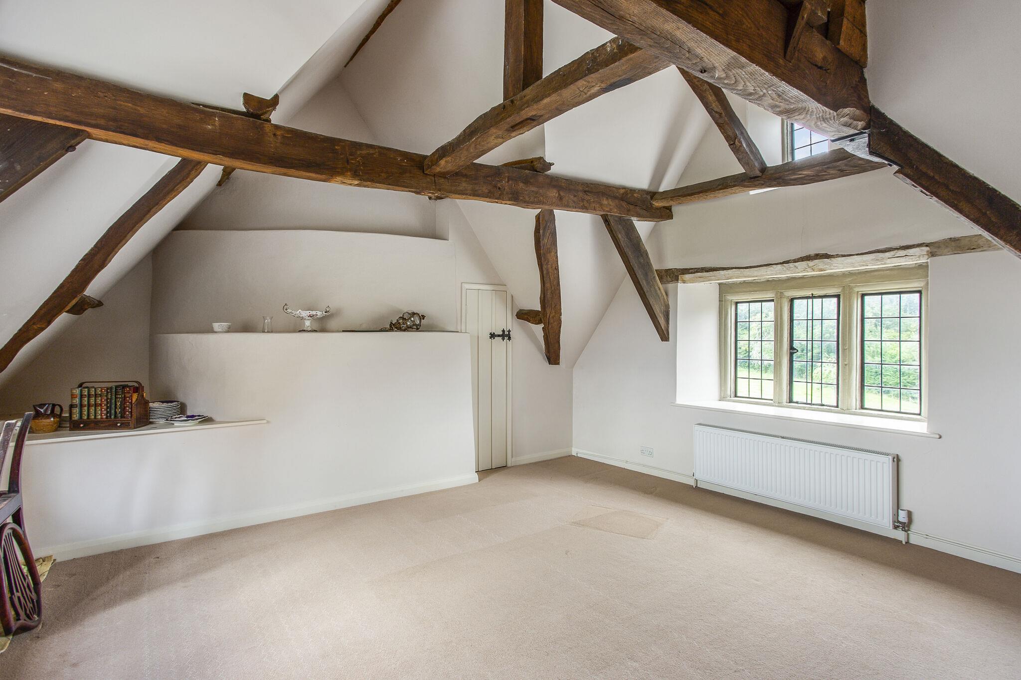 The Oak staircase leads to the first floor with principal bedroom. Windows on all sides of the room make it very light. There is a walk in wardrobe with raised steps to a separate dressing room with fitted cupboards. There are two further double bedrooms both with fireplaces and triple aspect windows are well proportioned and light. There is a family bathroom and airing cupboard on this floor. The Oak staircase leads up again to the top floor which offers an additional 3 bedrooms, walk in airing cupboard, family bathroom and utility room. The largest of these bedrooms is open to the eves exposing original oak beams. Mullioned windows throughout bring plenty of light into the house.