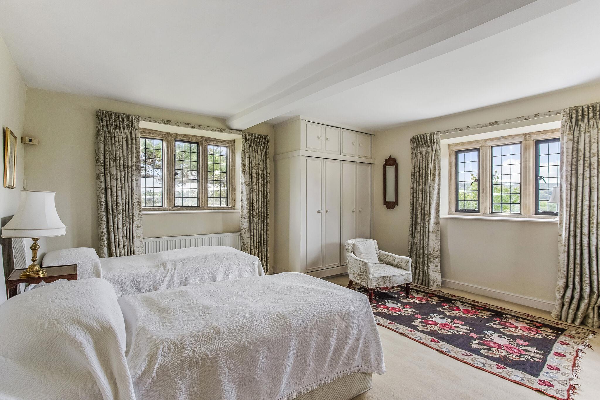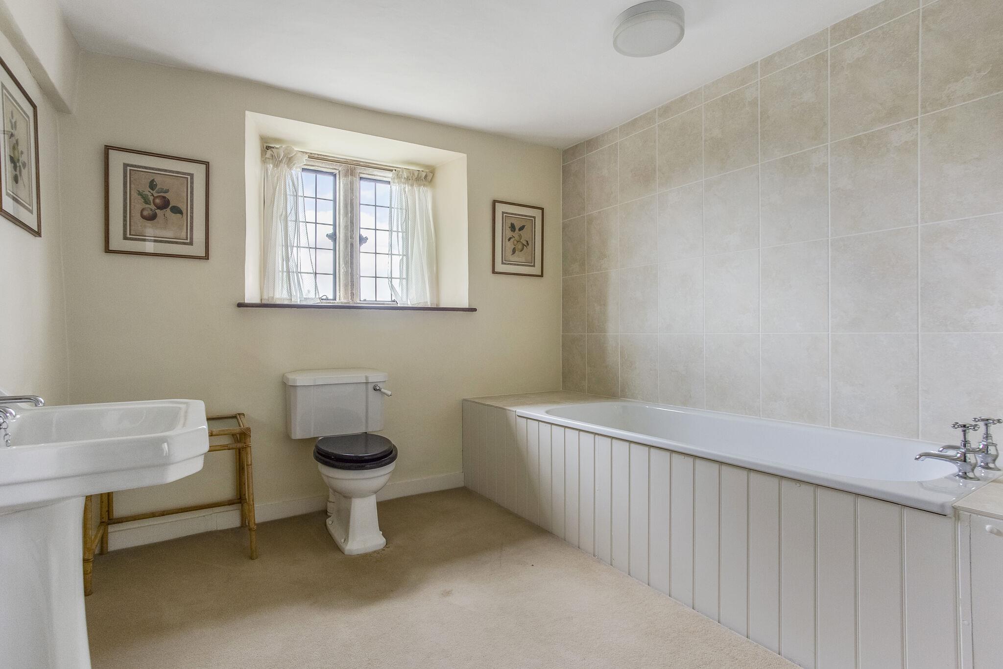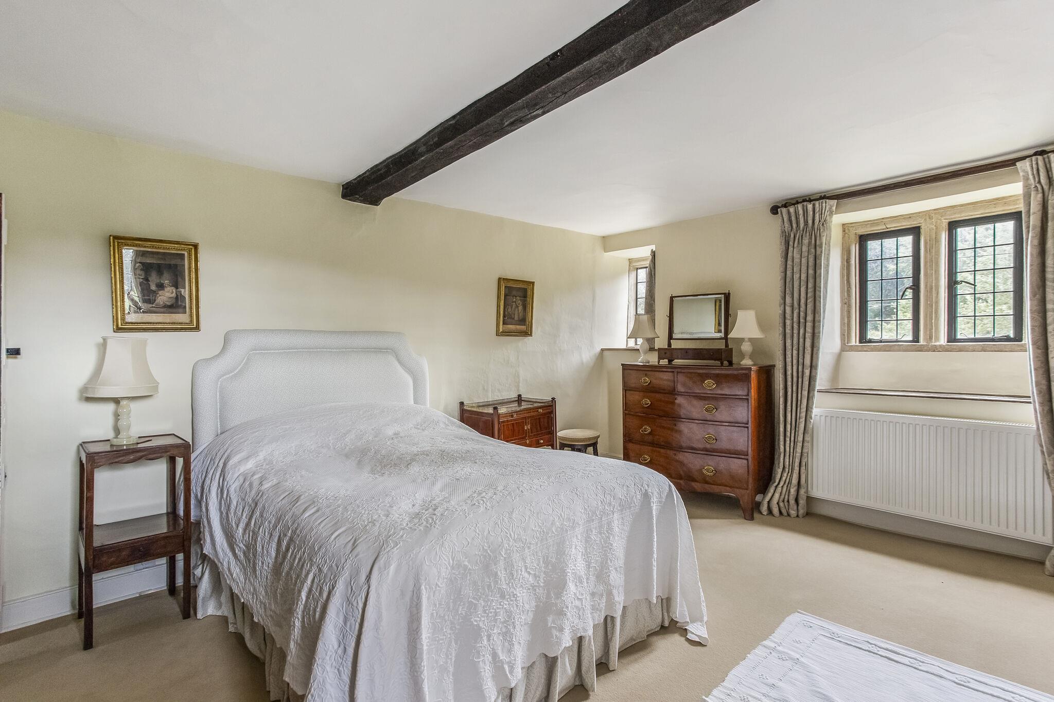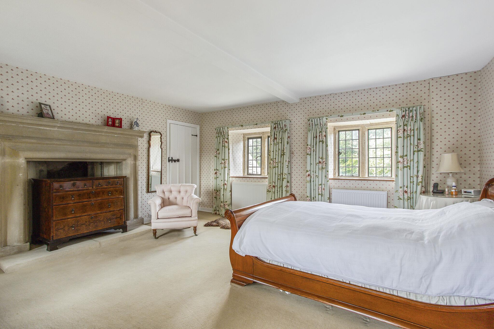 The Oak staircase leads to the first floor with principal bedroom. Windows on all sides of the room make it very light. There is a walk in wardrobe with raised steps to a separate dressing room with fitted cupboards. There are two further double bedrooms both with fireplaces and triple aspect windows are well proportioned and light. There is a family bathroom and airing cupboard on this floor. The Oak staircase leads up again to the top floor which offers an additional 3 bedrooms, walk in airing cupboard, family bathroom and utility room. The largest of these bedrooms is open to the eves exposing original oak beams. Mullioned windows throughout bring plenty of light into the house.