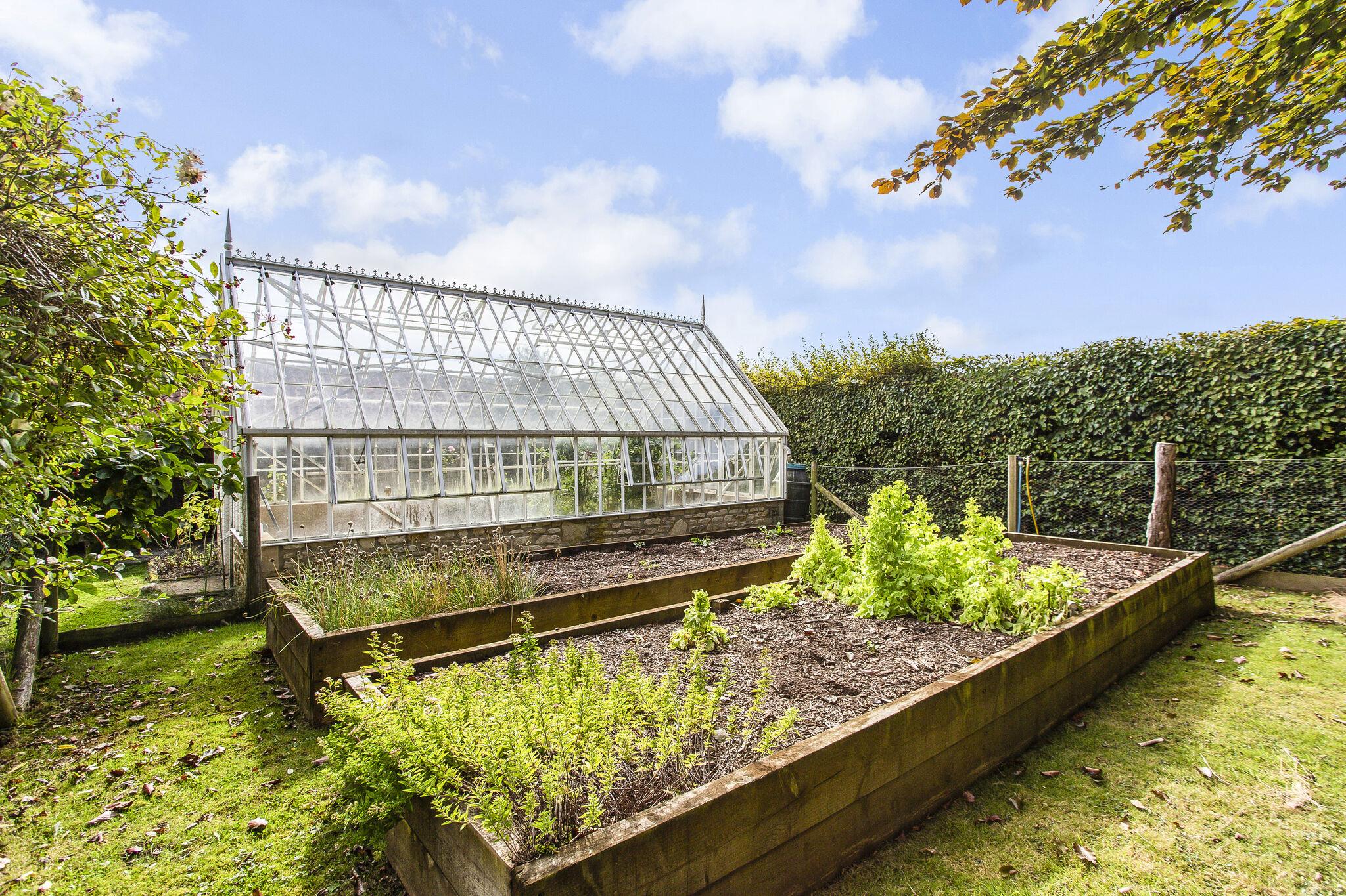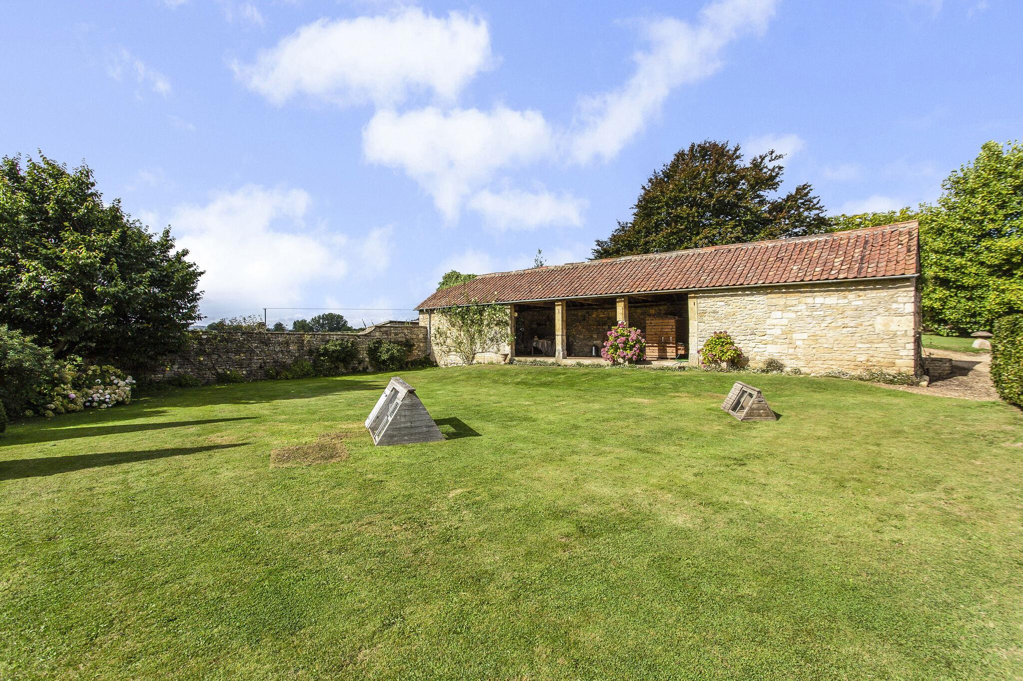 The gardens are a delight with lawns linked by flagstones terraces, rose borders and mature herbaceous beds. There are stunning views over the Bybrook Valley. Steps lead to the main lawn alongside which is a long stone barn which is partly open fronted providing good outside entertaining space or games room. Beyond the main lawn are further areas of lawn planted with specimen trees and shrubs, a greenhouse and raised beds. Beyond a high beech hedge there is an extensive apple orchard.