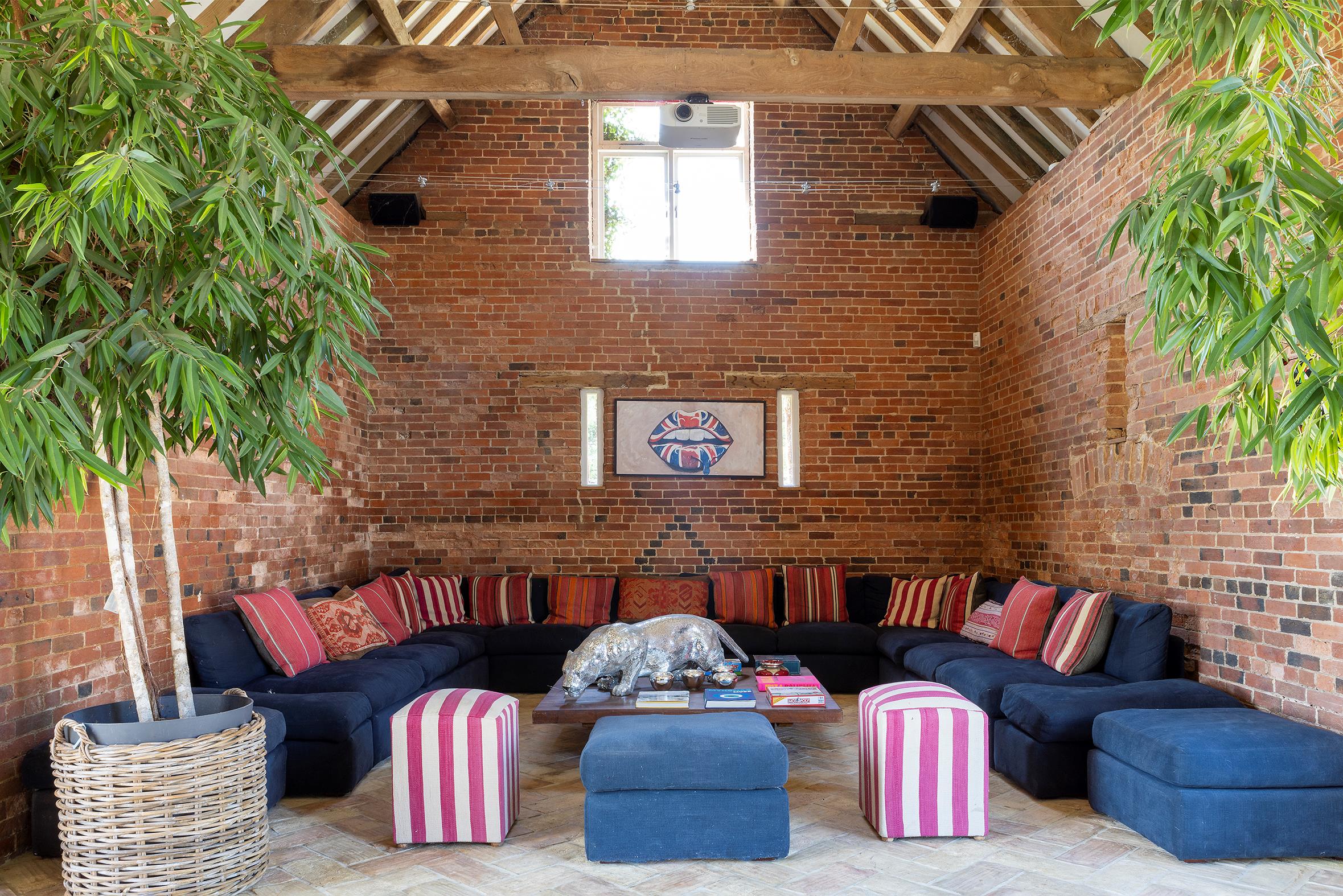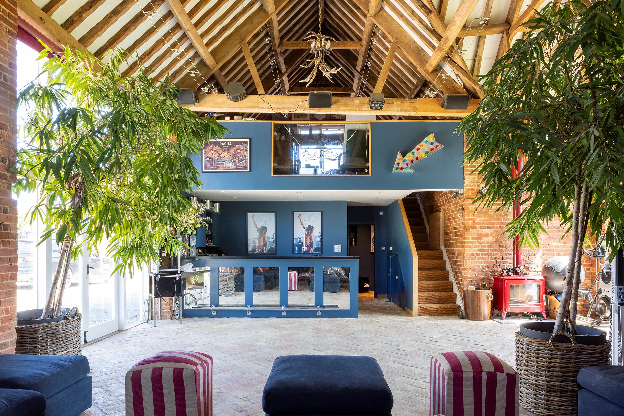 There is large open plan kitchen with a dining and seating area, two formal reception rooms and a dining hall as well as an interconnected party barn with bar and cinema.