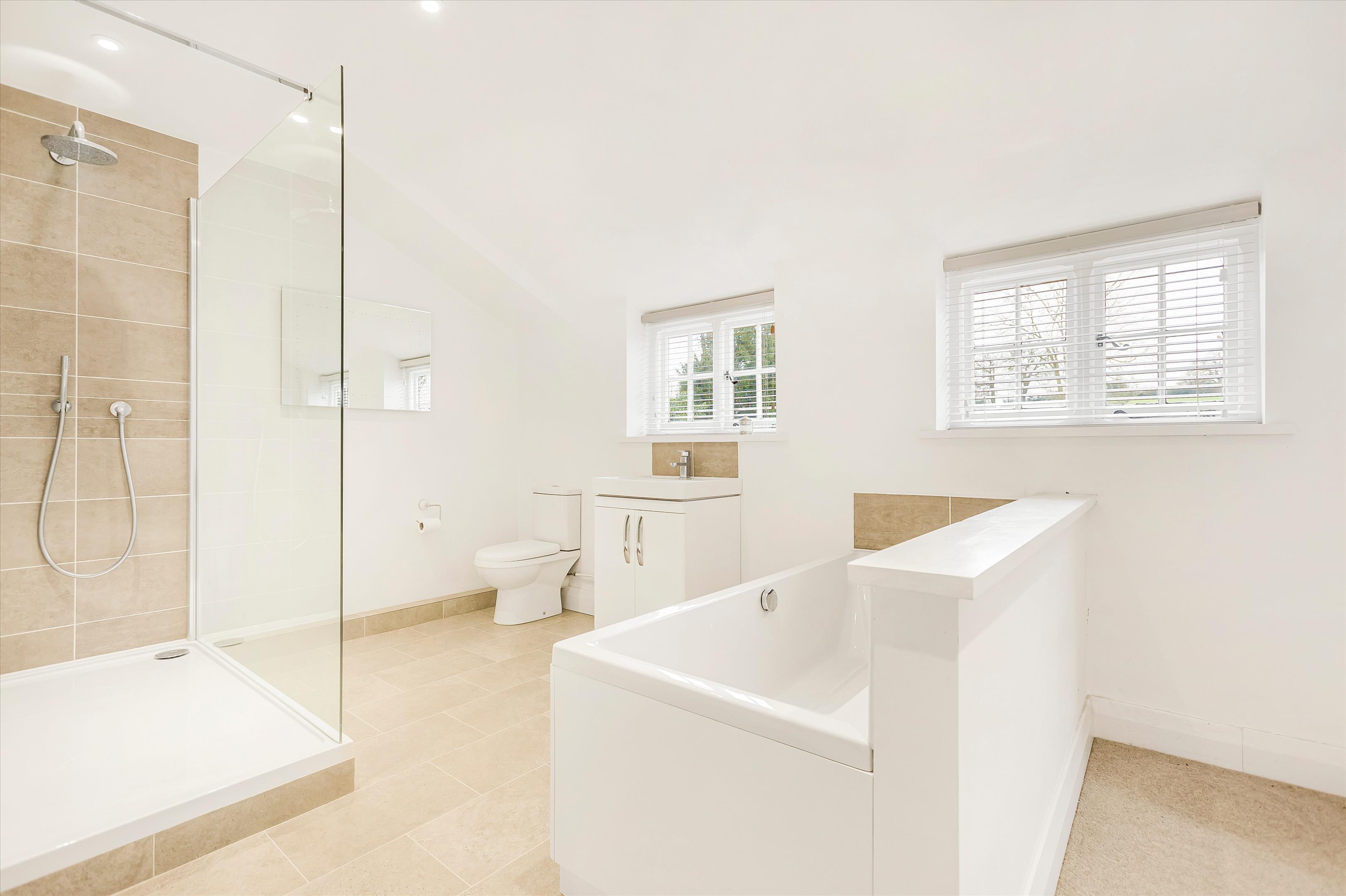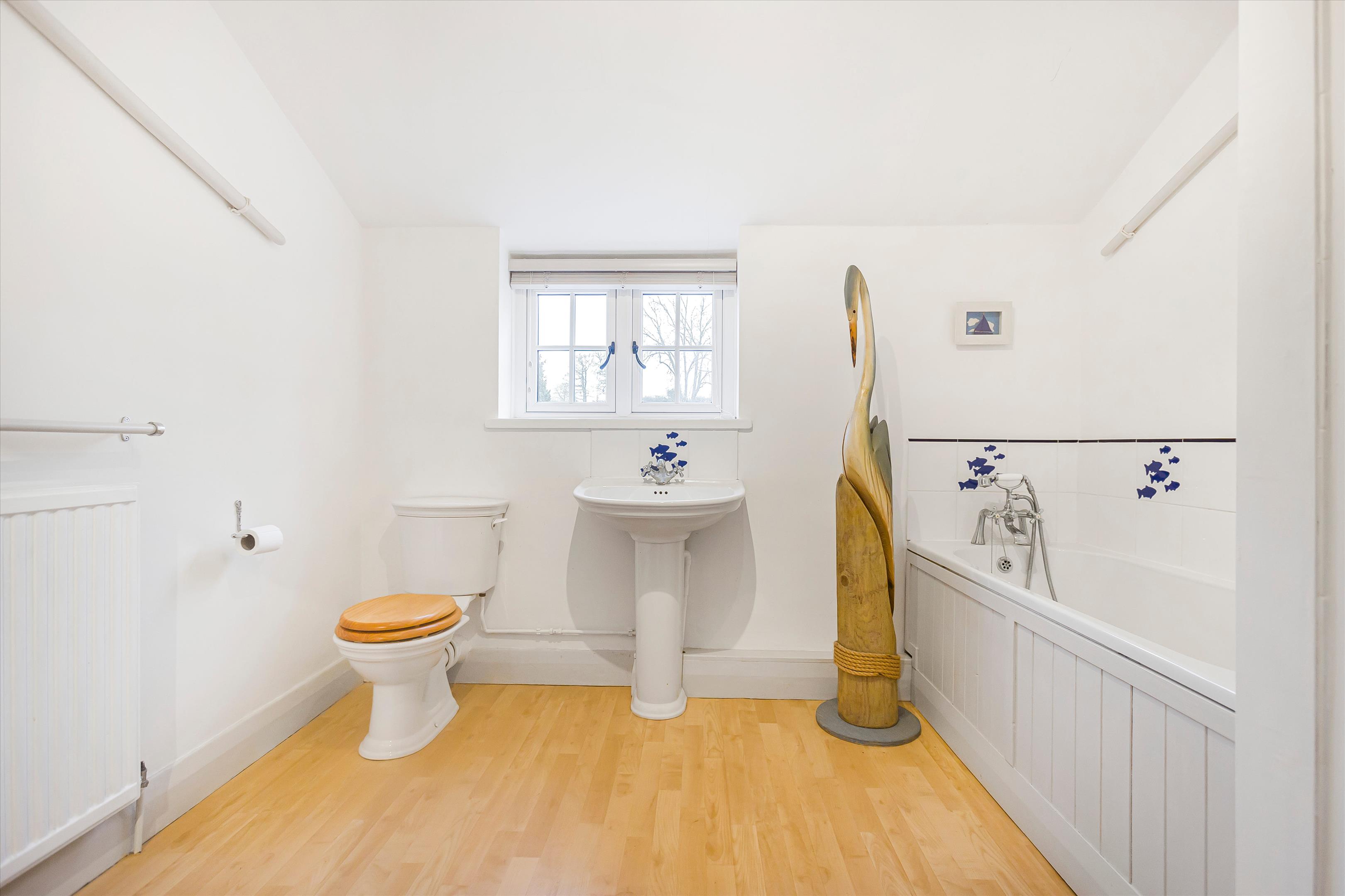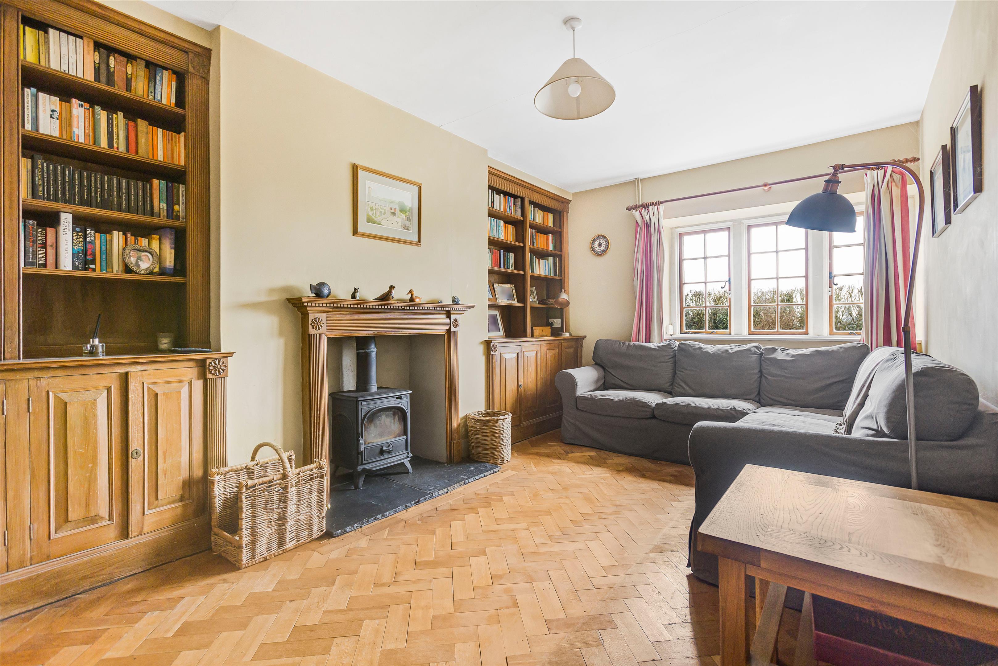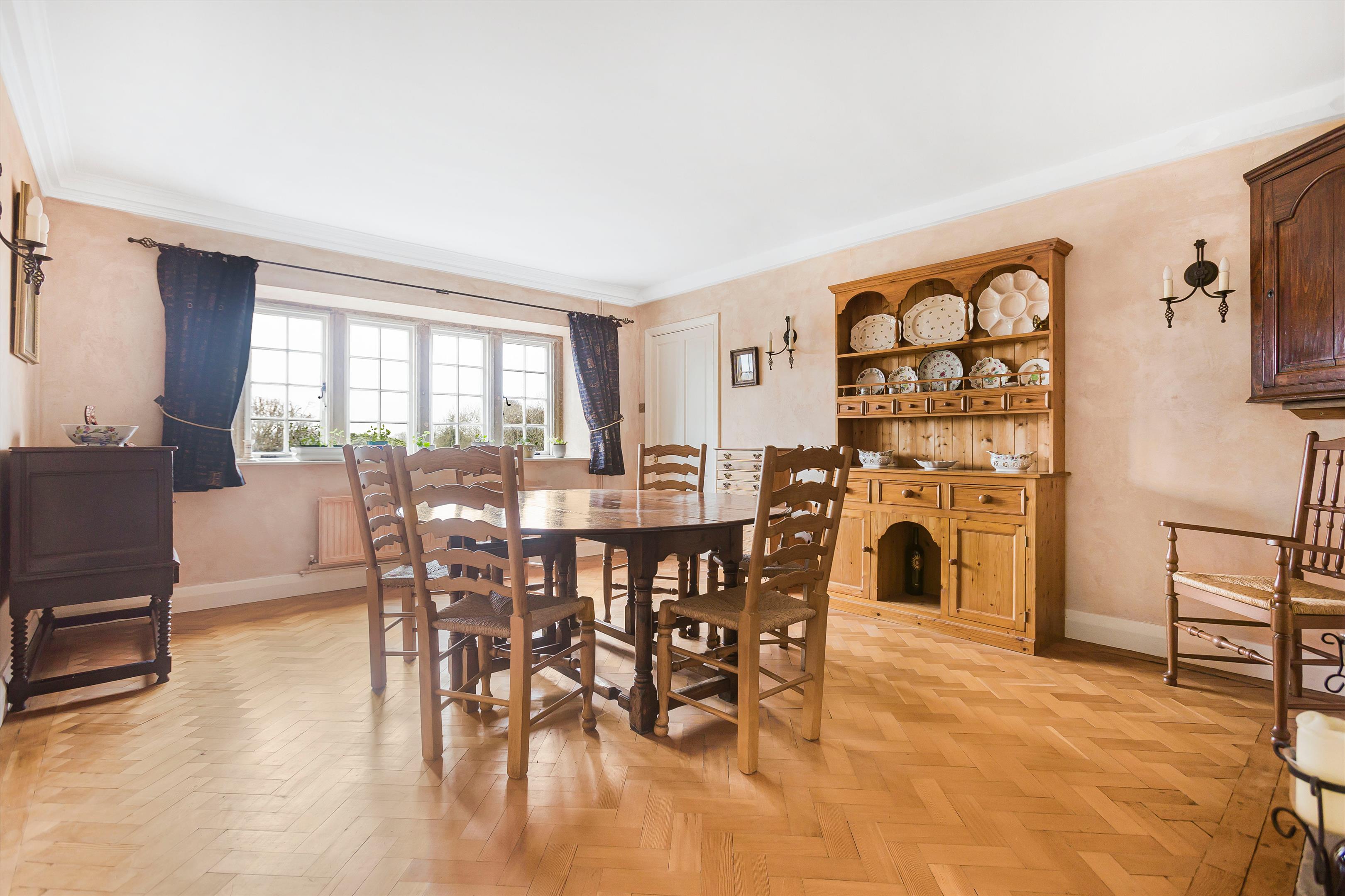 The front door leads to the reception hall and, in turn, to a sitting and dining room. At the end of the house is an open-plan, expansive kitchen/dining/living room. There is a second sitting room/study, WC, and utility room, as well as doors that open on to a west-facing garden terrace.