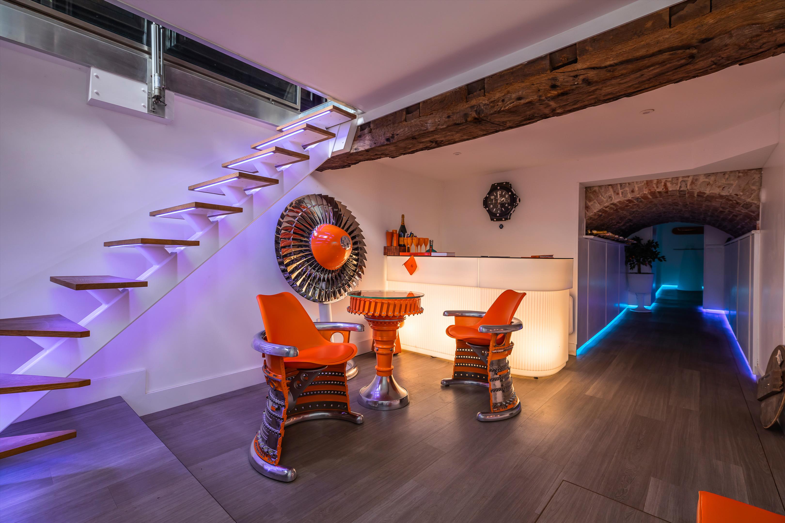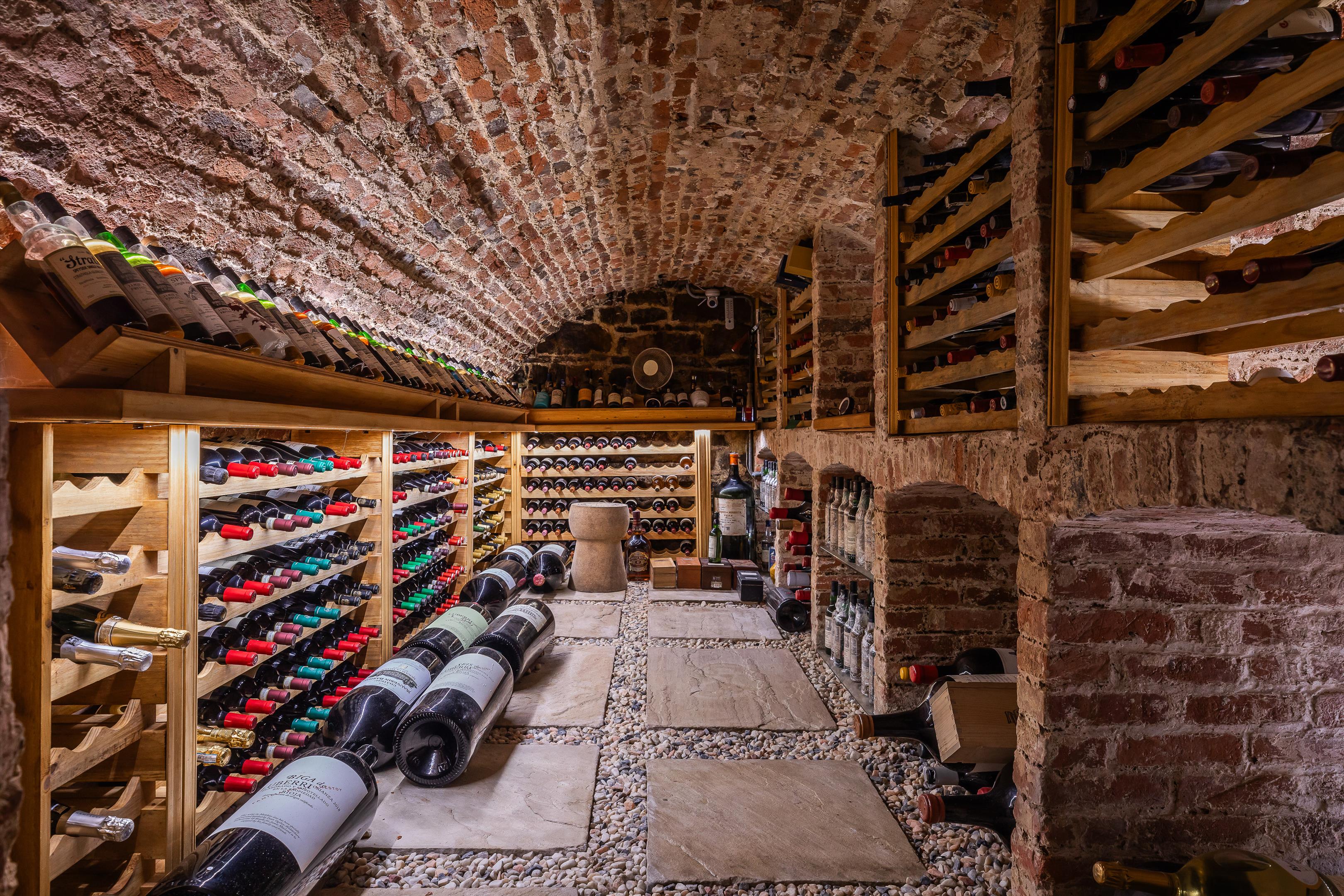 The 2020 cellar refurbishment created exceptional entertaining spaces with an automatic glass floor entrance, open bar with vodka chiller, restored barrel-vaulted wine cellar, and media area with mood lighting and discreet house infrastructure.