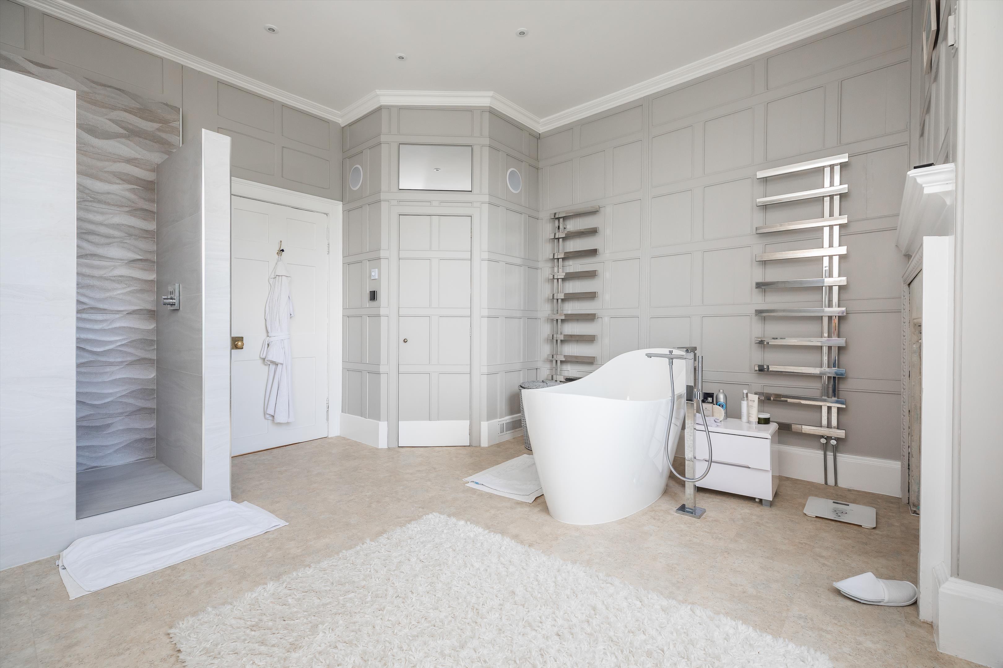 A magnificent staircase leads to the long panelled landing. The principal bedroom suite features marble fireplace, built-in wardrobes, and garden views, plus an adjoining bathroom with free-standing bath, dual sinks, and walk-in shower. Two additional en suite bedrooms and utility facilities complete this level. The second floor, fitted with underfloor heating, has a superb vaulted bedroom suite with sitting room and en suite, plus another bedroom with family bathroom offering laundry facilities. A small roof terrace provides outdoor access.