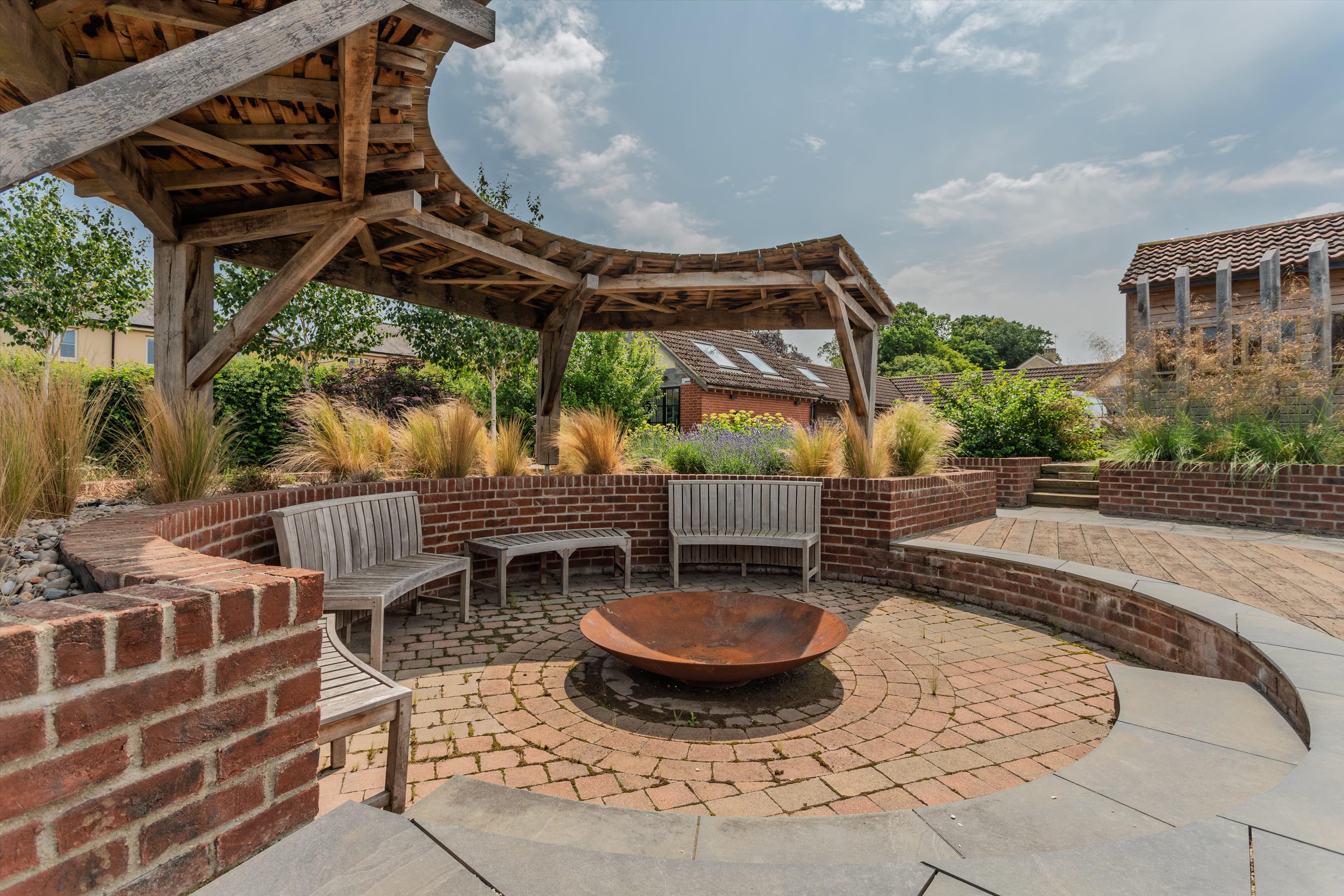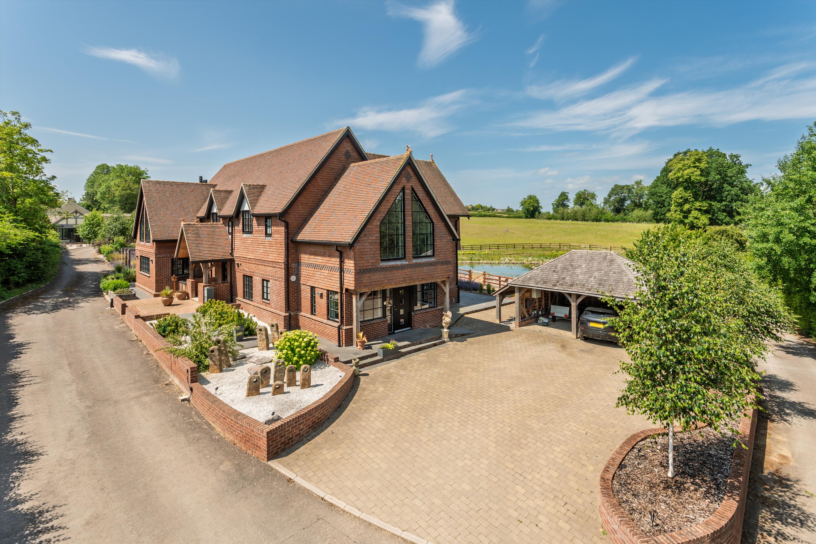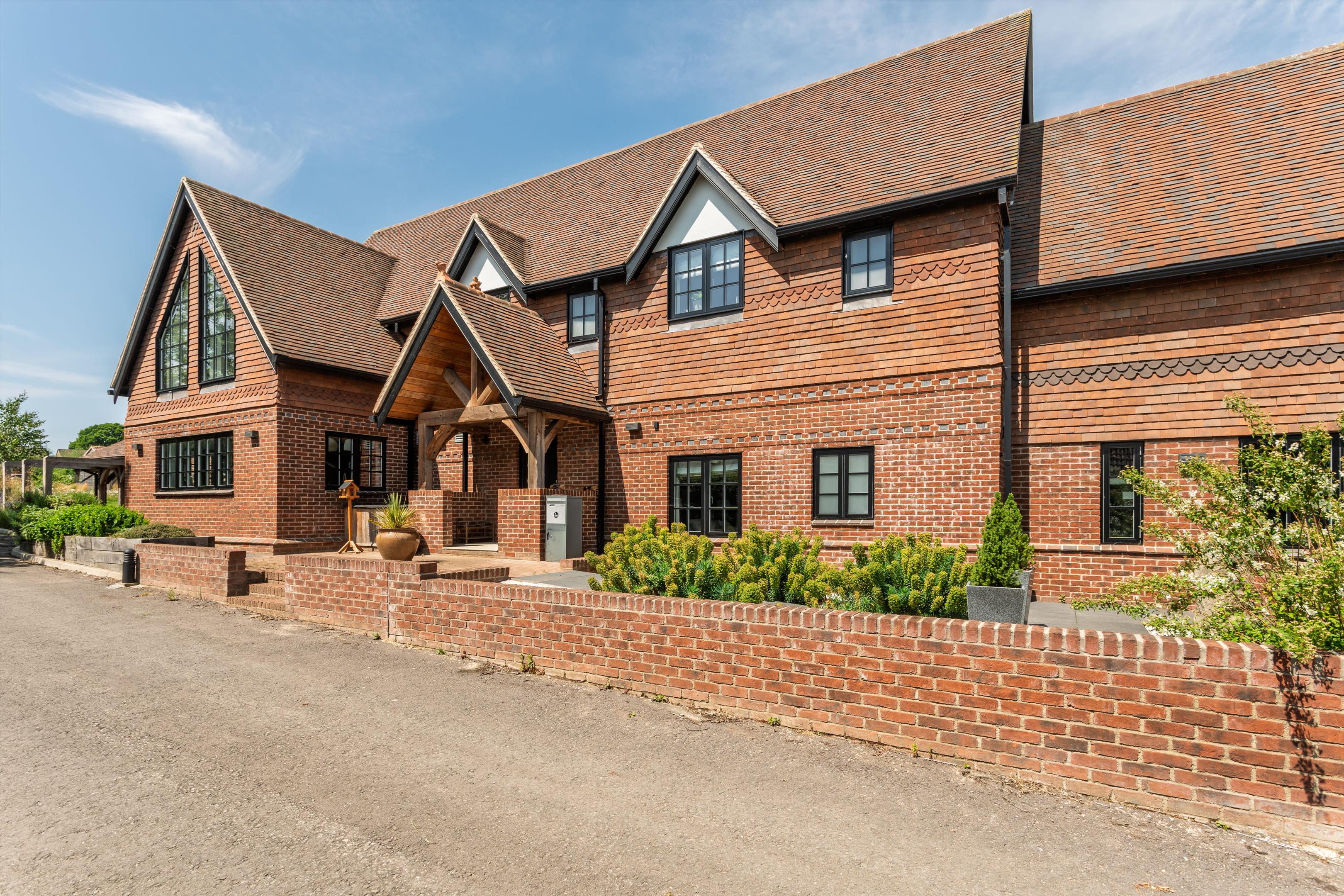 Cowbridge Farm is ideal for modern living, with spacious reception rooms, a large kitchen-dining area, and indoor and covered outdoor reception areas. The striking red brick and timber-framed house has five reception rooms and five bedroom suites over two floors, comprising over 4,700 sq ft, ideal for family living and entertaining.