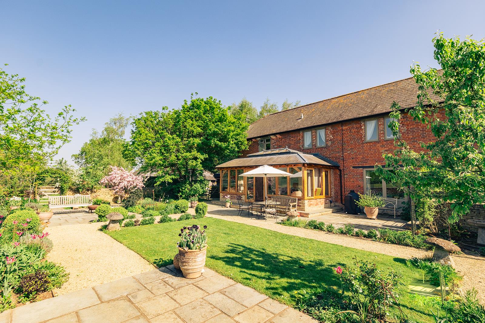 Kingway Barn is a beautiful barn conversion situated at the end of a long private driveway overlooking open countryside. Dating back to 1853, this traditional barn has great charm and is built mainly of brick under a slate roof. The property was converted in the 1980s to provide a free-flowing, light country home with a great sense of space. The front door opens into a magnificent high-ceilinged entrance hall with a study to the left and a beautiful drawing room beyond. The drawing room is well-proportioned with fitted shelves and a gas wood burner in a Cotswold stone fireplace. Leading off to the left is the sitting room, with exposed beams, a wood-burner and French doors that lead out on to the private garden. On the opposite side of the hall is the open plan kitchen/breakfast room, perfect for family living with space for a large dining table and French doors that lead out to the landscaped garden with pastureland beyond. The kitchen is fitted with granite and oak worktops on a range of bespoke units. There is an electric Aga and an integrated dishwasher.