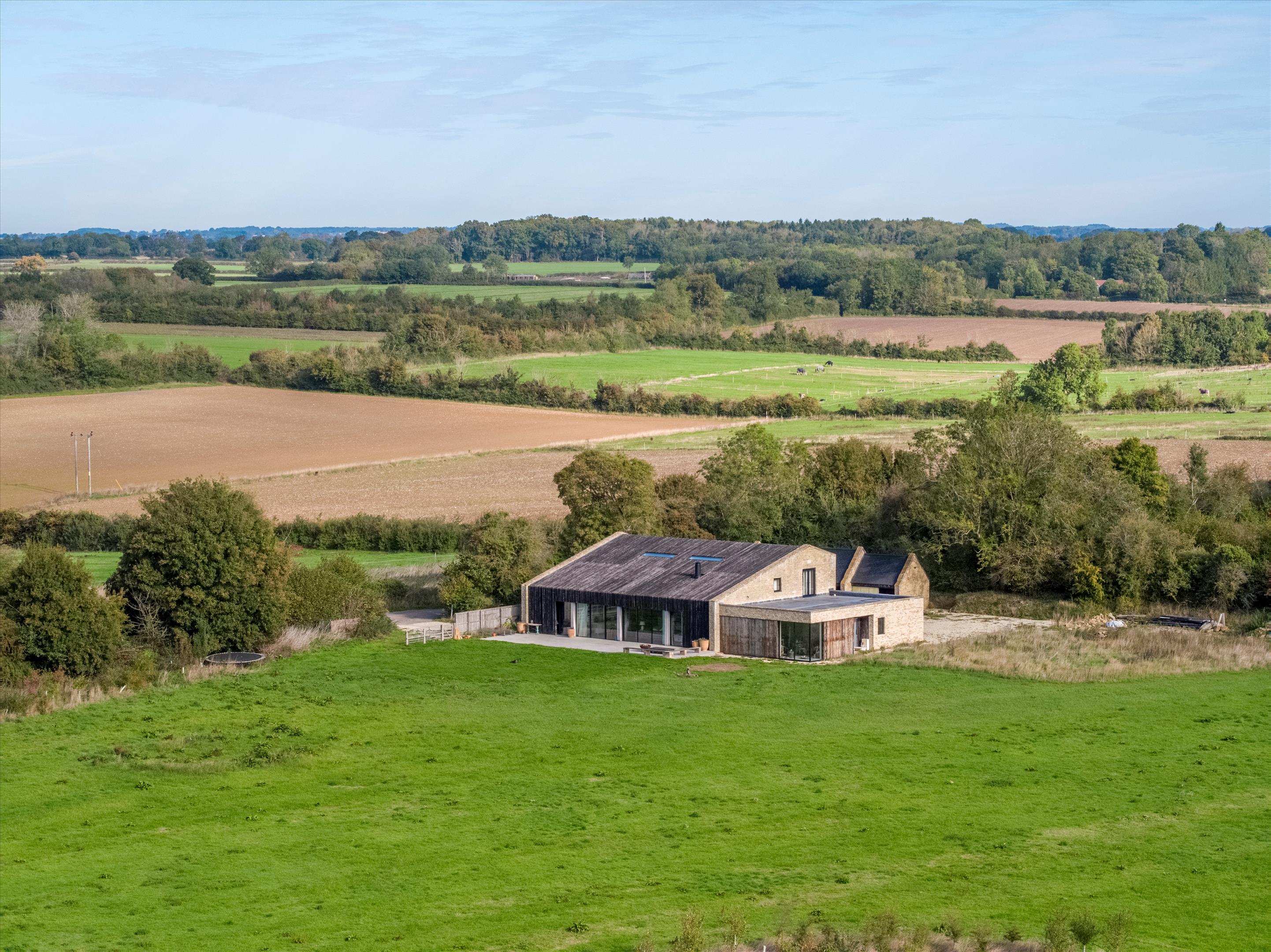 The spacious open-plan kitchen forms the house's core with open-plan dining and living areas leading to the full height glass doors that open on to the paved terrace with panoramic views over the private paddock to the undulating countryside to the south. In addition, an entrance hall, study, snug, WC, utility/boot room.