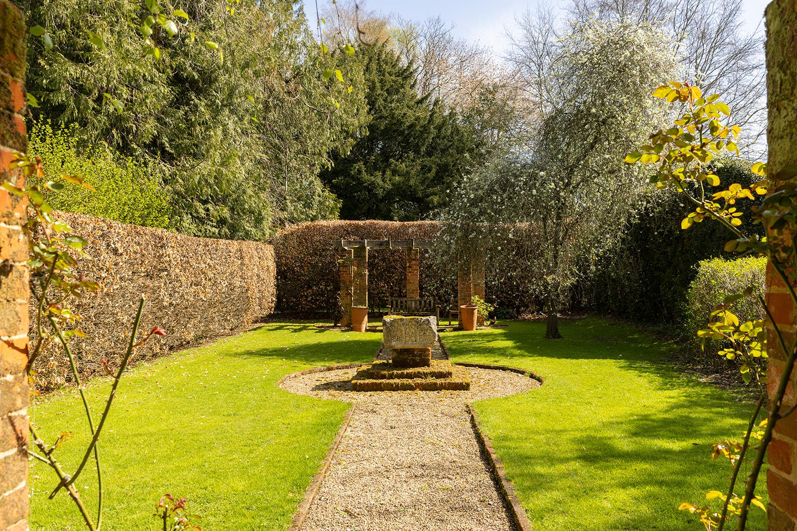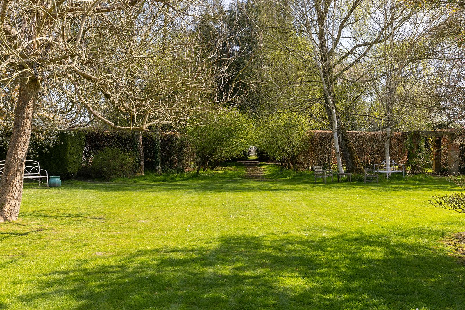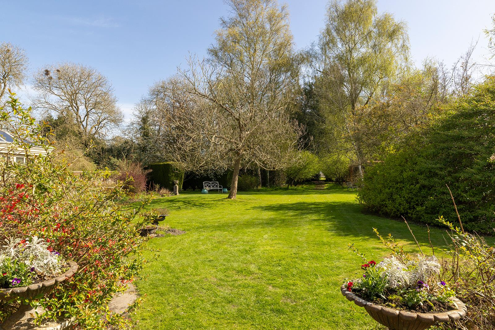 The house is accessed via a short gravel drive from the village street. The garden is mainly to the east of the house, featuring herbaceous borders, dwarf hedges, and flowering cherries. Adjoining this garden and separated by a clipped beech hedge is a secluded lawned garden with a rose and honeysuckle-covered pergola. There's also a productive kitchen garden with a greenhouse. An avenue of crab apple trees leads to an area of woodland planted with spring bulbs.