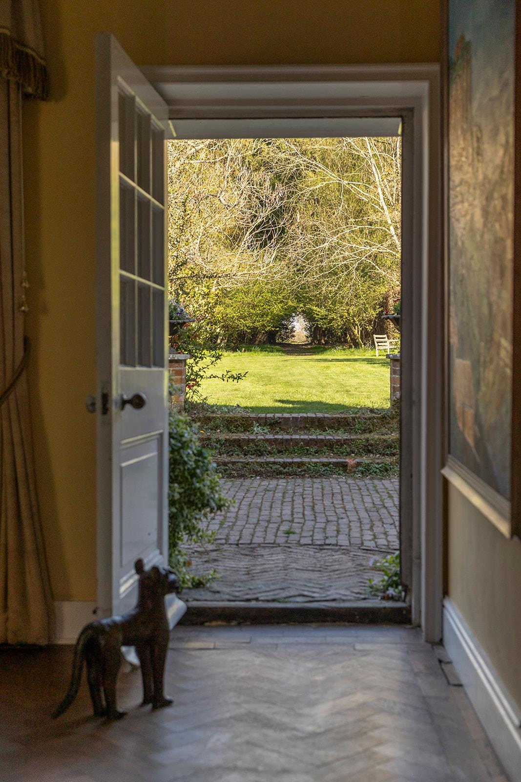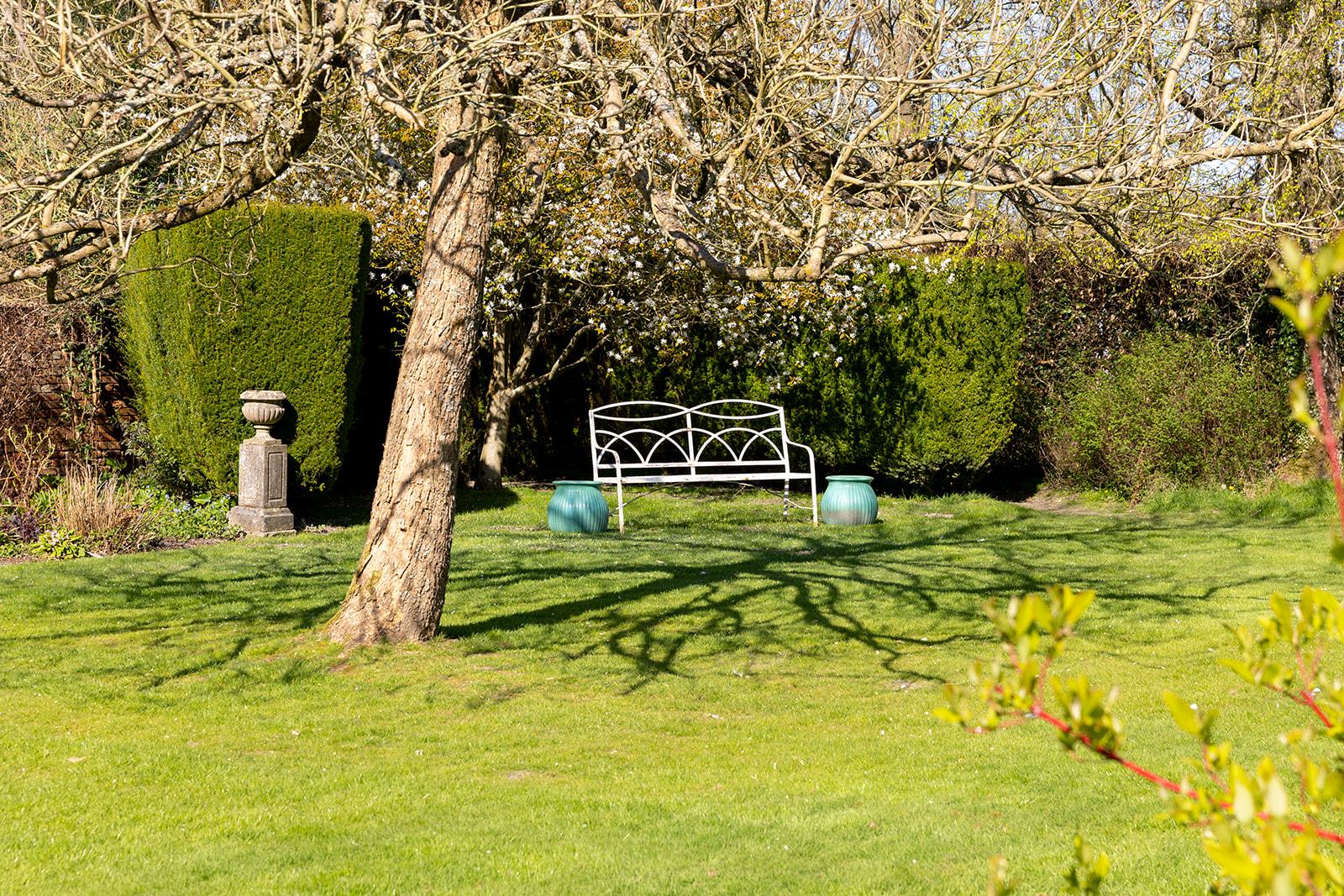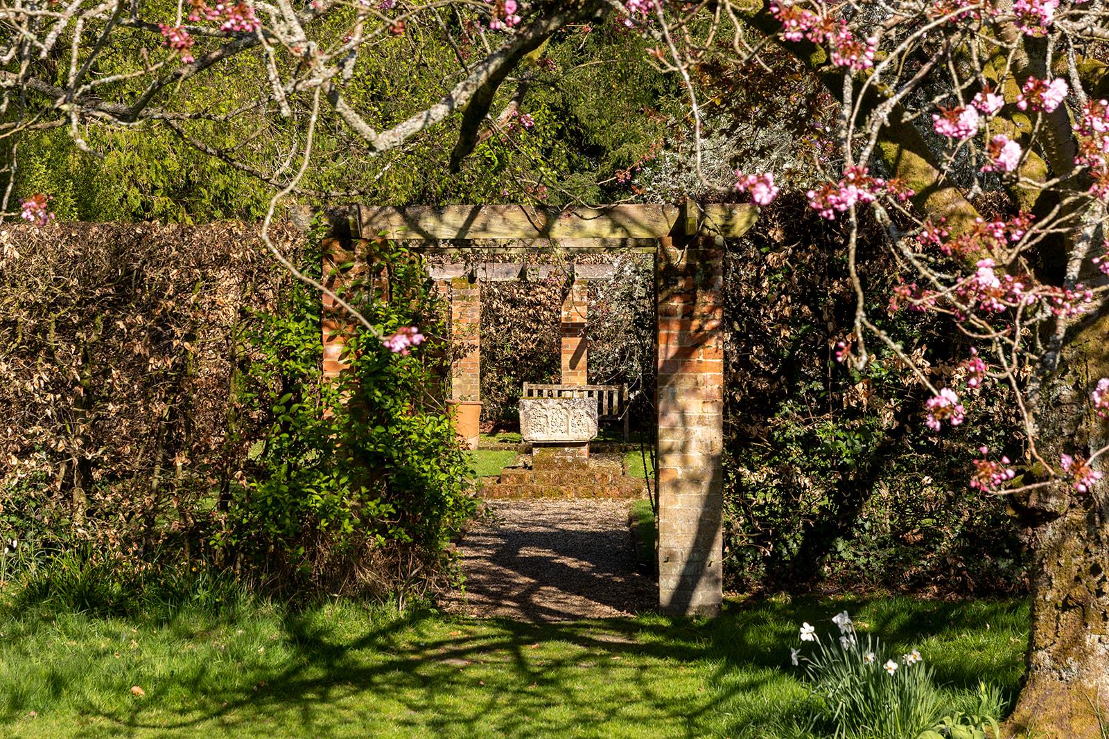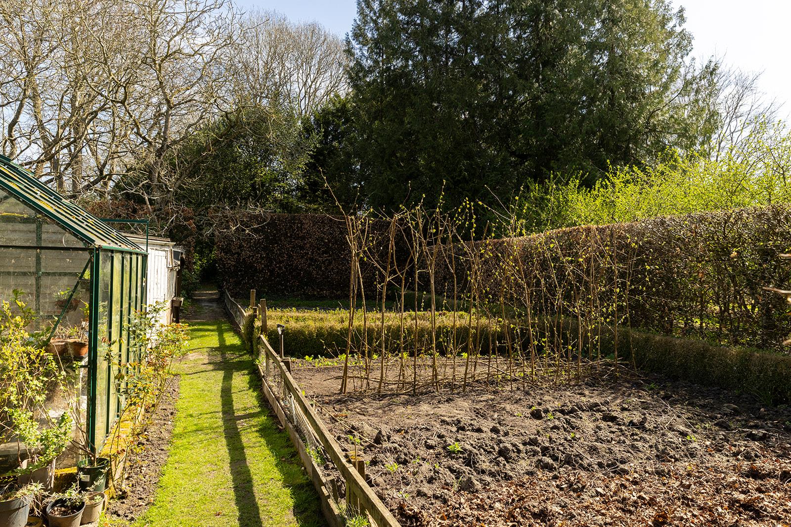 The house is accessed via a short gravel drive from the village street. The garden is mainly to the east of the house, featuring herbaceous borders, dwarf hedges, and flowering cherries. Adjoining this garden and separated by a clipped beech hedge is a secluded lawned garden with a rose and honeysuckle-covered pergola. There's also a productive kitchen garden with a greenhouse. An avenue of crab apple trees leads to an area of woodland planted with spring bulbs.