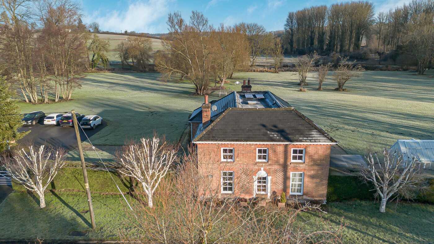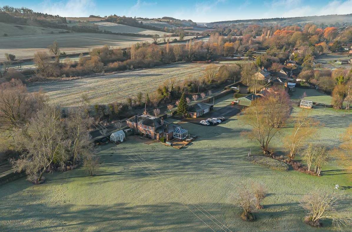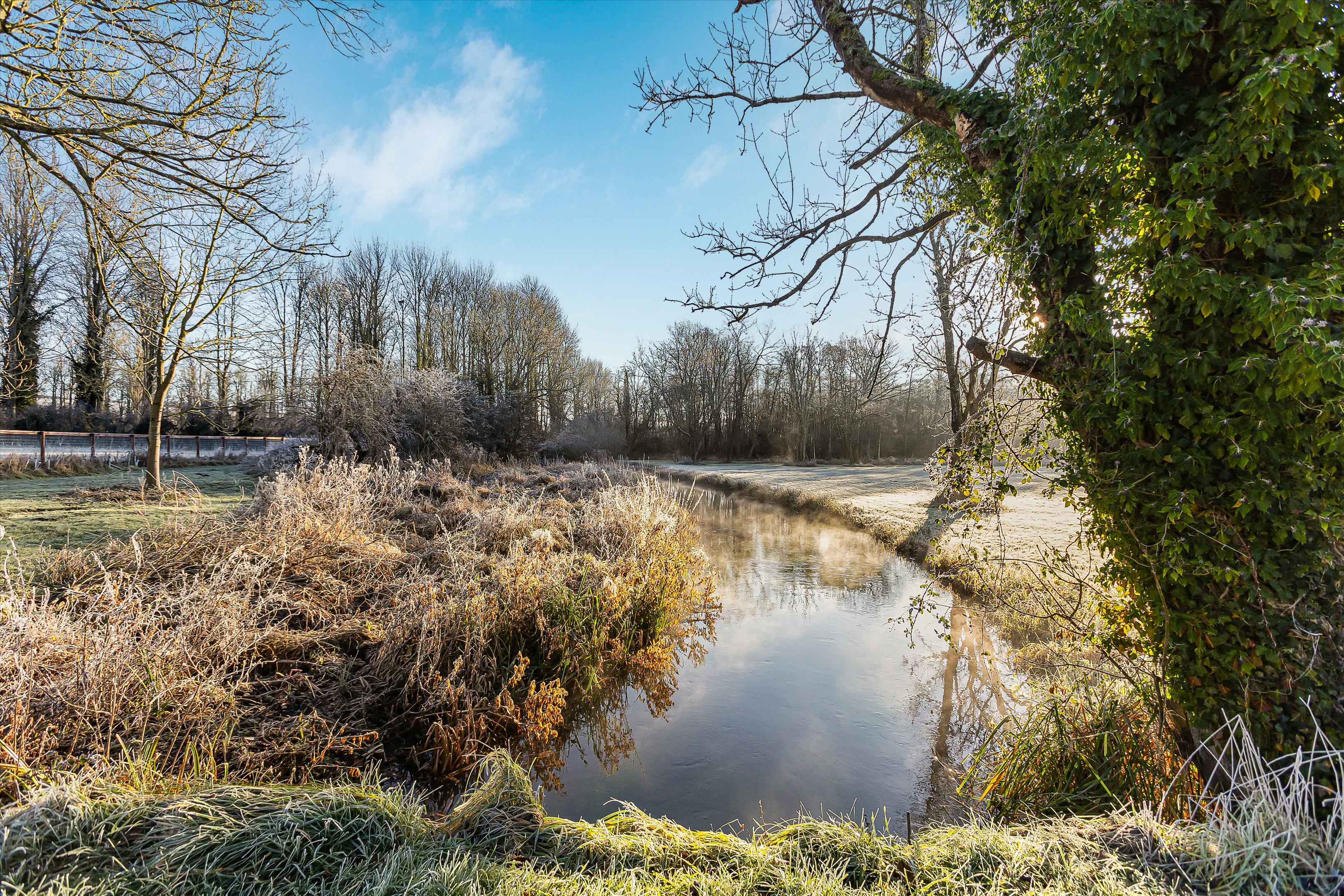 The house is approached via a driveway with plentiful parking and is set within approximately 5.65 acres of gardens and grassland. The outdoor space is predominantly laid to lawn with wide, open areas. A charming tributary of the River Kennet runs along the far boundary-an idyllic backdrop.